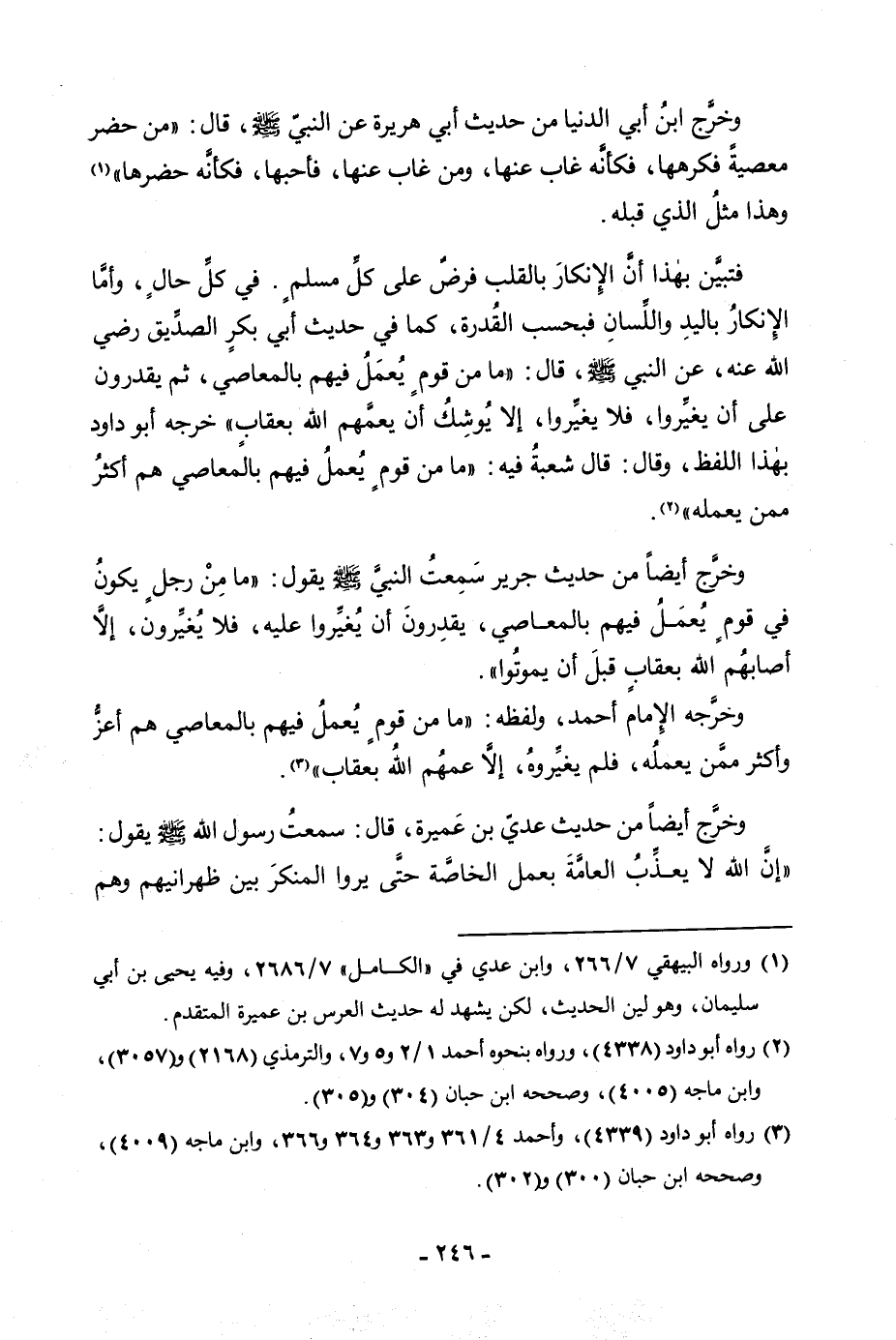 فَتَبَيَّنَ بِهَذَا أَنَّ الْإِنْكَارَ بِالْقَلْبِ فَرْضٌ عَلَى كُلِّ مُسْلِمٍ. فِي كُلِّ حَالٍ، وَأَمَّا الْإِنْكَارُ بِالْيَدِ وَاللِّسَانِ فَبِحَسَبِ الْقُدْرَةِ، كَمَا فِي حَدِيثِ أَبِي بَكْرٍ الصِّدِّيقِ رَضِيَ اللَّهُ عَنْهُ، عَنِ النَّبِيِّ صَلَّى اللَّهُ عَلَيْهِ وَسَلَّمَ، قَالَ: «مَا مِنْ قَوْمٍ يُعْمَلُ فِيهِمْ بِالْمَعَاصِي، ثُمَّ يَقْدِرُونَ عَلَى أَنْ يُغَيِّرُوا فَلَا يُغَيِّرُوا، إِلَّا يُوشِكُ اللَّهُ أَنْ يَعُمَّهُمْ بِعِقَابٍ» خَرَّجَهُ أَبُو دَاوُدَ بِهَذَا اللَّفْظِ، وَقَالَ: قَالَ شُعْبَةُ فِيهِ: «مَا مِنْ قَوْمٍ يُعْمَلُ فِيهِمْ بِالْمَعَاصِي هُمْ أَكْثَرُ مِمَّنْ يَعْمَلُهُ» .
