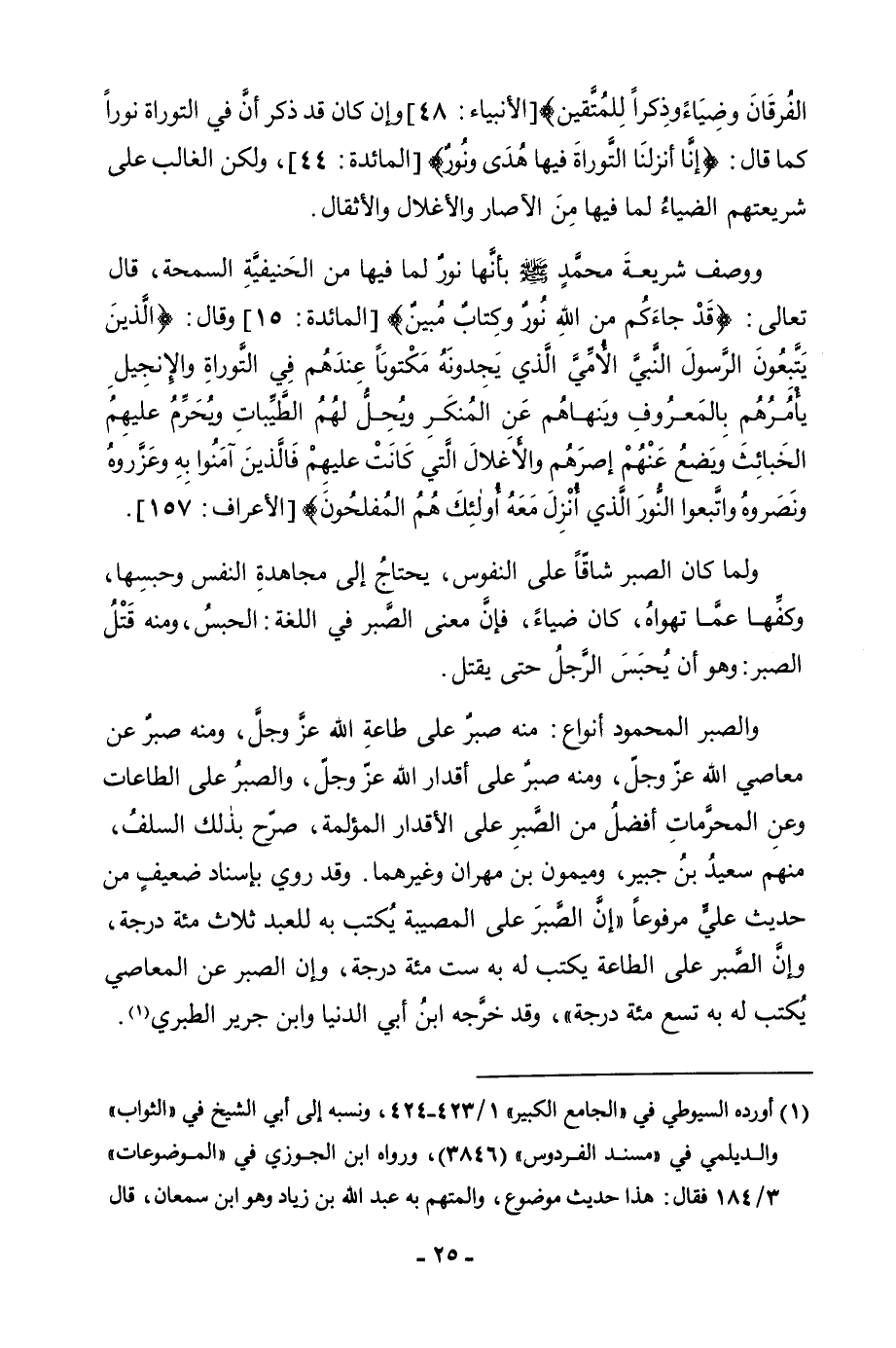 وَإِنْ كَانَ قَدْ ذَكَرَ أَنَّ فِي التَّوْرَاةِ نُورًا كَمَا قَالَ: {إِنَّا أَنْزَلْنَا التَّوْرَاةَ فِيهَا هُدًى وَنُورٌ} [المائدة: 44] [الْمَائِدَةِ: 44] ، وَلَكِنَّ الْغَالِبَ عَلَى شَرِيعَتِهِمِ الضِّيَاءُ لِمَا فِيهَا مِنَ الْآصَارِ وَالْأَغْلَالِ وَالْأَثْقَالِ. وَوَصَفَ شَرِيعَةَ مُحَمَّدٍ صَلَّى اللَّهُ عَلَيْهِ وَسَلَّمَ بِأَنَّهَا نُورٌ لِمَا فِيهَا مِنَ الْحَنِيفِيَّةِ السَّمْحَةِ، قَالَ اللَّهُ تَعَالَى: {قَدْ جَاءَكُمْ مِنَ اللَّهِ نُورٌ وَكِتَابٌ مُبِينٌ} [المائدة: 15] [الْمَائِدَةِ: 15] وَقَالَ: {الَّذِينَ يَتَّبِعُونَ الرَّسُولَ النَّبِيَّ الْأُمِّيَّ الَّذِي يَجِدُونَهُ مَكْتُوبًا عِنْدَهُمْ فِي التَّوْرَاةِ وَالْإِنْجِيلِ يَأْمُرُهُمْ بِالْمَعْرُوفِ وَيَنْهَاهُمْ عَنِ الْمُنْكَرِ وَيُحِلُّ لَهُمُ الطَّيِّبَاتِ وَيُحَرِّمُ عَلَيْهِمُ الْخَبَائِثَ وَيَضَعُ عَنْهُمْ إِصْرَهُمْ وَالْأَغْلَالَ الَّتِي كَانَتْ عَلَيْهِمْ فَالَّذِينَ آمَنُوا بِهِ وَعَزَّرُوهُ وَنَصَرُوهُ وَاتَّبَعُوا النُّورَ الَّذِي أُنْزِلَ مَعَهُ أُولَئِكَ هُمُ الْمُفْلِحُونَ} [الأعراف: 157] [الْأَعْرَافِ: 157] . وَلَمَّا كَانَ الصَّبْرُ شَاقًّا عَلَى النُّفُوسِ، يَحْتَاجُ إِلَى مُجَاهَدَةِ النَّفْسِ وَحَبْسِهَا وَكَفِّهَا عَمَّا تَهْوَاهُ، كَانَ ضِيَاءً، فَإِنَّ مَعْنَى الصَّبْرِ فِي اللُّغَةِ الْحَبْسُ، وَمِنْهُ قَتْلُ الصَّبْرِ: وَهُوَ أَنْ يُحْبَسَ الرَّجُلُ حَتَّى يُقْتَلَ. وَالصَّبْرُ الْمَحْمُودُ أَنْوَاعٌ: مِنْهُ صَبْرٌ عَلَى طَاعَةِ اللَّهِ عَزَّ وَجَلَّ، وَمِنْهُ صَبْرٌ عَنْ مَعَاصِي اللَّهِ عَزَّ وَجَلَّ، وَمِنْهُ صَبْرٌ عَلَى أَقْدَارِ اللَّهِ عَزَّ وَجَلَّ، وَالصَّبْرُ عَلَى الطَّاعَاتِ وَعَنِ الْمُحَرَّمَاتِ أَفْضَلُ مِنَ الصَّبْرِ عَلَى الْأَقْدَارِ الْمُؤْلِمَةِ، صَرَّحَ بِذَلِكَ السَّلَفُ، مِنْهُمْ سَعِيدُ بْنُ جُبَيْرٍ، وَمَيْمُونُ بْنُ مِهْرَانَ وَغَيْرُهُمَا. وَقَدْ رُوِيَ بِإِسْنَادٍ ضَعِيفٍ مِنْ حَدِيثِ عَلِيٍّ مَرْفُوعًا " «إِنَّ الصَّبْرَ عَلَى الْمَعْصِيَةِ يُكْتَبُ بِهِ لِلْعَبْدِ ثَلَاثُمِائَةِ دَرَجَةٍ، وَإِنَّ الصَّبْرَ عَلَى الطَّاعَةِ تُكْتَبُ بِهِ سِتُّمِائَةِ دَرَجَةٍ، وَإِنَّ الصَّبْرَ عَنِ الْمَعَاصِي يُكْتَبُ لَهُ بِهِ تِسْعُمِائَةِ دَرَجَةٍ» "، وَقَدْ خَرَّجَهُ ابْنُ أَبِي الدُّنْيَا وَابْنُ جَرِيرٍ الطَّبَرِيُّ.