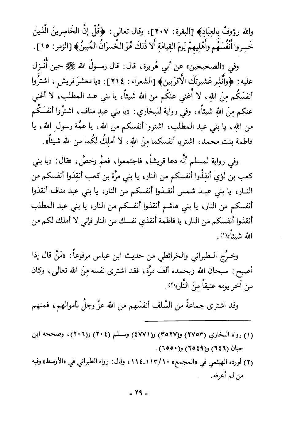 وَقَالَ تَعَالَى: {قُلْ إِنَّ الْخَاسِرِينَ الَّذِينَ خَسِرُوا أَنْفُسَهُمْ وَأَهْلِيهِمْ يَوْمَ الْقِيَامَةِ أَلَا ذَلِكَ هُوَ الْخُسْرَانُ الْمُبِينُ} [الزمر: 15] [الزُّمَرِ: 15] وَفِي " الصَّحِيحَيْنِ " عَنْ أَبِي هُرَيْرَةَ، قَالَ: «قَالَ رَسُولُ اللَّهِ صَلَّى اللَّهُ عَلَيْهِ وَسَلَّمَ حِينَ أُنْزِلَ عَلَيْهِ: {وَأَنْذِرْ عَشِيرَتَكَ الْأَقْرَبِينَ} [الشعراء: 214] [الشُّعَرَاءِ: 214] يَا مَعْشَرَ قُرَيْشٍ، اشْتَرُوا أَنْفُسَكُمْ مِنَ اللَّهِ، لَا أُغْنِي عَنْكُمْ مِنَ اللَّهِ شَيْئًا، يَا بَنِي عَبْدِ الْمُطَّلِبِ، لَا أُغْنِي عَنْكُمْ مِنَ اللَّهِ شَيْئًا» وَفِي رِوَايَةٍ لِلْبُخَارِيِّ: " «يَا بَنِي عَبْدِ مَنَافٍ، اشْتَرُوا أَنْفُسَكُمْ مِنَ اللَّهِ، يَا بَنِي عَبْدِ الْمُطَّلِبِ، اشْتَرُوا أَنْفُسَكُمْ مِنَ اللَّهِ، يَا عَمَّةَ رَسُولِ اللَّهِ، يَا فَاطِمَةَ بِنْتَ مُحَمَّدٍ، اشْتَرِيَا أَنْفُسَكُمَا مِنَ اللَّهِ، لَا أَمْلِكُ لَكُمَا مِنَ اللَّهِ شَيْئًا» ". وَفِي رِوَايَةٍ لِمُسْلِمٍ أَنَّهُ دَعَا قُرَيْشًا فَاجْتَمَعُوا، فَعَمَّ وَخَصَّ، فَقَالَ: «يَا بَنِي كَعْبِ بْنِ لُؤَيٍّ أَنْقِذُوا أَنْفُسَكُمْ مِنَ النَّارِ، يَا بَنِي مُرَّةَ بْنِ كَعْبٍ أَنْقِذُوا أَنْفُسَكُمْ مِنَ النَّارِ، يَا بَنِي عَبْدِ شَمْسٍ أَنْقِذُوا أَنْفُسَكُمْ مِنَ النَّارِ، يَا بَنِي عَبْدِ مَنَافٍ أَنْقِذُوا أَنْفُسَكُمْ مِنَ النَّارِ، يَا بَنِي هَاشِمٍ أَنْقِذُوا أَنْفُسَكُمْ مِنَ النَّارِ، يَا بَنِي عَبْدِ الْمُطَّلِبِ أَنْقِذُوا أَنْفُسَكُمْ مِنَ النَّارِ، يَا فَاطِمَةُ أَنْقِذِي نَفْسَكِ مِنَ النَّارِ فَإِنِّي لَا أَمْلِكُ لَكُمْ مِنَ اللَّهِ شَيْئًا» . وَخَرَّجَ الطَّبَرَانِيُّ وَالْخَرَائِطِيُّ مِنْ حَدِيثِ ابْنِ عَبَّاسٍ مَرْفُوعًا: " «مَنْ قَالَ إِذَا أَصْبَحَ: سُبْحَانَ اللَّهِ وَبِحَمْدِهِ أَلْفَ مَرَّةٍ، فَقَدِ اشْتَرَى نَفْسَهُ مِنَ اللَّهِ تَعَالَى، وَكَانَ مِنْ آخِرِ يَوْمِهِ عَتِيقًا مِنَ النَّارِ» ". وَقَدِ اشْتَرَى جَمَاعَةٌ مِنَ السَّلَفِ أَنْفُسَهُمْ مِنَ اللَّهِ عَزَّ وَجَلَّ بِأَمْوَالِهِمْ، فَمِنْهُمْ