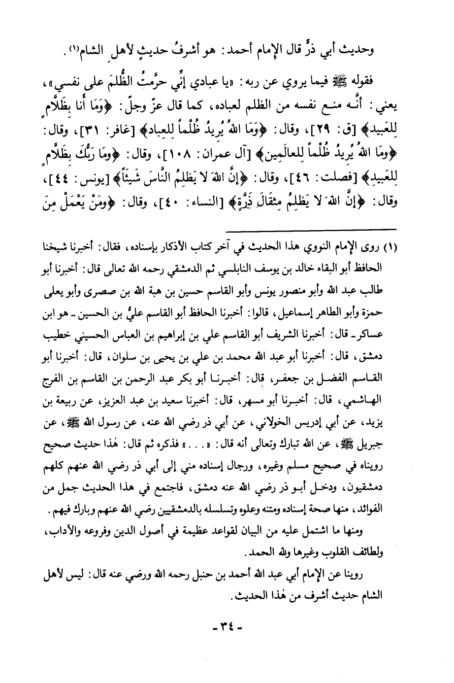 وَحَدِيثُ أَبِي ذَرٍّ قَالَ الْإِمَامُ أَحْمَدُ: هُوَ أَشْرَفُ حَدِيثٍ لِأَهْلِ الشَّامِ. فَقَوْلُهُ صَلَّى اللَّهُ عَلَيْهِ وَسَلَّمَ فِيمَا يَرْوِي عَنْ رَبِّهِ: " «يَا عِبَادِي إِنِّي حَرَّمْتُ الظُّلْمَ عَلَى نَفْسِي» " يَعْنِي: أَنَّهُ مَنَعَ نَفْسَهُ مِنَ الظُّلْمِ لِعِبَادِهِ، كَمَا قَالَ عَزَّ وَجَلَّ: {وَمَا أَنَا بِظَلَّامٍ لِلْعَبِيدِ} [ق: 29] [ق: 29] ، وَقَالَ: {وَمَا اللَّهُ يُرِيدُ ظُلْمًا لِلْعِبَادِ} [غافر: 31] [غَافِرٍ 31] ، وَقَالَ {وَمَا اللَّهُ يُرِيدُ ظُلْمًا لِلْعَالَمِينَ} [آل عمران: 108] [آلِ عِمْرَانَ: 108] ، وَقَالَ {وَمَا رَبُّكَ بِظَلَّامٍ لِلْعَبِيدِ} [فصلت: 46] [فُصِّلَتْ: 46] ، وَقَالَ: {إِنَّ اللَّهَ لَا يَظْلِمُ النَّاسَ شَيْئًا} [يونس: 44] [يُونُسَ: 44] ، وَقَالَ {إِنَّ اللَّهَ لَا يَظْلِمُ مِثْقَالَ ذَرَّةٍ} [النساء: 40] [النِّسَاءِ: 40] ، وَقَالَ: