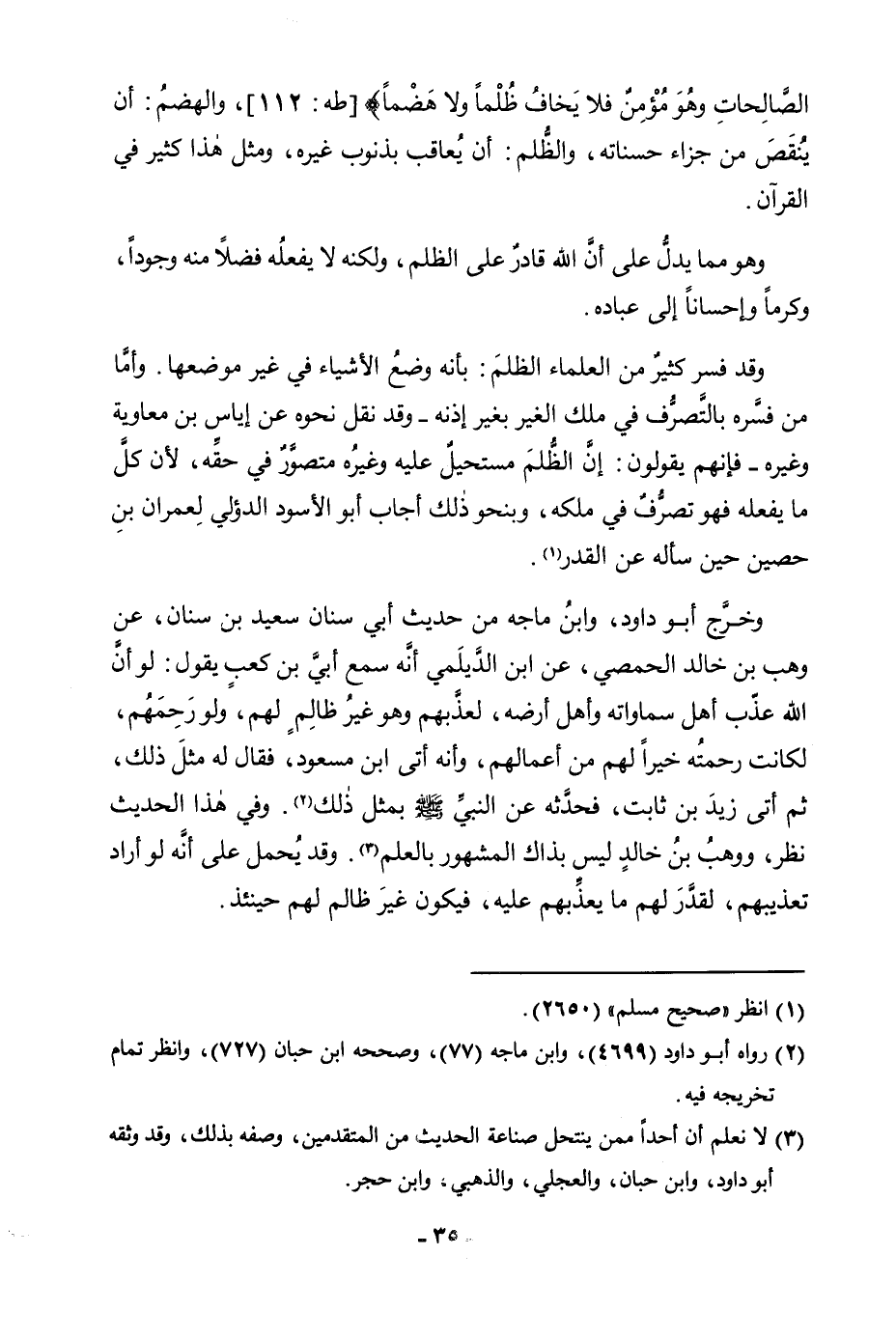 {وَمَنْ يَعْمَلْ مِنَ الصَّالِحَاتِ وَهُوَ مُؤْمِنٌ فَلَا يَخَافُ ظُلْمًا وَلَا هَضْمًا} [طه: 112] [طه: 112] ، وَالْهَضْمُ: أَنْ يُنْقَصَ مِنْ جَزَاءِ حَسَنَاتِهِ، وَالظُّلْمُ: أَنْ يُعَاقَبَ بِذُنُوبِ غَيْرِهِ، وَمِثْلُ هَذَا كَثِيرٌ فِي الْقُرْآنِ. وَهُوَ مِمَّا يَدُلُّ عَلَى أَنَّ اللَّهَ قَادِرٌ عَلَى الظُّلْمِ، وَلَكِنْ لَا يَفْعَلُهُ فَضْلًا مِنْهُ وَجُودًا وَكَرَمًا وَإِحْسَانًا إِلَى عِبَادِهِ. وَقَدْ فَسَّرَ كَثِيرٌ مِنَ الْعُلَمَاءِ الظُّلْمَ بِأَنَّهُ وَضْعُ الْأَشْيَاءِ فِي غَيْرِ مَوْضِعِهَا. وَأَمَّا مَنْ فَسَّرَهُ بِالتَّصَرُّفِ فِي مِلْكِ الْغَيْرِ بِغَيْرِ إِذْنِهِ - وَقَدْ نُقِلَ نَحْوُهُ عَنْ إِيَاسِ بْنِ مُعَاوِيَةَ وَغَيْرِهِ - فَإِنَّهُمْ يَقُولُونَ: إِنَّ الظُّلْمَ مُسْتَحِيلٌ عَلَيْهِ، وَغَيْرُهُ مُتَصَوَّرٌ فِي حَقِّهِ، لِأَنَّ كُلَّ مَا يَفْعَلُهُ فَهُوَ تَصَرُّفٌ فِي مِلْكِهِ، وَبِنَحْوِ ذَلِكَ أَجَابَ أَبُو الْأُسُودِ الدُّؤَلِيُّ لِعِمْرَانَ بْنِ حُصَيْنٍ حِينَ سَأَلَهُ عَنِ الْقَدَرِ. وَخَرَّجَ أَبُو دَاوُدَ، وَابْنُ مَاجَهْ مِنْ حَدِيثِ أَبِي سِنَانٍ سَعِيدِ بْنِ سِنَانٍ، عَنْ وَهْبِ بْنِ خَالِدٍ الْحِمْصِيِّ، «عَنِ ابْنِ الدَّيْلِمِيِّ أَنَّهُ سَمِعَ أُبَيَّ بْنَ كَعْبٍ يَقُولُ: لَوْ أَنَّ اللَّهَ عَذَّبَ أَهْلَ سَمَاوَاتِهِ وَأَهْلَ أَرْضِهِ، لَعَذَّبَهُمْ وَهُوَ غَيْرُ ظَالِمٍ لَهُمْ، وَلَوْ رَحِمَهُمْ، لَكَانَتْ رَحْمَتُهُ خَيْرًا لَهُمْ مِنْ أَعْمَالِهِمْ، وَأَنَّهُ أَتَى ابْنَ مَسْعُودٍ، فَقَالَ لَهُ مِثْلَ ذَلِكَ، ثُمَّ أَتَى زَيْدَ بْنَ ثَابِتٍ، فَحَدَّثَهُ عَنِ النَّبِيِّ صَلَّى اللَّهُ عَلَيْهِ وَسَلَّمَ بِمِثْلِ ذَلِكَ» . وَفِي هَذَا الْحَدِيثِ نَظَرٌ، وَوَهْبُ بْنُ خَالِدٍ لَيْسَ بِذَلِكَ الْمَشْهُورِ بِالْعِلْمِ. وَقَدْ يُحْمَلُ عَلَى أَنَّهُ لَوْ أَرَادَ تَعْذِيبَهُمْ، لَقَدَّرَ لَهُمْ مَا يُعَذِّبُهُمْ عَلَيْهِ، فَيَكُونُ غَيْرَ ظَالِمٍ لَهُمْ حِينَئِذٍ.
