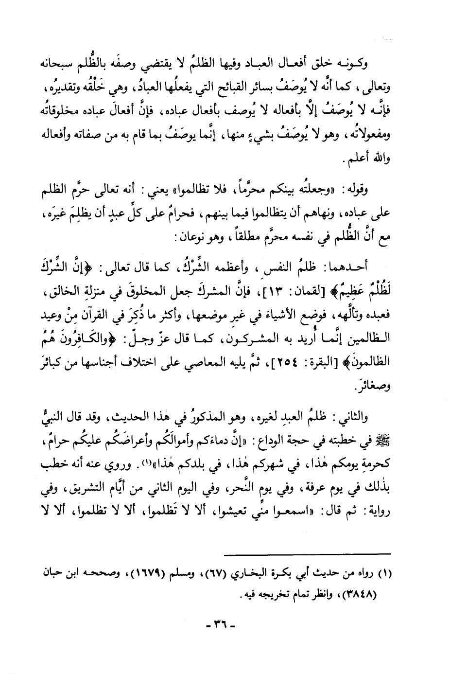 وَكَوْنُهُ خَلَقَ أَفْعَالَ الْعِبَادِ وَفِيهَا الظُّلْمُ لَا يَقْتَضِي وَصْفَهُ بِالظُّلْمِ سُبْحَانَهُ وَتَعَالَى، كَمَا أَنَّهُ لَا يُوصَفُ بِسَائِرِ الْقَبَائِحِ الَّتِي يَفْعَلُهَا الْعِبَادُ، وَهِيَ خَلْقُهُ وَتَقْدِيرُهُ، فَإِنَّهُ لَا يُوصَفُ إِلَّا بِأَفْعَالِهِ لَا يُوصَفُ بِأَفْعَالِ عِبَادِهِ، فَإِنَّ أَفْعَالَ عِبَادِهِ مَخْلُوقَاتُهُ وَمَفْعُولَاتُهُ، وَهُوَ لَا يُوصَفُ بِشَيْءٍ مِنْهَا، إِنَّمَا يُوصَفُ بِمَا قَامَ بِهِ مِنْ صِفَاتِهِ وَأَفْعَالِهِ وَاللَّهُ أَعْلَمُ. وَقَوْلُهُ " «وَجَعَلْتُهُ بَيْنَكُمْ مُحَرَّمًا، فَلَا تَظَالَمُوا» " يَعْنِي: أَنَّهُ تَعَالَى حَرَّمَ الظُّلْمَ عَلَى عِبَادِهِ، وَنَهَاهُمْ أَنْ يَتَظَالَمُوا فِيمَا بَيْنَهُمْ، فَحَرَامٌ عَلَى كُلِّ عَبْدٍ أَنْ يَظْلِمَ غَيْرَهُ، مَعَ أَنَّ الظُّلْمَ فِي نَفْسِهِ مُحَرَّمٌ مُطْلَقًا، وَهُوَ نَوْعَانِ: أَحَدُهُمَا: ظُلْمُ النَّفْسِ، وَأَعْظَمُهُ الشِّرْكُ، كَمَا قَالَ تَعَالَى: {إِنَّ الشِّرْكَ لَظُلْمٌ عَظِيمٌ} [لقمان: 13] [لُقْمَانَ: 13] ، فَإِنَّ الْمُشْرِكَ جَعَلَ الْمَخْلُوقَ فِي مَنْزِلَةِ الْخَالِقِ، فَعَبَدَهُ وَتَأَلَّهَهُ، فَهُوَ وَضْعُ الْأَشْيَاءِ فِي غَيْرِ مَوْضِعِهَا، وَأَكْثَرُ مَا ذُكِرَ فِي الْقُرْآنِ مِنْ وَعِيدِ الظَّالِمِينَ إِنَّمَا أُرِيدَ بِهِ الْمُشْرِكُونَ، كَمَا قَالَ عَزَّ وَجَلَّ: {وَالْكَافِرُونَ هُمُ الظَّالِمُونَ} [البقرة: 254] [الْبَقَرَةِ: 254] ثُمَّ يَلِيهِ الْمَعَاصِي عَلَى اخْتِلَافِ أَجْنَاسِهَا مِنْ كَبَائِرَ وَصَغَائِرَ. وَالثَّانِي: ظُلْمُ الْعَبْدِ لِغَيْرِهِ، وَهُوَ الْمَذْكُورُ فِي هَذَا الْحَدِيثِ، وَقَدْ «قَالَ النَّبِيُّ صَلَّى اللَّهُ عَلَيْهِ وَسَلَّمَ فِي خُطْبَتِهِ فِي حَجَّةِ الْوَدَاعِ: إِنَّ دِمَاءَكُمْ وَأَمْوَالَكُمْ وَأَعْرَاضَكُمْ عَلَيْكُمْ حَرَامٌ، كَحُرْمَةِ يَوْمِكُمْ هَذَا، فِي شَهْرِكُمْ هَذَا، فِي بَلَدِكُمْ هَذَا» . وَرُوِيَ عَنْهُ «أَنَّهُ خَطَبَ بِذَلِكَ فِي يَوْمِ النَّحْرِ مِنْ يَوْمِ عَرَفَةَ، وَفِي الْيَوْمِ الثَّانِي مِنْ أَيَّامِ التَّشْرِيقِ، وَفِي رِوَايَةٍ: ثُمَّ قَالَ: " اسْمَعُوا مِنِّي تَعِيشُوا، أَلَا لَا تَظْلِمُوا، أَلَا لَا تَظْلِمُوا، أَلَا لَا تَظْلِمُوا؛ إِنَّهُ لَا يَحِلُّ مَالُ امْرِئٍ مُسْلِمٍ إِلَّا عَنْ طِيبٍ نَفْسٍ مِنْهُ» ". وَفِي " الصَّحِيحَيْنِ " عَنِ ابْنِ عُمَرَ عَنِ النَّبِيِّ صَلَّى اللَّهُ عَلَيْهِ وَسَلَّمَ أَنَّهُ قَالَ: «إِنَّ الظُّلْمَ ظُلُمَاتٌ يَوْمَ الْقِيَامَةِ» . وَفِيهِمَا عَنْ أَبِي مُوسَى عَنِ «النَّبِيِّ صَلَّى اللَّهُ عَلَيْهِ وَسَلَّمَ، قَالَ: إِنَّ اللَّهَ لَيُمْلِي للظَّالِمِ حَتَّى إِذَا أَخَذَهُ لَمْ يُفْلِتْهُ، ثُمَّ قَرَأَ: {وَكَذَلِكَ أَخْذُ رَبِّكَ إِذَا أَخَذَ الْقُرَى وَهِيَ ظَالِمَةٌ إِنَّ أَخْذَهُ أَلِيمٌ شَدِيدٌ} [هود: 102] » [هُودٍ: 102] . وَفِي " صَحِيحِ الْبُخَارِيِّ " عَنْ أَبِي هُرَيْرَةَ، عَنِ النَّبِيِّ صَلَّى اللَّهُ عَلَيْهِ وَسَلَّمَ قَالَ: «مَنْ كَانَتْ عِنْدَهُ مَظْلَمَةٌ لِأَخِيهِ، فَلْيَتَحَلَّلْهُ مِنْهَا، فَإِنَّهُ لَيْسَ ثَمَّ دِينَارٌ وَلَا دِرْهَمٌ مِنْ قَبْلِ أَنْ يُؤْخَذَ لِأَخِيهِ مِنْ حَسَنَاتِهِ، فَإِنْ لَمْ يَكُنْ لَهُ حَسَنَاتٌ أُخِذَ مِنْ سَيِّئَاتِ أَخِيهِ فَطُرِحَتْ عَلَيْهِ» .