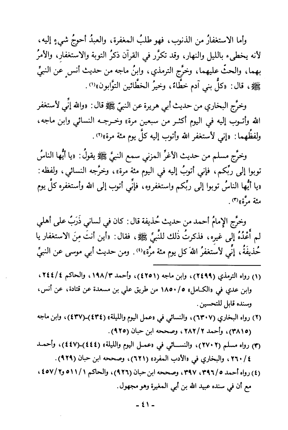 وَأَمَّا الِاسْتِغْفَارُ مِنَ الذُّنُوبِ، فَهُوَ طَلَبُ الْمَغْفِرَةِ، وَالْعَبْدُ أَحْوَجُ شَيْءٍ إِلَيْهِ، لِأَنَّهُ يُخْطِئُ بِاللَّيْلِ وَالنَّهَارِ، وَقَدْ تَكَرَّرَ فِي الْقُرْآنِ ذِكْرُ التَّوْبَةِ وَالِاسْتِغْفَارِ، وَالْأَمْرُ بِهِمَا، وَالْحَثُّ عَلَيْهِمَا، وَخَرَّجَ التِّرْمِذِيُّ، وَابْنُ مَاجَهْ مِنْ حَدِيثِ أَنَسٍ عَنِ النَّبِيِّ صَلَّى اللَّهُ عَلَيْهِ وَسَلَّمَ، قَالَ: «كُلُّ بَنِي آدَمَ خَطَّاءٌ، وَخَيْرُ الْخَطَّائِينَ التَّوَّابُونَ» . وَخَرَّجَ الْبُخَارِيُّ مِنْ حَدِيثِ أَبِي هُرَيْرَةَ عَنِ النَّبِيِّ صَلَّى اللَّهُ عَلَيْهِ وَسَلَّمَ قَالَ: «وَاللَّهِ إِنِّي لَأَسْتَغْفِرُ اللَّهَ وَأَتُوبُ إِلَيْهِ كُلَّ يَوْمٍ سَبْعِينَ مَرَّةً» وَخَرَّجَهُ النَّسَائِيُّ، وَلَفْظُهُ «إِنِّي لَأَسْتَغْفِرُ اللَّهَ وَأَتُوبُ إِلَيْهِ كُلَّ يَوْمٍ مِائَةَ مَرَّةٍ» . وَخَرَّجَ مُسْلِمٌ مِنْ حَدِيثِ الْأَغَرِّ الْمُزَنِيِّ سَمِعَ النَّبِيَّ صَلَّى اللَّهُ عَلَيْهِ وَسَلَّمَ يَقُولُ: «يَا أَيُّهَا النَّاسُ تُوبُوا إِلَى رَبِّكُمْ، فَإِنِّي أَتُوبُ إِلَيْهِ فِي الْيَوْمِ مِائَةَ مَرَّةٍ» وَخَرَّجَهُ النَّسَائِيُّ وَلَفْظُهُ: «يَا أَيُّهَا النَّاسُ تُوبُوا إِلَى رَبِّكُمْ وَاسْتَغْفِرُوهُ، فَإِنِّي أَتُوبُ إِلَى اللَّهِ وَأَسْتَغْفِرُهُ كُلَّ يَوْمٍ مِائَةَ مَرَّةٍ» . وَخَرَّجَ الْإِمَامُ أَحْمَدُ مِنْ «حَدِيثِ حُذَيْفَةَ قَالَ: كَانَ فِي لِسَانِي ذَرَبٌ عَلَى أَهْلِي لَمْ أَعْدُهُ إِلَى غَيْرِهِ، فَذَكَرْتُ ذَلِكَ لِلنَّبِيِّ صَلَّى اللَّهُ عَلَيْهِ وَسَلَّمَ، فَقَالَ: أَيْنَ أَنْتَ مِنَ الِاسْتِغْفَارِ يَا حُذَيْفَةُ، إِنِّي لَأَسْتَغْفِرُ اللَّهَ كُلَّ يَوْمٍ مِائَةَ مَرَّةٍ» . وَمِنْ حَدِيثِ أَبِي مُوسَى عَنِ النَّبِيِّ