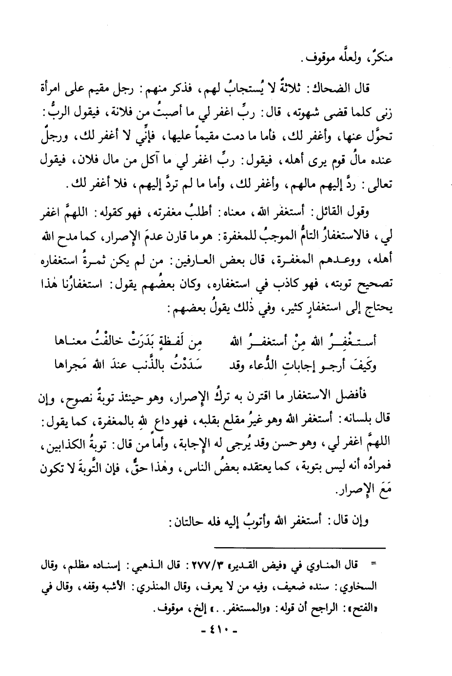 مُنْكَرٌ، وَلَعَلَّهُ مَوْقُوفٌ. قَالَ الضَّحَّاكُ: ثَلَاثَةٌ لَا يُسْتَجَابُ لَهُمْ، فَذَكَرَ مِنْهُمْ رَجُلٌ مُقِيمٌ عَلَى امْرَأَةٍ زِنًا قَضَى مِنْهَا شَهْوَتَهُ، قَالَ: رَبِّ اغْفِرْ لِي مَا أَصَبْتُ مِنْ فُلَانَةٍ، فَيَقُولُ الرَّبُّ: تَحَوَّلْ عَنْهَا، وَأَغْفِرُ لَكَ، فَأَمَّا مَا دُمْتَ مُقِيمًا عَلَيْهَا، فَإِنِّي لَا أَغْفِرُ لَكَ، وَرَجُلًا عِنْدَهُ مَالُ قَوْمٍ يَرَى أَهْلَهُ، فَيَقُولُ: رَبِّ اغْفِرْ لِي مَا آكُلُ مِنْ فُلَانٍ، فَيَقُولُ تَعَالَى: رُدَّ إِلَيْهِمْ مَالَهُمْ، وَأَغْفِرُ لَكَ، وَأَمَّا مَا لَمْ تَرُدَّ إِلَيْهِمْ، فَلَا أَغْفِرُ لَكَ. وَقَوْلُ الْقَائِلِ: أَسْتَغْفِرُ اللَّهَ، مَعْنَاهُ: أَطْلُبُ مَغْفِرَتَهُ، فَهُوَ كَقَوْلِهِ: اللَّهُمَّ اغْفِرْ لِي، فَالِاسْتِغْفَارُ التَّامُّ الْمُوجِبُ لِلْمَغْفِرَةِ: هُوَ مَا قَارَنَ عَدَمَ الْإِصْرَارِ، كَمَا مَدَحَ اللَّهُ أَهْلَهُ، وَوَعَدَهُمْ بِالْمَغْفِرَةِ، قَالَ بَعْضُ الْعَارِفِينَ: مَنْ لَمْ يَكُنْ ثَمَرَةُ اسْتِغْفَارِهِ تَصْحِيحَ تَوْبَتِهِ، فَهُوَ كَاذِبٌ فِي اسْتِغْفَارِهِ، وَكَانَ بَعْضُهُمْ يَقُولُ: اسْتِغْفَارُنَا هَذَا يَحْتَاجُ إِلَى اسْتِغْفَارٍ كَثِيرٍ، وَفِي ذَلِكَ يَقُولُ بَعْضُهُمْ: