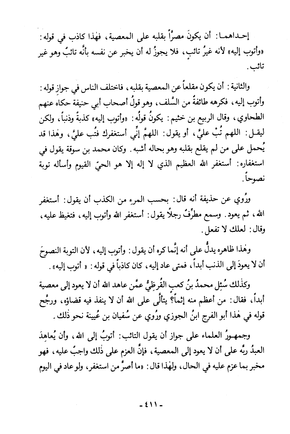 إِحْدَاهُمَا: أَنْ يَكُونَ مُصِرًّا بِقَلْبِهِ عَلَى الْمَعْصِيَةِ، فَهَذَا كَاذِبٌ فِي قَوْلِهِ: " وَأَتُوبُ إِلَيْهِ " لِأَنَّهُ غَيْرُ تَائِبٍ، فَلَا يَجُوزُ لَهُ أَنْ يُخْبِرَ عَنْ نَفْسِهِ بِأَنَّهُ تَائِبٌ وَهُوَ غَيْرُ تَائِبٍ. وَالثَّانِيَةُ: أَنْ يَكُونَ مُقْلِعًا عَنِ الْمَعْصِيَةِ بِقَلْبِهِ، فَاخْتَلَفَ النَّاسُ فِي جَوَازِ قَوْلِهِ: وَأَتُوبُ إِلَيْهِ، فَكَرِهَهُ طَائِفَةٌ مِنَ السَّلَفِ، وَهُوَ قَوْلُ أَصْحَابِ أَبِي حَنِيفَةَ حَكَاهُ عَنْهُمُ الطَّحَاوِيُّ، وَقَالَ الرَّبِيعُ بْنُ خُثَيْمٍ: يَكُونُ قَوْلُهُ: " وَأَتُوبُ إِلَيْهِ " كِذْبَةً وَذَنْبًا، وَلَكِنْ لِيَقُلْ: اللَّهُمَّ تُبْ عَلَيَّ، أَوْ يَقُلْ: اللَّهُمَّ إِنِّي أَسْتَغْفِرُكَ فَتُبْ عَلَيَّ. وَهَذَا قَدْ يُحْمَلُ عَلَى مَنْ لَمْ يُقْلِعْ بِقَلْبِهِ وَهُوَ بِحَالِهِ أَشْبَهُ. وَكَانَ مُحَمَّدُ بْنُ سُوقَةَ يَقُولُ فِي اسْتِغْفَارِهِ أَسْتَغْفِرُ اللَّهَ الْعَظِيمَ الَّذِي لَا إِلَهَ إِلَّا هُوَ الْحَيُّ الْقَيُّومُ وَأَسْأَلُهُ تَوْبَةً نَصُوحًا. وَرُوِيَ عَنْ حُذَيْفَةَ أَنَّهُ قَالَ: بِحَسْبِ الْمَرْءِ مِنَ الْكَذِبِ أَنْ يَقُولَ: أَسْتَغْفِرُ اللَّهَ، ثُمَّ يَعُودُ. وَسَمِعَ مُطَرِّفٌ رَجُلًا يَقُولُ: أَسْتَغْفِرُ اللَّهَ وَأَتُوبُ إِلَيْهِ، فَتَغَيَّظَ عَلَيْهِ، وَقَالَ: لَعَلَّكَ لَا تَفْعَلْ. وَهَذَا ظَاهِرُهُ يَدُلُّ عَلَى أَنَّهُ إِنَّمَا كَرِهَ أَنْ يَقُولَ: وَأَتُوبُ إِلَيْهِ، لِأَنَّ التَّوْبَةَ النَّصُوحَ أَنْ لَا يَعُودَ إِلَى الذَّنْبِ أَبَدًا، فَمَتَى عَادَ إِلَيْهِ، كَانَ كَاذِبًا فِي قَوْلِهِ: " وَأَتُوبُ إِلَيْهِ ". وَكَذَلِكَ سُئِلَ مُحَمَّدُ بْنُ كَعْبٍ الْقُرَظِيُّ عَمَّنْ عَاهَدَ اللَّهَ أَنْ لَا يَعُودَ إِلَى مَعْصِيَةٍ أَبَدًا، فَقَالَ: مَنْ أَعْظَمُ مِنْهُ إِثْمًا؟ يَتَأَلَّى عَلَى اللَّهِ أَنْ لَا يَنْفُذَ فِيهِ قَضَاؤُهُ، وَرَجَّحَ قَوْلَهُ فِي هَذَا أَبُو الْفَرَجِ بْنُ الْجَوْزِيِّ وَرُوِيَ عَنْ سُفْيَانَ بْنِ عُيَيْنَةَ نَحْوُ ذَلِكَ. وَجُمْهُورُ الْعُلَمَاءِ عَلَى جَوَازِ أَنْ يَقُولَ التَّائِبُ: أَتُوبُ إِلَى اللَّهِ، وَأَنْ يُعَاهِدَ الْعَبْدُ رَبَّهُ عَلَى أَنْ لَا يَعُودَ إِلَى الْمَعْصِيَةِ، فَإِنَّ الْعَزْمَ عَلَى ذَلِكَ وَاجِبٌ عَلَيْهِ، فَهُوَ مُخْبِرٌ بِمَا عَزَمَ عَلَيْهِ فِي الْحَالِ، وَلِهَذَا قَالَ: " «مَا أَصَرَّ مَنِ اسْتَغْفَرَ، وَلَوْ عَادَ فِي الْيَوْمِ