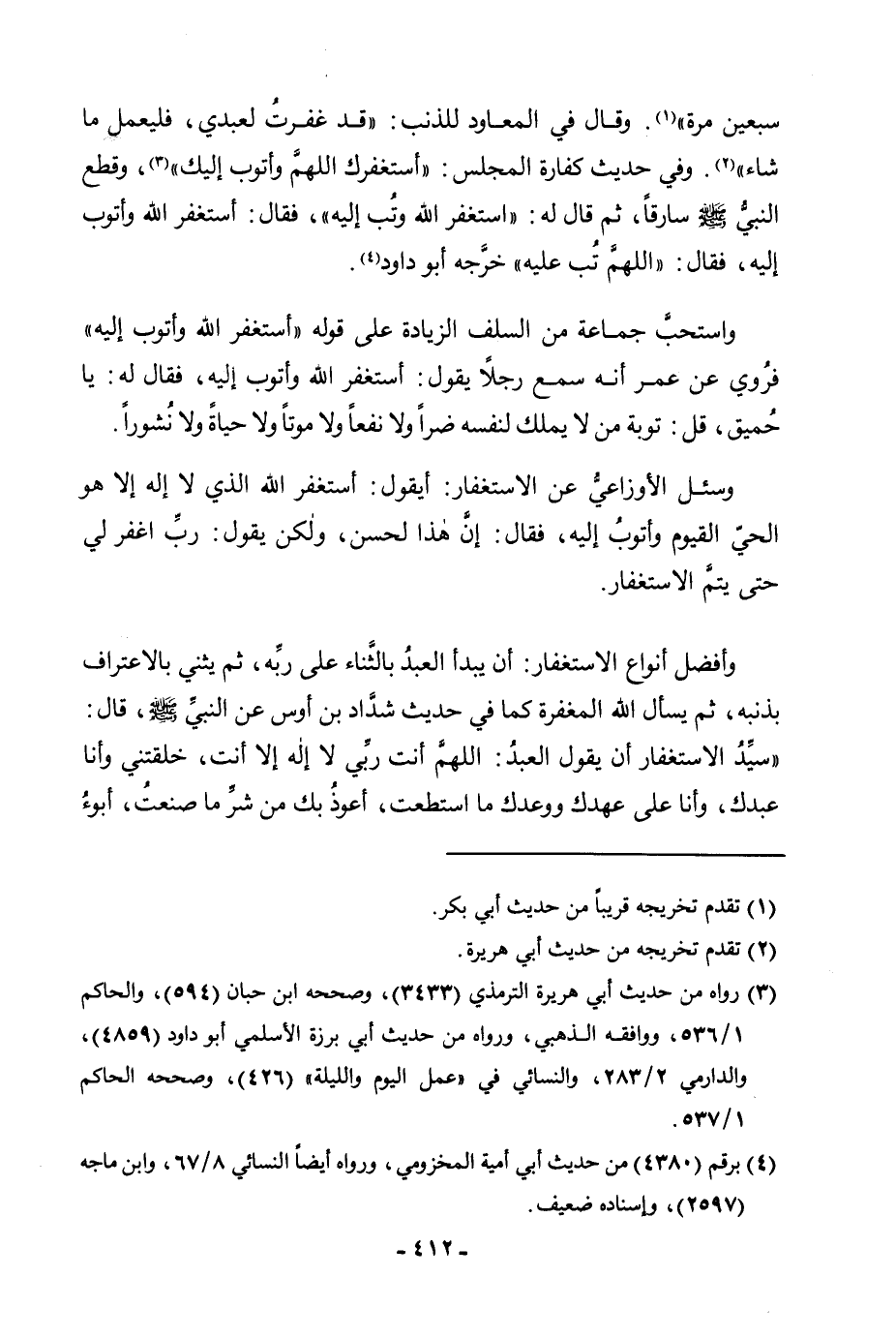 سَبْعِينَ مَرَّةً» ". وَقَالَ فِي الْمُعَاوِدِ لِلذَّنْبِ: «قَدْ غَفَرْتُ لِعَبْدِي فَلْيَعْمَلْ مَا شَاءُ» . وَفِي حَدِيثِ كَفَّارَةِ الْمَجْلِسِ: «أَسْتَغْفِرُكَ اللَّهُمَّ وَأَتُوبُ إِلَيْكَ» ، «وَقَطَعَ النَّبِيُّ صَلَّى اللَّهُ عَلَيْهِ وَسَلَّمَ سَارِقًا، ثُمَّ قَالَ لَهُ: اسْتَغْفِرِ اللَّهَ وَتُبْ إِلَيْهِ فَقَالَ: أَسْتَغْفِرُ اللَّهَ وَأَتُوبُ إِلَيْهِ، فَقَالَ: اللَّهُمَّ تُبْ عَلَيْهِ» خَرَّجَهُ أَبُو دَاوُدَ. وَاسْتَحَبَّ جَمَاعَةٌ مِنَ السَّلَفِ الزِّيَادَةَ عَلَى قَوْلِهِ أَسْتَغْفِرُ اللَّهَ وَأَتُوبُ إِلَيْهِ فَرُوِيَ عَنْ عُمَرَ أَنَّهُ سَمِعَ رَجُلًا يَقُولُ: أَسْتَغْفِرُ اللَّهَ وَأَتُوبُ إِلَيْهِ، فَقَالَ لَهُ: يَا حُمَيْقُ، قُلْ: تَوْبَةَ مَنْ لَا يَمْلِكُ لِنَفْسِهِ ضَرًّا وَلَا نَفْعًا وَلَا مَوْتًا وَلَا حَيَاةً وَلَا نُشُورًا. وَسُئِلَ الْأَوْزَاعِيُّ عَنِ الِاسْتِغْفَارِ: أَيَقُولُ: أَسْتَغْفِرُ اللَّهَ الَّذِي لَا إِلَهَ إِلَّا هُوَ الْحَيُّ الْقَيُّومُ وَأَتُوبُ إِلَيْهِ، فَقَالَ: إِنَّ هَذَا لَحَسَنٌ، وَلَكِنْ يَقُولُ: رَبِّ اغْفِرْ لِي حَتَّى يَتِمَّ الِاسْتِغْفَارُ. وَأَفْضَلُ أَنْوَاعِ الِاسْتِغْفَارِ: أَنْ يَبْدَأَ الْعَبْدُ بِالثَّنَاءِ عَلَى رَبِّهِ، ثُمَّ يُثَنِّيَ بِالِاعْتِرَافِ بِذَنْبِهِ، ثُمَّ يَسْأَلَ اللَّهَ الْمَغْفِرَةَ كَمَا فِي حَدِيثِ شَدَّادِ بْنِ أَوْسٍ عَنِ النَّبِيِّ صَلَّى اللَّهُ عَلَيْهِ وَسَلَّمَ، قَالَ: «سَيِّدُ الِاسْتِغْفَارِ أَنْ يَقُولَ الْعَبْدُ: اللَّهُمَّ أَنْتَ رَبِّي لَا إِلَهَ إِلَّا أَنْتَ، خَلَقْتَنِي وَأَنَا عَبْدُكَ، وَأَنَا عَلَى عَهْدِكَ وَوَعْدِكَ مَا اسْتَطَعْتُ، أَعُوذُ بِكَ مِنْ شَرِّ مَا صَنَعْتُ، أَبُوءُ