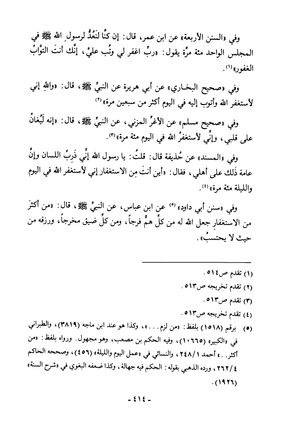 وَفِي " السُّنَنِ الْأَرْبَعَةِ " عَنِ ابْنِ عُمَرَ، قَالَ: «إِنْ كُنَّا لَنَعُدُّ لِرَسُولِ اللَّهِ صَلَّى اللَّهُ عَلَيْهِ وَسَلَّمَ فِي الْمَجْلِسِ الْوَاحِدِ مِائَةَ مَرَّةٍ يَقُولُ: رَبِّ اغْفِرْ لِي وَتُبْ عَلَيَّ إِنَّكَ أَنْتَ التَّوَّابُ الْغَفُورُ» . وَفِي " صَحِيحِ الْبُخَارِيِّ " عَنْ أَبِي هُرَيْرَةَ عَنِ النَّبِيِّ صَلَّى اللَّهُ عَلَيْهِ وَسَلَّمَ، قَالَ: «وَاللَّهِ إِنِّي لَأَسْتَغْفِرُ اللَّهَ وَأَتُوبُ إِلَيْهِ فِي الْيَوْمِ أَكْثَرَ مِنْ سَبْعِينَ مَرَّةً» . وَفِي " صَحِيحِ مُسْلِمٍ " عَنِ الْأَغَرِّ الْمُزَنِيِّ، عَنِ النَّبِيِّ صَلَّى اللَّهُ عَلَيْهِ وَسَلَّمَ، قَالَ: «إِنَّهُ لَيُغَانُ عَلَى قَلْبِي، وَإِنِّي لَأَسْتَغْفِرُ اللَّهَ فِي الْيَوْمِ مِائَةَ مَرَّةٍ» . وَفِي " الْمُسْنَدِ " «عَنْ حُذَيْفَةَ قَالَ: قُلْتُ: يَا رَسُولَ اللَّهِ، إِنِّي ذَرِبُ اللِّسَانِ وَإِنَّ عَامَّةَ ذَلِكَ عَلَى أَهْلِي، فَقَالَ: أَيْنَ أَنْتَ مِنَ الِاسْتِغْفَارِ إِنِّي لَأَسْتَغْفِرُ اللَّهَ فِي الْيَوْمِ وَاللَّيْلَةِ مِائَةَ مَرَّةٍ» . وَفِي " سُنَنِ أَبِي دَاوُدَ " عَنِ ابْنِ عَبَّاسٍ، عَنِ النَّبِيِّ صَلَّى اللَّهُ عَلَيْهِ وَسَلَّمَ، قَالَ: «مَنْ أَكْثَرَ مِنَ الِاسْتِغْفَارِ جَعَلَ اللَّهُ لَهُ مِنْ كُلِّ هَمٍّ فَرَجًا، وَمِنْ كُلِّ ضِيقٍ مَخْرَجًا، وَرَزَقَهُ مِنْ حَيْثُ لَا يَحْتَسِبُ» .