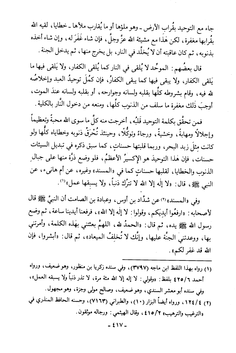جَاءَ مَعَ التَّوْحِيدِ بِقُرَابِ الْأَرْضِ - وَهُوَ مِلْؤُهَا أَوْ مَا يُقَارِبُ مِلْأَهَا - خَطَايَا، لَقِيَهُ اللَّهُ بِقُرَابِهَا مَغْفِرَةً، لَكِنْ هَذَا مَعَ مَشِيئَةِ اللَّهِ عَزَّ وَجَلَّ، فَإِنْ شَاءَ غَفَرَ لَهُ، وَإِنْ شَاءَ أَخَذَهُ بِذُنُوبِهِ، ثُمَّ كَانَ عَاقِبَتُهُ أَنْ لَا يُخَلَّدَ فِي النَّارِ، بَلْ يَخْرُجُ مِنْهَا، ثُمَّ يَدْخُلُ الْجَنَّةَ. قَالَ بَعْضُهُمْ: الْمُوَحِّدُ لَا يُلْقَى فِي النَّارِ كَمَا يُلْقَى الْكُفَّارُ، وَلَا يَلْقَى فِيهَا مَا يَلْقَى الْكُفَّارُ، وَلَا يَبْقَى فِيهَا كَمَا يَبْقَى الْكُفَّارُ، فَإِنْ كَمُلَ تَوْحِيدُ الْعَبْدِ وَإِخْلَاصُهُ لِلَّهِ فِيهِ، وَقَامَ بِشُرُوطِهِ كُلِّهَا بِقَلْبِهِ وَلِسَانِهِ وَجَوَارِحِهِ، أَوْ بِقَلْبِهِ وَلِسَانِهِ عِنْدَ الْمَوْتِ، أَوْجَبَ ذَلِكَ مَغْفِرَةَ مَا سَلَفَ مِنَ الذُّنُوبِ كُلِّهَا، وَمَنَعَهُ مِنْ دُخُولِ النَّارِ بِالْكُلِّيَّةِ. فَمَنْ تَحَقَّقَ بِكَلِمَةِ التَّوْحِيدِ قَلْبُهُ، أَخْرَجَتْ مِنْهُ كُلَّ مَا سِوَى اللَّهِ مَحَبَّةً وَتَعْظِيمًا وَإِجْلَالًا وَمَهَابَةً، وَخَشْيَةً، وَرَجَاءً وَتَوَكُّلًا، وَحِينَئِذٍ تُحْرَقُ ذُنُوبُهُ وَخَطَايَاهُ كُلُّهَا وَلَوْ كَانَتْ مِثْلَ زَبَدِ الْبَحْرِ، وَرُبَّمَا قَلَبَتْهَا حَسَنَاتٍ، كَمَا سَبَقَ ذِكْرُهُ فِي تَبْدِيلِ السَّيِّئَاتِ حَسَنَاتٍ، فَإِنَّ هَذَا التَّوْحِيدَ هُوَ الْإِكْسِيرُ الْأَعْظَمُ، فَلَوْ وُضِعَ مِنْهُ ذَرَّةً عَلَى جِبَالِ الذُّنُوبِ وَالْخَطَايَا، لَقَلَبَهَا حَسَنَاتٍ كَمَا فِي " الْمُسْنَدِ " وَغَيْرِهِ، عَنْ أُمِّ هَانِئٍ، عَنِ النَّبِيِّ صَلَّى اللَّهُ عَلَيْهِ وَسَلَّمَ، قَالَ: «لَا إِلَهَ إِلَّا اللَّهُ لَا تَتْرُكُ ذَنْبًا، وَلَا يَسْبِقُهَا عَمَلٌ» . وَفِي " الْمُسْنَدِ " عَنْ شَدَّادِ بْنِ أَوْسٍ، وَعُبَادَةَ بْنِ الصَّامِتِ «أَنَّ النَّبِيَّ صَلَّى اللَّهُ عَلَيْهِ وَسَلَّمَ قَالَ لِأَصْحَابِهِ: ارْفَعُوا أَيْدِيَكُمْ، وَقُولُوا: لَا إِلَهَ إِلَّا اللَّهُ، فَرَفَعْنَا أَيْدِيَنَا سَاعَةً، ثُمَّ وَضَعَ رَسُولُ اللَّهِ صَلَّى اللَّهُ عَلَيْهِ وَسَلَّمَ يَدَهُ، ثُمَّ قَالَ: الْحَمْدُ لِلَّهِ، اللَّهُمَّ بَعَثْتَنِي بِهَذِهِ الْكَلِمَةِ، وَأَمَرْتَنِي بِهَا، وَوَعَدْتَنِي الْجَنَّةَ عَلَيْهَا، وَإِنَّكَ لَا تُخْلِفُ الْمِيعَادَ، ثُمَّ قَالَ: أَبْشِرُوا، فَإِنَّ اللَّهَ قَدْ غَفَرَ لَكُمْ» .
