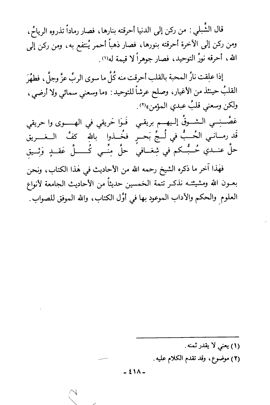 قَالَ الشِّبْلِيُّ: مَنْ رَكَنَ إِلَى الدُّنْيَا أَحْرَقَتْهُ بِنَارِهَا، فَصَارَ رَمَادًا تَذْرُوهُ الرِّيَاحُ، وَمَنْ رَكَنَ إِلَى الْآخِرَةِ أَحْرَقَتْهُ بِنُورِهَا، فَصَارَ ذَهَبًا أَحْمَرَ يُنْتَفَعُ بِهِ، وَمَنْ رَكَنَ إِلَى اللَّهِ، أَحْرَقَهُ نُورُ التَّوْحِيدِ، فَصَارَ جَوْهَرًا لَا قِيمَةَ لَهُ. إِذَا عَلِقَتْ نَارُ الْمَحَبَّةِ بِالْقَلْبِ أَحْرَقَتْ مِنْهُ كُلَّ شَيْءٍ مَا سِوَى الرَّبِّ عَزَّ وَجَلَّ، فَطَهُرَ الْقَلْبُ حِينَئِذٍ مِنَ الْأَغْيَارِ، وَصَلُحَ عَرْشًا لِلتَّوْحِيدِ: «مَا وَسِعَنِي سَمَائِي وَلَا أَرْضِي، وَلَكِنْ وَسِعَنِي قَلْبُ عَبْدِي الْمُؤْمِنِ» .
