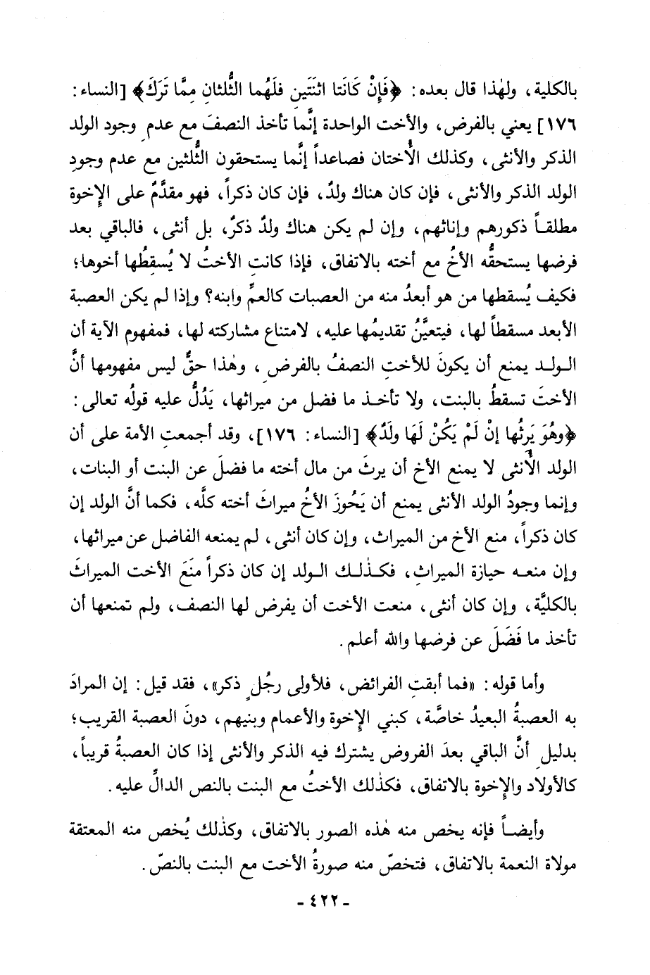 بِالْكُلِّيَّةِ، وَلِهَذَا قَالَ بَعْدَهُ: {فَإِنْ كَانَتَا اثْنَتَيْنِ فَلَهُمَا الثُّلُثَانِ مِمَّا تَرَكَ} [النساء: 176] [النِّسَاءِ: 176] يَعْنِي بِالْفَرْضِ، وَالْأُخْتُ الْوَاحِدَةُ إِنَّمَا تَأْخُذُ النِّصْفَ مَعَ عَدَمِ وُجُودِ الْوَلَدِ الذَّكَرِ وَالْأُنْثَى، فَكَذَلِكَ الْأُخْتَانِ فَصَاعِدًا إِنَّمَا يَسْتَحِقُّونَ الثُّلُثَيْنِ مَعَ عَدَمِ وُجُودِ الْوَلَدِ الذَّكَرِ وَالْأُنْثَى، فَإِنْ كَانَ هُنَاكَ وَلَدٌ، فَإِنْ كَانَ ذَكَرًا، فَهُوَ مُقَدَّمٌ عَلَى الْإِخْوَةِ مُطْلَقًا ذُكُورِهِمْ وَإِنَاثِهِمْ، وَإِنْ لَمْ يَكُنْ هُنَاكَ وَلَدٌ ذَكَرٌ، بَلْ أُنْثَى فَالْبَاقِي بَعْدَ فَرْضِهَا يَسْتَحِقُّهُ الْأَخُ مَعَ أُخْتِهِ بِالِاتِّفَاقِ، فَإِذَا كَانَتِ الْأُخْتُ لَا يُسْقِطُهَا أَخُوهَا؛ فَكَيْفَ يُسْقِطُهَا مَنْ هُوَ أَبْعَدُ مِنْهُ مِنَ الْعَصَبَاتِ كَالْعَمِّ وَابْنِهِ؟ وَإِذَا لَمْ يَكُنِ الْعَصَبَةُ الْأَبْعَدُ مُسْقِطًا لَهَا، فَيَتَعَيَّنُ تَقْدِيمُهَا عَلَيْهِ، لِامْتِنَاعِ مُشَارَكَتِهِ لَهَا، فَمَفْهُومُ الْآيَةِ أَنَّ الْوَلَدَ يَمْنَعُ أَنْ يَكُونَ لِلْأُخْتِ النِّصْفُ بِالْفَرْضِ، وَهَذَا حَقٌّ لَيْسَ مَفْهُومًا أَنَّ الْأُخْتَ تَسْقَطُ بِالْبِنْتِ، وَلَا تَأْخُذُ مَا فَضُلَ مِنْ مِيرَاثِهَا، يَدُلُّ عَلَيْهِ قَوْلُهُ تَعَالَى: {وَهُوَ يَرِثُهَا إِنْ لَمْ يَكُنْ لَهَا وَلَدٌ} [النساء: 176] [النِّسَاءِ: 176] ، وَقَدْ أَجْمَعْتِ الْأُمَّةُ عَلَى أَنَّ الْوَلَدَ الْأُنْثَى لَا يَمْنَعُ الْأَخَ أَنْ يَرِثَ مِنْ مَالِ أُخْتِهِ مَا فَضُلَ عَنِ الْبِنْتِ أَوِ الْبَنَاتِ، وَإِنَّمَا وُجُودُ الْوَلَدِ الْأُنْثَى يَمْنَعُ أَنْ يَحُوزَ الْأَخُ مِيرَاثَ أُخْتِهِ كُلِّهِ، فَكَمَا أَنَّ الْوَلَدَ إِنْ كَانَ ذَكَرًا، مَنَعَ الْأَخَ مِنَ الْمِيرَاثِ، وَإِنْ كَانَ أُنْثَى، لَمْ يَمْنَعْهُ الْفَاضِلُ عَنْ مِيرَاثِهَا، وَإِنْ مَنَعَهُ حِيَازَةُ الْمِيرَاثِ، فَكَذَلِكَ الْوَلَدُ إِنْ كَانَ ذَكَرًا مَنَعَ الْأُخْتَ الْمِيرَاثَ بِالْكُلِّيَّةِ، وَإِنْ كَانَ أُنْثَى مَنَعَتِ الْأُخْتَ أَنْ يُفْرَضَ لَهَا النِّصْفُ، وَلَمْ يَمْنَعْهَا أَنْ تَأْخُذَ مَا فَضُلَ عَنْ فَرْضِهَا وَاللَّهُ أَعْلَمُ.