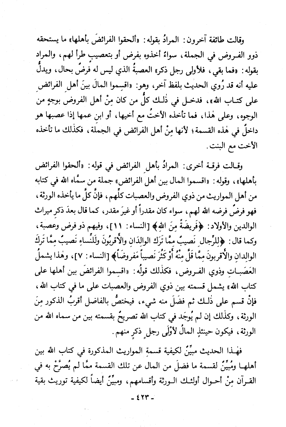 وَقَالَتْ طَائِفَةٌ آخَرُونَ: الْمُرَادُ بِقَوْلِهِ: «أَلْحِقُوا الْفَرَائِضَ بِأَهْلِهَا» مَا يَسْتَحِقُّهُ ذَوُو الْفُرُوضِ فِي الْجُمْلَةِ، سَوَاءٌ أَخَذُوهُ بِفَرْضٍ أَوْ بِتَعْصِيبٍ طَرَأَ لَهُمْ، وَالْمُرَادُ بِقَوْلِهِ: «فَمَا بَقِيَ فَلِأَوْلَى رَجُلٍ ذَكَرٍ» الْعَصَبَةُ الَّذِي لَيْسَ لَهُ فَرْضٌ بِحَالٍ، وَيَدُلُّ عَلَيْهِ أَنَّهُ قَدْ رُوِيَ الْحَدِيثُ بِلَفْظٍ آخَرَ، وَهُوَ: «اقْسِمُوا الْمَالَ بَيْنَ أَهْلِ الْفَرَائِضِ عَلَى كِتَابِ اللَّهِ» فَدَخَلَ فِي ذَلِكَ كُلُّ مَنْ كَانَ مِنْ أَهْلِ الْفُرُوضِ بِوَجْهٍ مِنَ الْوُجُوهِ، وَعَلَى هَذَا فَمَا تَأْخُذُهُ الْأُخْتُ مَعَ أَخِيهَا، أَوِ ابْنِ عَمِّهَا إِذَا عَصَبَهَا هُوَ دَاخِلٌ فِي هَذِهِ الْقِسْمَةِ؛ لِأَنَّهَا مِنْ أَهْلِ الْفَرَائِضِ فِي الْجُمْلَةِ، فَكَذَلِكَ مَا تَأْخُذُهُ الْأُخْتُ مَعَ الْبِنْتِ. وَقَالَتْ فِرْقَةٌ أُخْرَى: الْمُرَادُ بِأَهْلِ الْفَرَائِضِ فِي قَوْلِهِ: «أَلْحِقُوا الْفَرَائِضَ بِأَهْلِهَا» ، وَقَوْلُهُ: «اقْسِمُوا الْمَالَ بَيْنَ أَهْلِ الْفَرَائِضِ» جُمْلَةُ مِنْ سَمَّاهُ اللَّهُ فِي كِتَابِهِ مِنْ أَهْلِ الْمَوَارِيثِ مِنْ ذَوِي الْفُرُوضِ وَالْعَصَبَاتِ كُلِّهِمْ، فَإِنَّ كُلَّ مَا يَأْخُذُهُ الْوَرَثَةُ، فَهُوَ فَرْضٌ فَرَضَهُ اللَّهُ لَهُمْ، سَوَاءٌ كَانَ مُقَدَّرًا أَوْ غَيْرَ مُقَدَّرٍ، كَمَا قَالَ بَعْدَ ذِكْرِ مِيرَاثِ الْوَالِدَيْنِ وَالْأَوْلَادِ: {فَرِيضَةً مِنَ اللَّهِ} [النساء: 11] [النِّسَاءِ: 11] ، وَفِيهِمْ ذُو فَرْضٍ وَعَصَبَةٍ، وَكَمَا قَالَ: {لِلرِّجَالِ نَصِيبٌ مِمَّا تَرَكَ الْوَالِدَانِ وَالْأَقْرَبُونَ وَلِلنِّسَاءِ نَصِيبٌ مِمَّا تَرَكَ الْوَالِدَانِ وَالْأَقْرَبُونَ مِمَّا قَلَّ مِنْهُ أَوْ كَثُرَ نَصِيبًا مَفْرُوضًا} [النساء: 7] [النِّسَاءِ: 7] وَهَذَا يَشْمَلُ الْعَصَبَاتِ وَذَوِي الْفُرُوضِ، فَكَذَلِكَ قَوْلُهُ: «اقْسِمُوا الْفَرَائِضَ بَيْنَ أَهْلِهَا عَلَى كِتَابِ اللَّهِ» يَشْمَلُ قِسْمَتَهُ بَيْنَ ذَوِي الْفُرُوضِ وَالْعَصَبَاتِ عَلَى مَا فِي كِتَابِ اللَّهِ، فَإِنْ قَسَمَ عَلَى ذَلِكَ ثُمَّ فَضُلَ مِنْهُ شَيْءٌ، فَيَخْتَصُّ بِالْفَاضِلِ أَقْرَبُ الذُّكُورِ مِنَ الْوَرَثَةِ، وَكَذَلِكَ إِنْ لَمْ يُوجَدْ فِي كِتَابِ اللَّهِ تَصْرِيحٌ بِقِسْمَتِهِ بَيْنَ مَنْ سَمَّاهُ اللَّهُ مِنَ الْوَرَثَةِ، فَيَكُونُ الْمَالُ حِينَئِذٍ لِأَوْلَى رَجُلٍ ذَكَرٍ مِنْهُمْ. فَهَذَا الْحَدِيثُ مُبَيِّنٌ لِكَيْفِيَّةِ قِسْمَةِ الْمَوَارِيثِ الْمَذْكُورَةِ فِي كِتَابِ اللَّهِ بَيْنَ أَهْلِهَا وَمُبَيِّنٌ لِقِسْمَةِ مَا فَضُلَ مِنَ الْمَالِ عَنْ تِلْكَ الْقِسْمَةِ مِمَّا لَمْ يُصَرِّحُ بِهِ الْقُرْآنُ مِنْ أَحْوَالِ أُولَئِكَ الْوَرَثَةِ وَأَقْسَامِهِمْ، وَمُبَيِّنٌ أَيْضًا لِكَيْفِيَّةِ تَوْرِيثِ بَقِيَّةِ