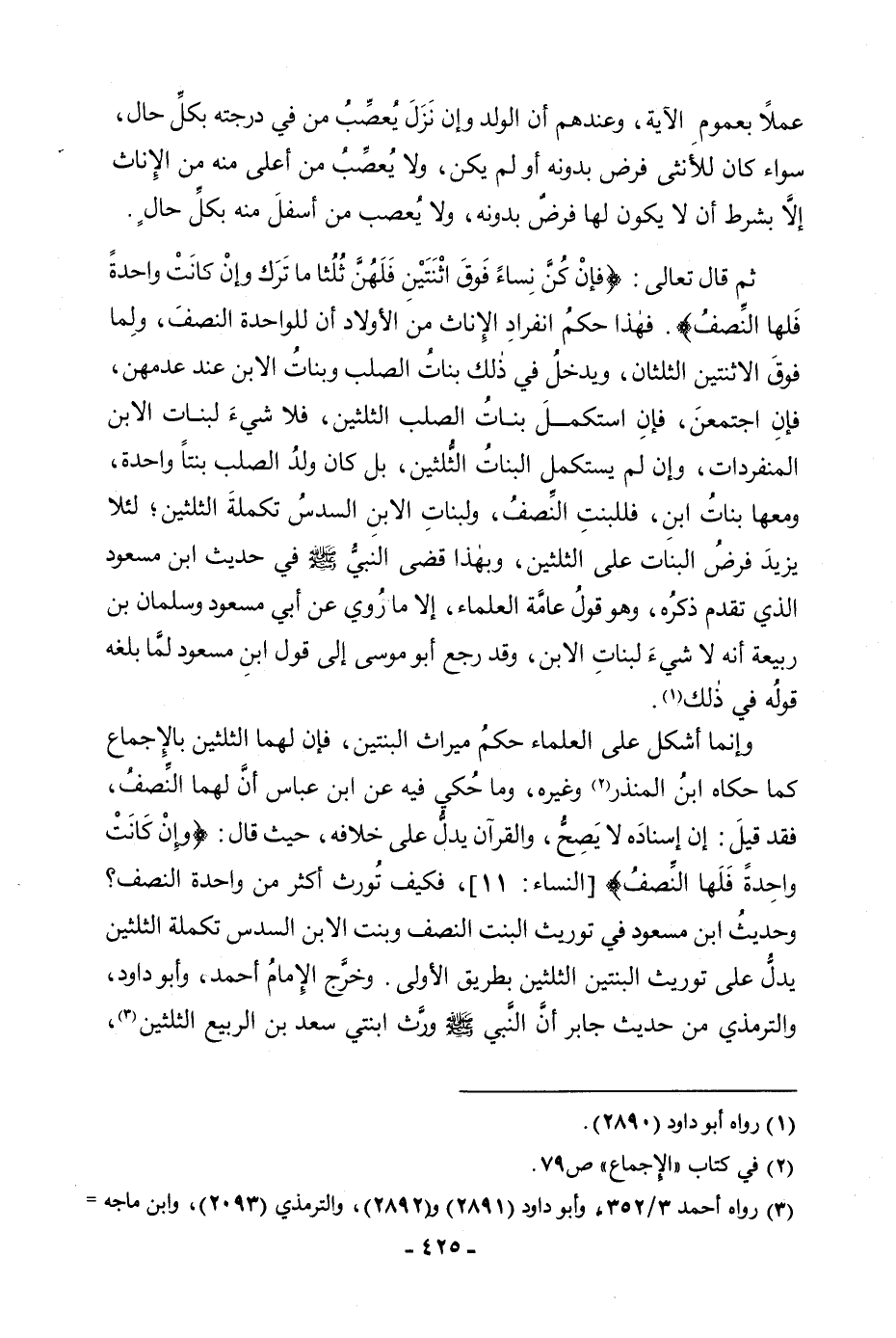 عَمَلًا بِعُمُومِ الْآيَةِ، وَعِنْدَهُمْ أَنَّ الْوَلَدَ وَإِنْ نَزَلَ يُعَصِّبُ مَنْ فِي دَرَجَتِهِ بِكُلِّ حَالٍ، سَوَاءٌ كَانَ لِلْأُنْثَى فَرْضٌ بِدُونِهِ أَوْ لَمْ يَكُنْ، يُعَصِّبُ مَنْ أَعْلَى مِنْهُ مِنَ الْإِنَاثِ إِلَّا بِشَرْطِ أَنْ لَا يَكُونَ لَهَا فَرْضٌ بِدُونِهِ، وَلَا يُعَصِّبُ مَنْ أَسْفَلَ مِنْهُ بِكُلِّ حَالٍ. ثُمَّ قَالَ تَعَالَى: {فَإِنْ كُنَّ نِسَاءً فَوْقَ اثْنَتَيْنِ فَلَهُنَّ ثُلُثَا مَا تَرَكَ وَإِنْ كَانَتْ وَاحِدَةً فَلَهَا النِّصْفُ} [النساء: 11] . فَهَذَا حُكْمُ انْفِرَادِ الْإِنَاثِ مِنَ الْأَوْلَادِ أَنَّ لِلْوَاحِدَةِ النِّصْفُ، وَلِمَا فَوْقَ الْأُنْثَيَيْنِ الثُّلُثَانِ، وَيَدْخُلُ فِي ذَلِكَ بَنَاتُ الصُّلْبِ وَبَنَاتُ الِابْنِ عِنْدَ عَدَمِهِنَّ، فَإِنِ اجْتَمَعْنَ فَإِنِ اسْتَكْمَلَ بَنَاتُ الصُّلْبِ الثُّلُثَيْنِ، فَلَا شَيْءَ لِبَنَاتِ الِابْنِ الْمُنْفَرِدَاتِ، وَإِنْ لَمْ يَسْتَكْمِلِ الْبَنَاتُ الثُّلُثَيْنِ، بَلْ كَانَ وَلَدُ الصُّلْبِ بِنْتًا وَاحِدَةً، وَمَعَهَا بَنَاتُ ابْنٍ، فَلِلْبِنْتِ النِّصْفُ، وَلِبَنَاتِ الِابْنِ السُّدُسُ تَكْمِلَةُ الثُّلُثَيْنِ؛ لِئَلَّا يَزِيدَ فَرْضُ الْبَنَاتِ عَلَى الثُّلُثَيْنِ، وَبِهَذَا قَضَى النَّبِيُّ صَلَّى اللَّهُ عَلَيْهِ وَسَلَّمَ فِي حَدِيثِ ابْنِ مَسْعُودٍ الَّذِي تَقَدَّمَ ذِكْرُهُ، وَهُوَ قَوْلُ عَامَّةِ الْعُلَمَاءِ، إِلَّا مَا رُوِيَ عَنِ ابْنِ مَسْعُودٍ وَسَلْمَانَ بْنِ رَبِيعَةَ أَنَّهُ لَا شَيْءَ لِبَنَاتِ الِابْنِ، وَقَدْ رَجَعَ أَبُو مُوسَى إِلَى قَوْلِ ابْنِ مَسْعُودٍ لَمَّا بَلَغَهُ قَوْلُهُ فِي ذَلِكَ. وَإِنَّمَا أُشْكِلَ عَلَى الْعُلَمَاءِ حُكْمُ مِيرَاثِ الْبِنْتَيْنِ، فَإِنَّ لَهُمَا الثُّلُثَيْنِ بِالْإِجْمَاعِ كَمَا حَكَاهُ ابْنُ الْمُنْذِرِ وَغَيْرُهُ، وَمَا حُكِيَ فِيهِ عَنِ ابْنِ عَبَّاسٍ أَنَّ لَهُمَا النِّصْفَ، فَقَدْ قِيلَ: إِنَّ إِسْنَادَهُ لَا يَصِحُّ، وَالْقُرْآنُ يَدُلُّ عَلَى خِلَافِهِ، حَيْثُ قَالَ: {وَإِنْ كَانَتْ وَاحِدَةً فَلَهَا النِّصْفُ} [النساء: 11] [النِّسَاءِ: 11] ، فَكَيْفَ تُوَرَّثُ أَكْثَرُ مِنْ وَاحِدَةٍ النِّصْفَ؟ وَحَدِيثُ ابْنِ مَسْعُودٍ فِي تَوْرِيثِ الْبِنْتِ النِّصْفَ وَبِنْتِ الِابْنِ السُّدُسَ تَكْمِلَةَ الثُّلُثَيْنِ يَدُلُّ عَلَى تَوْرِيثِ الْبِنْتِ الثُّلُثَيْنِ بِطَرِيقِ الْأَوْلَى. وَخَرَّجَ الْإِمَامُ أَحْمَدُ، وَأَبُو دَاوُدَ وَالتِّرْمِذِيُّ مِنْ حَدِيثِ جَابِرٍ «أَنَّ النَّبِيَّ صَلَّى اللَّهُ عَلَيْهِ وَسَلَّمَ وَرَّثَ ابْنَتَيْ سَعْدِ بْنِ الرَّبِيعِ الثُّلُثَيْنِ» ،