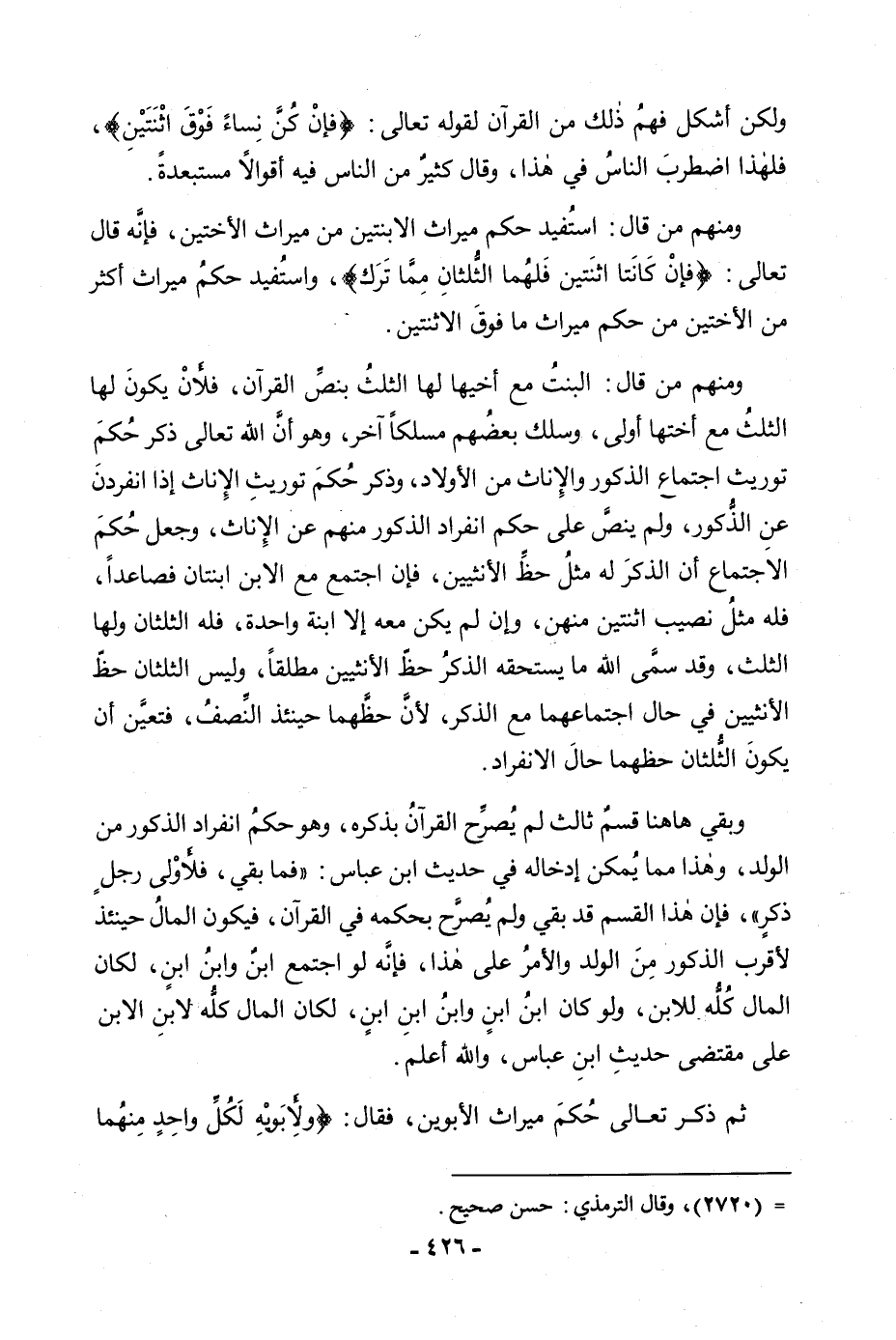 وَلَكِنْ أُشْكِلَ فَهْمُ ذَلِكَ مِنَ الْقُرْآنِ لِقَوْلِهِ تَعَالَى: {فَإِنْ كُنْ نِسَاءً فَوْقَ اثْنَتَيْنِ} [النساء: 11] ، فَلِهَذَا اضْطَرَبَ النَّاسُ فِي هَذَا، وَقَالَ كَثِيرٌ مِنَ النَّاسِ فِيهِ أَقْوَالًا مُسْتَبْعَدَةً. وَمِنْهُمْ مَنْ قَالَ: اسْتُفِيدَ حُكْمُ مِيرَاثِ الِابْنَتَيْنِ مِنْ مِيرَاثِ الْأُخْتَيْنِ، فَإِنَّهُ قَالَ تَعَالَى: {فَإِنْ كَانَتَا اثْنَتَيْنِ فَلَهُمَا الثُّلُثَانِ مِمَّا تَرَكَ} [النساء: 176] ، وَاسْتُفِيدَ حُكْمُ مِيرَاثٍ أَكْثَرَ مِنَ الْأُخْتَيْنِ مِنْ حُكْمِ مِيرَاثِ مَا فَوْقَ الِاثْنَتَيْنِ. وَمِنْهُمْ مَنْ قَالَ: الْبِنْتُ مَعَ أَخِيهَا لَهَا الثُّلُثُ بِنَصِّ الْقُرْآنِ، فَلَأَنْ يَكُونَ لَهَا الثُّلُثُ مَعَ أُخْتِهَا أَوْلَى، وَسَلَكَ بَعْضُهُمْ مَسْلَكًا آخَرَ، وَهُوَ أَنَّ اللَّهَ تَعَالَى ذَكَرَ حُكْمَ تَوْرِيثِ اجْتِمَاعِ الذُّكُورِ وَالْإِنَاثِ مِنَ الْأَوْلَادِ، وَذَكَرَ حُكْمَ تَوْرِيثِ الْإِنَاثِ إِذَا انْفَرَدْنَ عَنِ الذُّكُورِ، وَلَمْ يَنُصَّ عَلَى حُكْمِ انْفِرَادِ الذُّكُورِ مِنْهُمْ عَنِ الْإِنَاثِ، وَجَعَلَ حُكْمَ الِاجْتِمَاعِ أَنَّ الذَّكَرَ لَهُ مِثْلُ حَظِّ الْأُنْثَيَيْنِ، فَإِنِ اجْتَمَعَ مَعَ الِابْنِ ابْنَتَانِ فَصَاعِدًا، فَلَهُ مِثْلُ نَصِيبِ اثْنَتَيْنِ مِنْهُنَّ، وَإِنْ لَمْ يَكُنْ مَعَهُ إِلَّا ابْنَةً وَاحِدَةً، فَلَهُمَا الثُّلُثَانِ وَلَهَا الثُّلُثُ، وَقَدْ سَمَّى اللَّهُ مَا يَسْتَحِقُّهُ الذَّكَرُ حَظَّ الْأُنْثَيَيْنِ مُطْلَقًا، وَلَيْسَ الثُّلُثَانِ حَظَّ الْأُنْثَيَيْنِ فِي حَالِ اجْتِمَاعِهِمَا مَعَ الذَّكَرِ، لِأَنَّ حَظَّهُمَا حِينَئِذٍ النِّصْفُ، فَتَعَيَّنَ أَنْ يَكُونَ الثُّلُثَانِ حَظُّهُمَا حَالَ الِانْفِرَادِ. وَبَقِيَ هَاهُنَا قِسْمٌ ثَالِثٌ لَمْ يُصَرِّحِ الْقُرْآنُ بِذِكْرِهِ، وَهُوَ حُكْمُ انْفِرَادِ الذُّكُورِ مِنَ الْوَلَدِ، وَهَذَا مِمَّا يُمْكِنُ إِدْخَالُهُ فِي حَدِيثِ ابْنِ عَبَّاسٍ: «فَمَا بَقِيَ، فَلِأَوْلَى رَجُلٍ ذَكَرٍ» ، فَإِنَّ هَذَا الْقِسْمَ قَدْ بَقِيَ وَلَمْ يُصَرَّحْ بِحُكْمِهِ فِي الْقُرْآنِ، فَيَكُونُ الْمَالُ حِينَئِذٍ لِأَقْرَبِ الذُّكُورِ مِنَ الْوَلَدِ وَالْأَمْرُ عَلَى هَذَا، فَإِنَّهُ لَوِ اجْتَمَعَ ابْنٌ وَابْنٌ ابْنٌ، لَكَانَ الْمَالُ كُلُّهُ لِلِابْنِ، وَلَوْ كَانَ ابْنُ ابْنٍ وَابْنُ ابْنِ ابْنٍ، لَكَانَ الْمَالُ كُلُّهُ لِابْنِ الِابْنِ عَلَى مُقْتَضَى حَدِيثِ ابْنِ عَبَّاسٍ، وَاللَّهُ أَعْلَمُ.