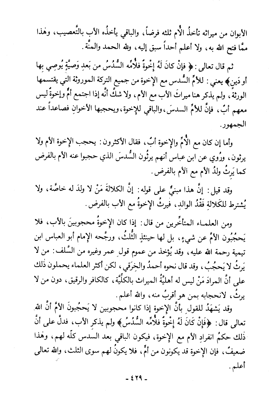 ثُمَّ قَالَ تَعَالَى: {فَإِنْ كَانَ لَهُ إِخْوَةٌ فَلِلْأُمِّهِ السُّدُسُ مِنْ بَعْدِ وَصِيَّةٍ يُوصِي بِهَا أَوْ دِينٌ} [النساء: 11] يَعْنِي: لِلْأُمِّ السُّدُسُ مَعَ الْإِخْوَةِ مِنْ جَمِيعِ التَّرِكَةِ الْمَوْرُوثَةِ الَّتِي يَقْتَسِمُهَا الْوَرَثَةُ، وَلَمْ يُذْكَرْ هُنَا مِيرَاثُ الْأَبِ مَعَ الْأُمِّ، وَلَا شَكَّ أَنَّهُ إِذَا اجْتَمَعَ أُمٌّ وَإِخْوَةٌ لَيْسَ مَعَهُمْ أَبٌ، فَإِنَّ لِلْأُمِّ السُّدُسَ، وَالْبَاقِي لِلْإِخْوَةِ وَيَحْجُبُهَا الْأَخَوَانِ فَصَاعِدًا عِنْدَ الْجُمْهُورِ. وَأَمَّا إِنْ كَانَ مَعَ الْأُمِّ وَالْإِخْوَةِ أَبٌ، فَقَالَ الْأَكْثَرُونَ: يَحْجُبُ الْإِخْوَةُ الْأُمَّ وَلَا يَرِثُونَ، وَرُوِيَ عَنِ ابْنِ عَبَّاسٍ أَنَّهُمْ يَرِثُونَ السُّدُسَ الَّذِي حَجَبُوا عَنْهُ الْأُمَّ بِالْفَرْضِ كَمَا يَرِثُ وَلَدُ الْأُمِّ مَعَ الْأُمِّ بِالْفَرْضِ. وَقَدْ قِيلَ: إِنَّ هَذَا مَبْنِيٌّ عَلَى قَوْلِهِ: إِنَّ الْكَلَالَةَ مَنْ لَا وَلَدَ لَهُ خَاصَّةً، وَلَا يُشْتَرَطُ لِلْكَلَالَةِ فَقْدُ الْوَالِدِ، فَيَرِثُ الْإِخْوَةُ مَعَ الْأَبِ بِالْفَرْضِ. وَمِنَ الْعُلَمَاءِ الْمُتَأَخِّرِينَ مَنْ قَالَ: إِذَا كَانَ الْإِخْوَةُ مَحْجُوبِينَ بِالْأَبِ، فَلَا يَحْجُبُونَ الْأُمَّ عَنْ شَيْءٍ، بَلْ لَهَا حِينَئِذٍ الثُّلُثُ، وَرَجَّحَهُ الْإِمَامُ أَبُو الْعَبَّاسِ بْنُ تَيْمِيَّةَ رَحْمَةُ اللَّهِ عَلَيْهِ، وَقَدْ يُؤْخَذُ مِنْ عُمُومِ قَوْلِ عُمَرَ وَغَيْرِهِ مِنَ السَّلَفِ: مَنْ لَا يَرِثُ لَا يُحْجَبُ، وَقَدْ قَالَ نَحْوَهُ أَحْمَدُ والْخَرْقِيُّ، لَكِنَّ أَكْثَرَ الْعُلَمَاءِ يَحْمِلُونَ ذَلِكَ عَلَى أَنَّ الْمُرَادَ مَنْ لَيْسَ لَهُ أَهْلِيَّةٌ بِالْكُلِّيَّةِ، كَالْكَافِرِ وَالرَّقِيقِ، دُونَ مَنْ يَرِثُ لِانْحِجَابِهِ بِمَنْ هُوَ أَقْرَبُ مِنْهُ، وَاللَّهُ أَعْلَمُ. وَقَدْ يَشْهَدُ لِلْقَوْلِ بِأَنَّ الْإِخْوَةَ إِذَا كَانُوا مَحْجُوبِينَ لَا يَحْجُبُونَ الْأُمَّ أَنَّ اللَّهَ تَعَالَى قَالَ: {فَإِنْ كَانَ لَهُ إِخْوَةٌ فَلِأُمِّهِ السُّدُسُ} [النساء: 11] وَلَمْ يَذْكُرِ الْأَبَ، فَدَلَّ عَلَى أَنَّ ذَلِكَ حُكْمُ انْفِرَادِ الْأُمِّ مَعَ الْإِخْوَةِ، فَيَكُونُ الْبَاقِي بَعْدَ السُّدُسِ كُلَّهِ لَهُمْ، وَهَذَا ضَعِيفٌ، فَإِنَّ الْإِخْوَةَ قَدْ يَكُونُونَ مِنْ أُمٍّ، فَلَا يَكُونُ لَهُمْ سِوَى الثُّلُثِ، وَاللَّهُ تَعَالَى أَعْلَمُ.