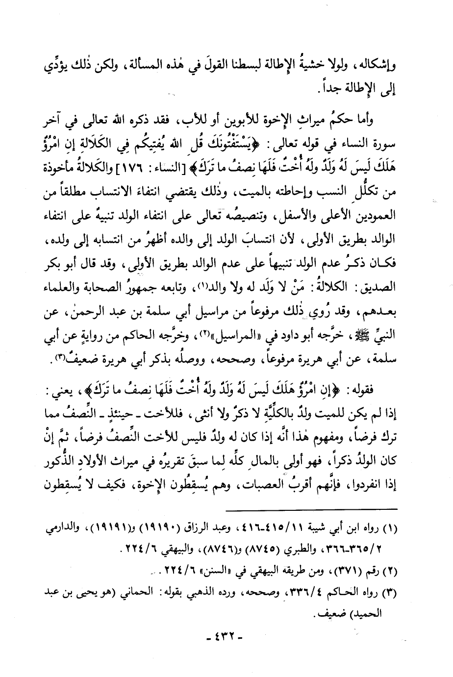 وَأَمَّا حُكْمُ مِيرَاثِ الْإِخْوَةِ لِلْأَبَوَيْنِ أَوْ لِلْأَبِ، فَقَدْ ذَكَرَهُ اللَّهُ تَعَالَى فِي آخِرِ سُورَةِ النِّسَاءِ فِي قَوْلِهِ تَعَالَى: {يَسْتَفْتُونَكَ قُلِ اللَّهُ يُفْتِيكُمْ فِي الْكَلَالَةِ إِنِ امْرُؤٌ هَلَكَ لَيْسَ لَهُ وَلَدٌ وَلَهُ أُخْتٌ فَلَهَا نِصْفُ مَا تَرَكَ} [النساء: 176] [النِّسَاءِ: 176] وَالْكَلَالَةُ مَأْخُوذَةٌ مِنْ تَكَلُّلِ النَّسَبِ وَإِحَاطَتِهِ بِالْمَيِّتِ، وَذَلِكَ يَقْتَضِي انْتِفَاءَ الِانْتِسَابِ مُطْلَقًا مِنَ الْعَمُودَيْنِ الْأَعْلَى وَالْأَسْفَلِ، وَتَنْصِيصُهُ تَعَالَى عَلَى انْتِفَاءِ الْوَالِدِ تَنْبِيهٌ عَلَى انْتِفَاءِ الْوَالِدِ بِطَرِيقِ الْأَوْلَى، لِأَنَّ انْتِسَابَ الْوَلَدِ إِلَى وَالِدِهِ أَظْهَرُ مِنَ انْتِسَابِهِ إِلَى وَلَدِهِ، فَكَانَ ذِكْرُ عَدَمِ الْوَلَدِ تَنْبِيهًا عَلَى عَدَمِ الْوَالِدِ بِطْرِيقِ الْأَوْلَى، وَقَدْ قَالَ أَبُو بَكْرٍ الصِّدِّيقُ: الْكَلَالَةُ: مَنْ لَا وَلَدَ لَهُ وَلَا وَالِدَ، وَتَابَعَهُ جُمْهُورُ الصَّحَابَةِ وَالْعُلَمَاءِ بَعْدَهُمْ، وَقَدْ رُوِيَ ذَلِكَ مَرْفُوعًا مِنْ مَرَاسِيلِ أَبِي سَلَمَةَ بْنِ عَبْدِ الرَّحْمَنِ، عَنِ النَّبِيِّ صَلَّى اللَّهُ عَلَيْهِ وَسَلَّمَ، خَرَّجَهُ أَبُو دَاوُدَ فِي " الْمَرَاسِيلِ " وَخَرَّجَهُ الْحَاكِمُ مِنْ رِوَايَةٍ عَنْ أَبِي سَلَمَةَ، عَنْ أَبِي هُرَيْرَةَ مَرْفُوعًا، وَصَحَّحَهُ، وَوَصْلُهُ بِذِكْرِ أَبِي هُرَيْرَةَ ضَعِيفٌ. فَقَوْلُهُ: {إِنِ امْرُؤٌ هَلَكَ لَيْسَ لَهُ وَلَدٌ وَلَهُ أُخْتٌ فَلَهَا نِصْفُ مَا تَرَكَ} [النساء: 176] يَعْنِي: إِذَا لَمْ يَكُنْ لِلْمَيِّتِ وَلَدٌ بِالْكُلِّيَّةِ لَا ذِكْرَ وَلَا أُنْثَى، فَلِلْأُخْتِ - حِينَئِذٍ - النِّصْفُ مِمَّا تَرَكَ فَرْضًا، وَمَفْهُومُ هَذَا أَنَّهُ إِذَا كَانَ لَهُ وَلَدٌ فَلَيْسَ لِلْأُخْتِ النِّصْفُ فَرْضًا، ثُمَّ إِنْ كَانَ الْوَلَدُ ذَكَرًا، فَهُوَ أَوْلَى بِالْمَالِ كُلِّهِ لِمَا سَبَقَ تَقْرِيرُهُ فِي مِيرَاثِ الْأَوْلَادِ الذُّكُورِ إِذَا انْفَرَدُوا، فَإِنَّهُمْ أَقْرَبُ الْعَصَبَاتِ، وَهُمْ يُسْقِطُونَ الْإِخْوَةَ، فَكَيْفَ لَا يُسْقِطُونَ