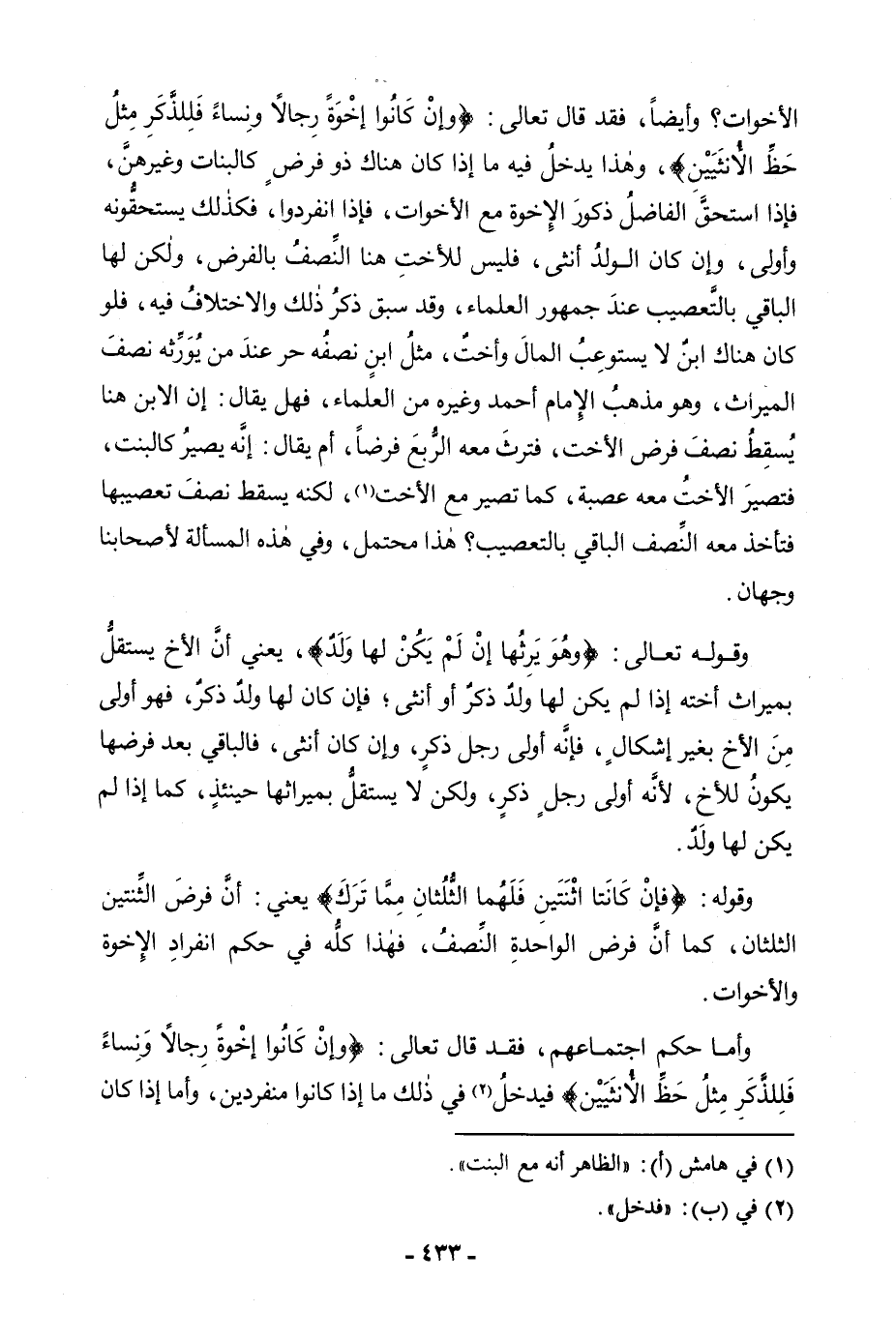 وَقَوْلُهُ تَعَالَى: {وَهُوَ يَرِثُهَا إِنْ لَمْ يَكُنْ لَهَا وَلَدٌ} [النساء: 176] ، يَعْنِي أَنَّ الْأَخَ يَسْتَقِلُّ بِمِيرَاثِ أُخْتِهِ إِذَا لَمْ يَكُنْ لَهَا وَلَدٌ ذَكَرٌ أَوْ أُنْثَى؛ فَإِنْ كَانَ لَهَا وَلَدٌ ذَكَرٌ، فَهُوَ أَوْلَى مِنَ الْأَخِ بِغَيْرِ إِشْكَالٍ، فَإِنَّهُ أَوْلَى رَجُلٍ ذَكَرٍ، وَإِنْ كَانَ أُنْثَى فَالْبَاقِي بَعْدَ فَرْضِهَا يَكُونُ لِلْأَخِ، لِأَنَّهُ أَوْلَى رَجُلٍ ذَكَرٍ، وَلَكِنْ لَا يَسْتَقِلُّ بِمِيرَاثِهَا حِينَئِذٍ، لِأَنَّهُ كَمَا إِذَا لَمْ يَكُنْ لَهَا وَلَدٌ. وَقَوْلُهُ: {فَإِنْ كَانَتَا اثْنَتَيْنِ فَلَهُمَا الثُّلُثَانِ مِمَّا تَرَكَ} [النساء: 176] يَعْنِي أَنَّ فَرْضَ الثِّنْتَيْنِ الثُّلُثَانِ، كَمَا أَنَّ فَرْضَ الْوَاحِدَةِ النِّصْفُ، فَهَذَا كُلُّهُ فِي حُكْمِ انْفِرَادِ الْإِخْوَةِ وَالْأَخَوَاتِ. وَأَمَّا حُكْمُ اجْتِمَاعِهِمْ، فَقَدْ قَالَ تَعَالَى: {وَإِنْ كَانُوا إِخْوَةً رِجَالًا وَنِسَاءً فَلِلذَّكَرِ مِثْلُ حَظِّ الْأُنْثَيَيْنِ} [النساء: 176] فَدَخَلَ فِي ذَلِكَ مَا إِذَا كَانُوا مُنْفَرِدِينَ، وَأَمَّا إِذَا كَانَ