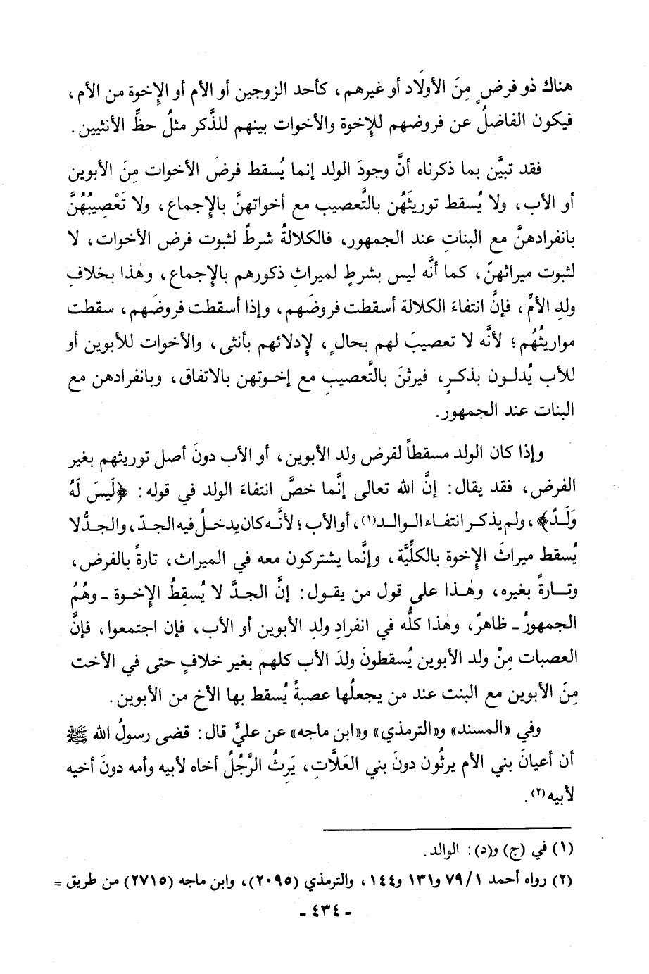 هُنَاكَ ذُو فَرْضٍ مِنَ الْأَوْلَادِ أَوْ غَيْرِهِمْ، كَأَحَدِ الزَّوْجَيْنِ أَوِ الْأُمِّ أَوِ الْإِخْوَةِ مِنَ الْأُمِّ، فَيَكُونُ الْفَاضِلُ عَنْ فُرُوضِهِمْ لِلْإِخْوَةِ وَالْأَخَوَاتِ بَيْنَهُمْ لِلذَّكَرِ مِثْلُ حَظِّ الْأُنْثَيَيْنِ. فَقَدْ تَبَيَّنَ بِمَا ذَكَرْنَاهُ أَنَّ وُجُودَ الْوَلَدِ إِنَّمَا يُسْقِطُ فَرْضَ الْأَخَوَاتِ مِنَ الْأَبَوَيْنِ أَوِ الْأَبِ، وَلَا يُسْقِطُ تَوْرِيثَهُنَّ بِالتَّعْصِيبِ مَعَ أَخَوَاتِهِنَّ بِالْإِجْمَاعِ، وَلَا تَعْصِيبِهِنَّ بِانْفِرَادِهِنَّ مَعَ الْبَنَاتِ عِنْدَ الْجُمْهُورِ، فَالْكَلَالَةُ شَرْطٌ لِثُبُوتِ فَرْضِ الْأَخَوَاتِ، لَا لِثُبُوتِ مِيرَاثِهِنَّ، كَمَا أَنَّهُ لَيْسَ بِشَرْطٍ لِمِيرَاثِ ذُكُورِهِمْ بِالْإِجْمَاعِ، وَهَذَا بِخِلَافِ وَلَدِ الْأُمِّ، فَإِنَّ انْتِفَاءَ الْكَلَالَةِ أَسْقَطَتْ فُرُوضَهُمْ، وَإِذَا أُسْقِطَتْ فُرُوضُهُمْ، سَقَطَتْ مَوَارِيثُهُمْ؛ لِأَنَّهُ لَا تَعْصِيبَ لَهُمْ بِحَالٍ لِإِدْلَائِهِمْ بِأُنْثَى وَالْأَخَوَاتُ لِلْأَبَوَيْنِ أَوْ لِلْأَبِ يُدْلُونَ بِذَكَرٍ، فَيَرِثْنَ بِالتَّعْصِيبِ مَعَ إِخْوَتِهِنَّ بِالِاتِّفَاقِ، وَبِانْفِرَادِهِنَّ مَعَ الْبَنَاتِ عِنْدَ الْجُمْهُورِ. وَإِذَا كَانَ الْوَلَدُ مُسْقِطًا لِفَرْضِ وَلَدِ الْأَبَوَيْنِ، أَوِ الْأَبِ دُونَ أَصْلِ تَوْرِيثِهِمْ بِغَيْرِ الْفَرْضِ، فَقَدْ يُقَالُ: إِنَّ اللَّهَ تَعَالَى إِنَّمَا خَصَّ انْتِفَاءَ الْوَلَدِ فِي قَوْلِهِ: {لَيْسَ لَهُ وَلَدٌ} [النساء: 176] ، وَلَمْ يَذْكُرِ انْتِفَاءَ الْوَالِدِ وَالْأَبِ؛ لِأَنَّهُ كَانَ يَدْخُلُ فِيهِ الْجَدُّ، وَالْجَدُّ لَا يُسْقِطُ مِيرَاثَ الْإِخْوَةِ بِالْكُلِّيَّةِ، وَإِنَّمَا يَشْتَرِكُونَ مَعَهُ فِي الْمِيرَاثِ، تَارَةً بِالْفَرْضِ وَتَارَةً بِغَيْرِهِ، وَهَذَا عَلَى قَوْلِ مَنْ يَقُولُ: إِنَّ الْجَدَّ لَا يُسْقِطُ الْإِخْوَةَ - وَهُمُ الْجُمْهُورُ - ظَاهِرٌ، وَهَذَا كُلُّهُ فِي انْفِرَادِ وَلَدِ الْأَبَوَيْنِ أَوَ الْأَبِّ، فَإِنِ اجْتَمَعُوا، فَإِنَّ الْعَصَبَاتِ مِنْ وَلَدِ الْأَبَوَيْنِ يُسْقِطُونَ وَلَدَ الْأَبِ كُلَّهُمْ بِغَيْرِ خِلَافٍ حَتَّى فِي الْأُخْتِ مِنَ الْأَبَوَيْنِ مَعَ الْبِنْتِ عِنْدَ مَنْ يَجْعَلُهَا عَصَبَةً يُسْقِطُ بِهَا الْأَخَ مِنَ الْأَبَوَيْنِ. وَفِي " الْمُسْنَدِ " وَ " التِّرْمِذِيِّ " وَ " ابْنِ مَاجَهْ " عَنْ عَلِيٍّ قَالَ: «قَضَى رَسُولُ اللَّهِ صَلَّى اللَّهُ عَلَيْهِ وَسَلَّمَ أَنَّ أَعْيَانَ بَنِي الْأُمِّ يَرِثُونَ دُونَ بَنِي الْعَلَّاتِ، يَرِثُ الرَّجُلُ أَخَاهُ لِأَبِيهِ وَأُمِّهِ دُونَ أَخِيهِ لِأَبِيهِ» .