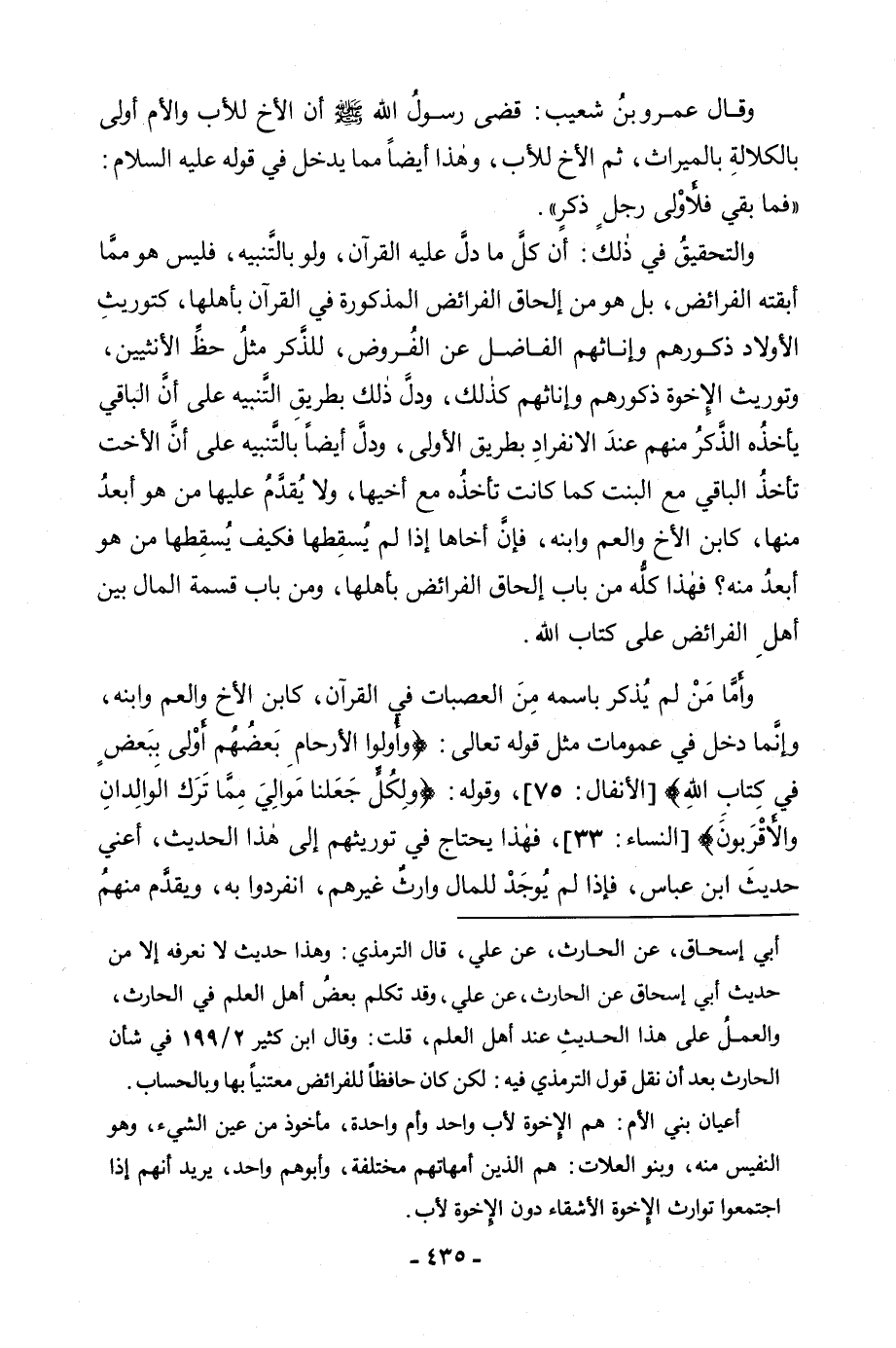 وَقَالَ عَمْرُو بْنُ شُعَيْبٍ: «قَضَى رَسُولُ اللَّهِ صَلَّى اللَّهُ عَلَيْهِ وَسَلَّمَ أَنَّ الْأَخَ لِلْأَبِ وَالْأُمِّ أَوْلَى بِالْكَلَالَةِ بِالْمِيرَاثِ، ثُمَّ الْأَخَ لِلْأَبِ» ، وَهَذَا أَيْضًا مِمَّا يَدْخُلُ فِي قَوْلِهِ عَلَيْهِ السَّلَامُ: «فَمَا بَقِيَ فَلِأَوْلَى رَجُلٍ ذَكَرٍ» . وَالتَّحْقِيقُ فِي ذَلِكَ أَنَّ كُلَّ مَا دَلَّ عَلَيْهِ الْقُرْآنُ، وَلَوْ بِالتَّنْبِيهِ، فَلَيْسَ هُوَ مِمَّا أَبْقَتْهُ الْفَرَائِضُ، بَلْ هُوَ مِنْ إِلْحَاقِ الْفَرَائِضِ الْمَذْكُورَةِ فِي الْقُرْآنِ بِأَهْلِهَا، كَتَوْرِيثِ الْأَوْلَادِ ذُكُورِهِمْ وَإِنَاثِهِمِ الْفَاضِلَ عَنِ الْفُرُوضِ، لِلذَّكَرِ مِثْلُ حَظِّ الْأُنْثَيَيْنِ، وَتَوْرِيثُ الْإِخْوَةِ ذُكُورِهِمْ وَإِنَاثِهِمْ كَذَلِكَ، وَدَلَّ ذَلِكَ بِطَرِيقِ التَّنْبِيهِ عَلَى أَنَّ الْبَاقِيَ يَأْخُذُهُ الذَّكَرُ مِنْهُمْ عِنْدَ الِانْفِرَادِ بِطَرِيقِ الْأَوْلَى وَدَلَّ أَيْضًا بِالتَّنْبِيهِ عَلَى أَنَّ الْأُخْتَ تَأْخُذُ الْبَاقِيَ مَعَ الْبِنْتِ كَمَا كَانَتْ تَأْخُذُهُ مَعَ أَخِيهَا، وَلَا يُقَدَّمُ عَلَيْهَا مَنْ هُوَ أَبْعَدُ مِنْهَا كَابْنِ الْأَخِ وَالْعَمِّ وَابْنِهِ، فَإِنَّ أَخَاهَا إِذَا لَمْ يُسْقِطْهَا فَكَيْفَ يُسْقِطُهَا مَنْ هُوَ أَبْعَدُ مِنْهُ؟ فَهَذَا كُلُّهُ مِنْ بَابِ إِلْحَاقِ الْفَرَائِضِ بِأَهْلِهَا، وَمِنْ بَابِ قِسْمَةِ الْمَالِ بَيْنَ أَهْلِ الْفَرَائِضِ عَلَى كِتَابِ اللَّهِ.