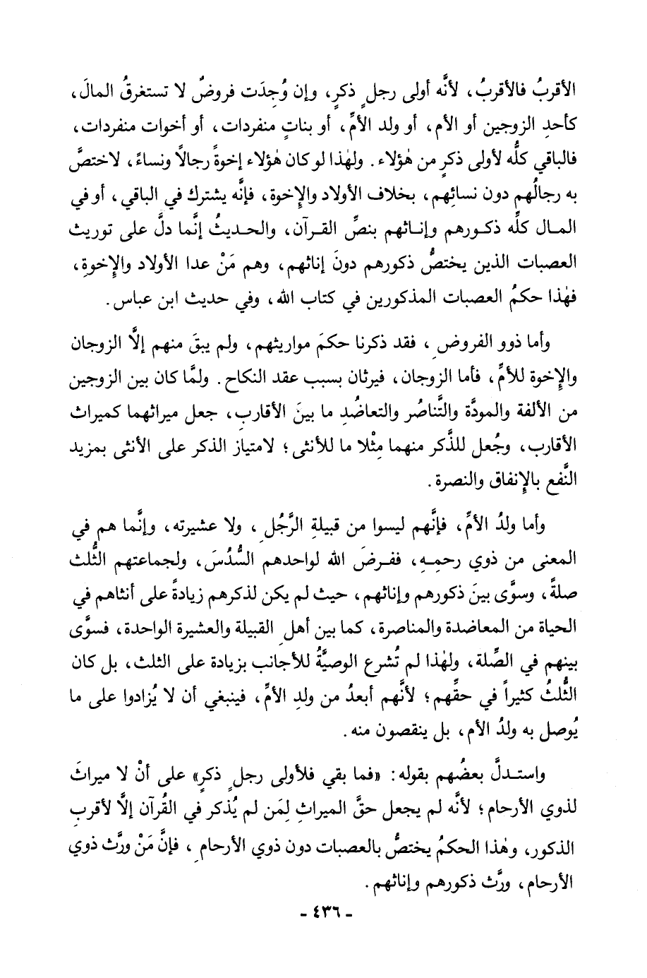 الْأَقْرَبُ فَالْأَقْرَبُ، لِأَنَّهُ أَوْلَى رَجُلٍ ذَكَرٍ، وَإِنْ وُجِدَتْ فُرُوضٌ لَا تَسْتَغْرِقُ الْمَالَ، كَأَحَدِ الزَّوْجَيْنِ أَوِ الْأُمِّ، أَوْ وَلَدِ الْأُمِّ، أَوْ بَنَاتٍ مُنْفَرِدَاتٍ، أَوْ أَخَوَاتٍ مُنْفَرِدَاتٍ، فَالْبَاقِي كُلُّهُ لِأَوْلَى ذَكَرٍ مِنْ هَؤُلَاءِ. وَلِهَذَا لَوْ كَانَ هَؤُلَاءِ إِخْوَةً رِجَالًا وَنِسَاءً، لَاخْتَصَّ بِهِ رِجَالُهُمْ دُونَ نِسَائِهِمْ، بِخِلَافِ الْأَوْلَادِ وَالْإِخْوَةِ، فَإِنَّهُ يَشْتَرِكُ فِي الْبَاقِي، أَوْ فِي الْمَالِ كُلِّهِ ذُكُورُهُمْ وَإِنَاثُهُمْ بِنَصِّ الْقُرْآنِ، وَالْحَدِيثُ إِنَّمَا دَلَّ عَلَى تَوْرِيثِ الَّذِينَ يَخْتَصُّ ذُكُورَهُمْ دُونَ إِنَاثِهِمْ، وَهُمْ مَنْ عَدَا الْأَوْلَادَ وَالْإِخْوَةَ، فَهَذَا حُكْمُ الْعَصَبَاتِ الْمَذْكُورِينَ فِي كِتَابِ اللَّهِ، وَفِي حَدِيثِ ابْنِ عَبَّاسٍ. وَأَمَّا ذَوُو الْفُرُوضِ، فَقَدْ ذَكَرْنَا حُكْمَ مَوَارِيثِهِمْ، وَلَمْ يَبْقَ مِنْهُمْ إِلَّا الزَّوْجَانِ وَالْإِخْوَةُ لِلْأُمِّ، فَأَمَّا الزَّوْجَانِ فَيَرِثَانِ بِسَبَبِ عَقْدِ النِّكَاحِ. وَلِمَا كَانَ بَيْنَ الزَّوْجَيْنِ مِنَ الْأُلْفَةِ وَالْمَوَدَّةِ وَالتَّنَاصُرِ وَالتَّعَاضُدِ مَا بَيْنَ الْأَقَارِبِ، جَعَلَ مِيرَاثَهُمَا كَمِيرَاثِ الْأَقَارِبِ، وَجَعَلَ لِلذَّكَرِ مِنْهُمَا مِثْلَا مَا لِلْأُنْثَى؛ لِامْتِيَازِ الذَّكَرِ عَلَى الْأُنْثَى بِمَزِيدِ النَّفْعِ بِالْإِنْفَاقِ وَالنُّصْرَةِ. وَأَمَّا وَلَدُ الْأُمِّ، فَإِنَّهُمْ لَيْسُوا مِنْ قَبِيلَةِ الرَّجُلِ، وَلَا عَشِيرَتِهِ، وَإِنَّمَا هُمْ فِي الْمَعْنَى مِنْ ذَوِي رَحِمِهِ، فَفَرَضَ اللَّهُ لِوَاحِدِهِمِ السُّدُسَ، وَلِجَمَاعَتِهِمِ الثُّلُثَ صِلَةً، وَسَوَّى فِيهِ بَيْنَ ذُكُورِهِمْ وَإِنَاثِهِمْ، حَيْثُ لَمْ يَكُنْ لِذَكَرِهِمْ زِيَادَةٌ عَلَى إِنَاثِهِمْ فِي الْحَيَاةِ مِنَ الْمُعَاضَدَةِ وَالْمُنَاصَرَةِ، كَمَا بَيْنَ أَهْلِ الْقَبِيلَةِ وَالْعَشِيرَةِ الْوَاحِدَةِ، فَسَوَّى بَيْنِهِمْ فِي الصِّلَةِ، وَلِهَذَا لَمْ تُشْرَعِ الْوَصِيَّةُ لِلْأَجَانِبِ بِزِيَادَةٍ عَلَى الثُّلُثِ، بَلْ كَانَ الثُّلُثُ كَثِيرًا فِي حَقِّهِمْ؛ لِأَنَّهُمْ أَبْعَدُ مِنْ وَلَدِ الْأُمِّ، فَيَنْبَغِي أَنْ لَا يُزَادُوا عَلَى مَا يُوصَلُ بِهِ وَلَدُ الْأُمِّ، بَلْ يُنْقِصُونَ مِنْهُ. وَاسْتَدَلَّ بَعْضُهُمْ بِقَوْلِهِ: «فَمَا بَقِيَ فَلِأَوْلَى رَجُلٍ ذَكَرٍ» عَلَى أَنَّهُ لَا مِيرَاثَ لِذَوِي الْأَرْحَامِ؛ لِأَنَّهُ لَمْ يُجْعَلْ حَقَّ الْمِيرَاثِ لِمَنْ لَمْ يُذْكَرْ فِي الْقُرْآنِ إِلَّا لِأَقْرَبِ الذُّكُورِ، وَهَذَا الْحُكْمُ يَخْتَصُّ بِالْعَصَبَاتِ دُونَ ذَوِي الْأَرْحَامِ، فَإِنَّ مَنْ وِرِثَ ذَوِي الْأَرْحَامِ، وَرِثَ ذُكُورَهُمْ وَإِنَاثَهُمْ.