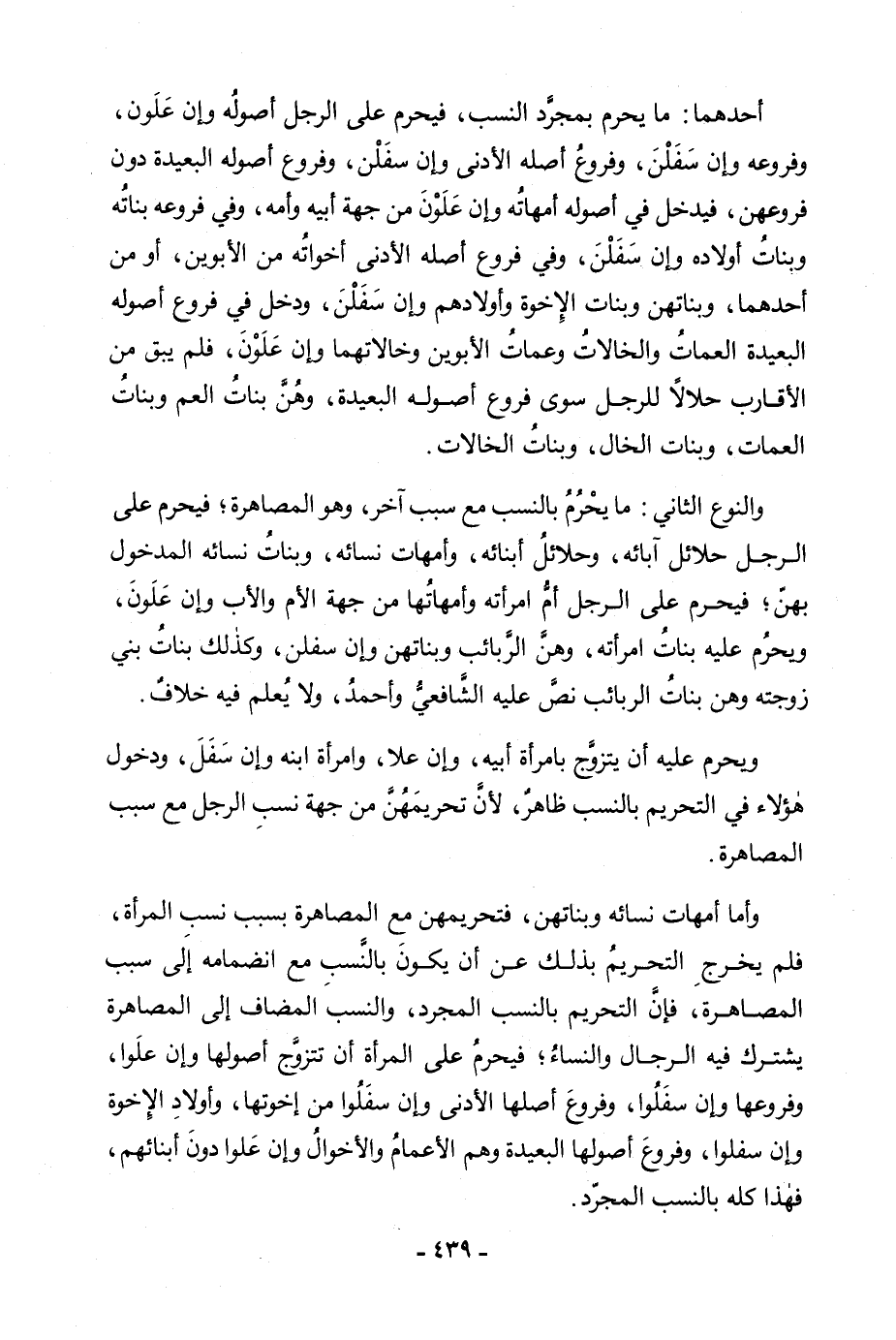 أَحَدُهُمَا: مَا يَحْرُمُ بِمُجَرَّدِ النَّسَبِ، فَيَحْرُمُ عَلَى الرَّجُلِ أُصُولُهُ وَإِنْ عَلَوْنَ، وَفُرُوعُهُ وَإِنْ سَفُلْنَ، وَفُرُوعُ أَصْلِهِ الْأَدْنَى وَإِنْ سَفُلْنَ، فُرُوعُ أُصُولِهِ الْبَعِيدَةِ دُونَ فُرُوعِهِنَّ، فَيَدْخُلُ فِي أُصُولِهِ أُمَّهَاتُهُ وَإِنْ عَلَوْنَ مِنْ جِهَةِ أَبِيهِ وَأُمِّهِ، وَفِي فُرُوعِهِ بَنَاتُهُ وَبَنَاتُ أَوْلَادِهِ وَإِنْ سَفُلْنَ، وَفِي فُرُوعِ أَصْلِهِ الْأَدْنَى أَخَوَاتُهُ مِنَ الْأَبَوَيْنِ، أَوْ مِنْ أَحَدِهِمَا، وَبَنَاتُهُنَّ وَبَنَاتُ الْإِخْوَةِ وَأَوْلَادُهُمْ وَإِنْ سَفُلْنَ، وَدَخَلَ فِي فُرُوعِ أُصُولِهِ الْبَعِيدَةِ الْعَمَّاتُ وَالْخَالَاتُ وَعَمَّاتُ الْأَبَوَيْنِ وَخَالَاتُهُمَا وَإِنْ عَلَوْنَ، فَلَمْ يَبْقَ مِنَ الْأَقَارِبِ حَلَالًا لِلرَّجُلِ سِوَى فُرُوعِ أُصُولِهِ الْبَعِيدَةِ، وَهُنَّ بَنَاتُ الْعَمِّ وَبَنَاتُ الْعَمَّاتِ، وَبَنَاتُ الْخَالِ، وَبَنَاتُ الْخَالَاتِ. وَالنَّوْعُ الثَّانِي: مَا يَحْرُمُ مِنَ النَّسَبِ مَعَ سَبَبٍ آخَرَ، وَهُوَ الْمُصَاهَرَةُ؛ فَيَحْرُمُ عَلَى الرَّجُلِ حَلَائِلُ آبَائِهِ، وَحَلَائِلُ أَبْنَائِهِ، وَأُمَّهَاتُ نِسَائِهِ، وَبَنَاتُ نِسَائِهِ الْمَدْخُولُ بِهِنَّ؛ فَيَحْرُمُ عَلَى الرَّجُلِ أُمُّ امْرَأَتِهِ وَأُمَّهَاتُهَا مِنْ جِهَةِ الْأُمِّ وَالْأَبِ وَإِنْ عَلَوْنَ، وَيَحْرُمُ عَلَيْهِ بَنَاتُ امْرَأَتِهِ، وَهُنَّ الرَّبَائِبُ وَبَنَاتُهُنَّ وَإِنْ سَفُلْنَ، وَكَذَلِكَ بَنَاتُ بَنِي زَوْجَتِهِ وَهُنَّ بَنَاتُ الرَّبَائِبِ نَصَّ عَلَيْهِ الشَّافِعِيُّ وَأَحْمَدُ، وَلَا يُعْلَمُ فِيهِ خِلَافٌ. وَيَحْرُمُ عَلَيْهِ أَنْ يَتَزَوَّجَ بِامْرَأَةِ أَبِيهِ، وَإِنْ عَلَا وَبِامْرَأَةِ ابْنِهِ وَإِنْ سَفُلَ، وَدُخُولُ هَؤُلَاءِ فِي التَّحْرِيمِ بِالنَّسَبِ ظَاهِرٌ، لِأَنَّ تَحْرِيمَهُنَّ مِنْ جِهَةِ نَسَبِ الرَّجُلِ مَعَ سَبَبِ الْمُصَاهَرَةِ. وَأَمَّا أُمَّهَاتُ نِسَائِهِ وَبَنَاتُهُنَّ، فَتَحْرِيمُهُنَّ مَعَ الْمُصَاهَرَةِ بِسَبَبِ نَسَبِ الْمَرْأَةِ، فَلَمْ يَخْرُجِ التَّحْرِيمُ بِذَلِكَ عَنْ أَنْ يَكُونَ بِالنَّسَبِ مَعَ انْضِمَامِهِ إِلَى سَبَبِ الْمُصَاهَرَةِ، فَإِنَّ التَّحْرِيمَ بِالسَّبَبِ الْمُجَرَّدِ، وَالنَّسَبِ الْمُضَافِ إِلَى الْمُصَاهَرَةِ يَشْتَرِكُ فِيهِ الرِّجَالُ وَالنِّسَاءُ؛ فَيَحْرُمُ عَلَى الْمَرْأَةِ أَنْ تَتَزَوَّجَ أُصُولَهَا وَإِنْ عَلَوْا، وَفُرُوعَهَا وَإِنْ سَفُلُوا، وَفُرُوعَ أُصُولِهَا الْأَدْنَى وَإِنْ سَفُلُوا مِنْ إِخْوَتِهَا، وَأَوْلَادَ الْإِخْوَةِ وَإِنْ سَفُلُوا، وَفُرُوعَ أُصُولِهَا الْبَعِيدَةِ وَهُمُ الْأَعْمَامُ وَالْأَخْوَالُ وَإِنْ عَلَوْا دُونَ أَبْنَائِهِمْ، فَهَذَا كُلُّهُ بِالنَّسَبِ الْمُجَرَّدِ.