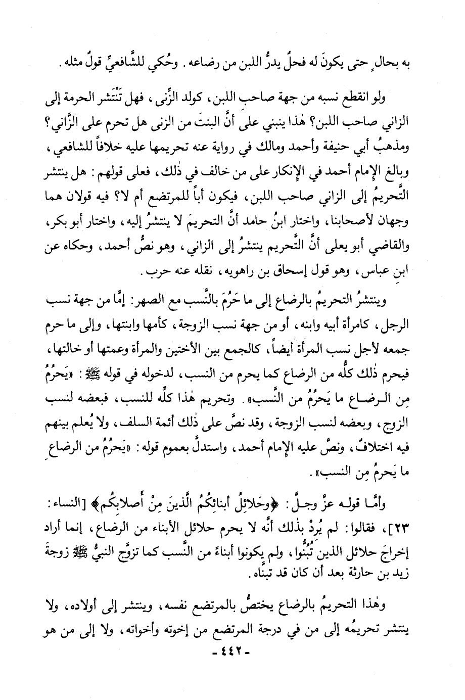 بِهِ بِحَالٍ حَتَّى يَكُونَ لَهُ فَحْلٌ يُدِرُّ اللَّبَنَ مِنْ رَضَاعِهِ. وَحُكِيَ عَنِ الشَّافِعِيِّ قَوْلٌ مِثْلُهَ. وَلَوِ انْقَطَعَ نَسَبُهُ مِنْ جِهَةِ صَاحِبِ اللَّبَنِ، كَوَلَدِ الزِّنَا، فَهَلْ تَنْتَشِرُ الْحُرْمَةُ إِلَى الزَّانِي صَاحِبِ اللَّبَنِ؟ هَذَا يَنْبَنِي عَلَى أَنَّ الْبِنْتَ مِنَ الزِّنَا هَلْ تَحْرُمُ عَلَى الزَّانِي؟ وَمَذْهَبُ أَبِي حَنِيفَةَ وَأَحْمَدَ وَمَالِكٍ فِي رِوَايَةٍ عَنْهُ تَحْرِيمُهَا عَلَيْهِ خِلَافًا لِلشَّافِعِيِّ، وَبَالَغَ الْإِمَامُ أَحْمَدُ فِي الْإِنْكَارِ عَلَى مَنْ خَالَفَ فِي ذَلِكَ، فَعَلَى قَوْلِهِمْ: هَلْ يَنْتَشِرُ التَّحْرِيمُ إِلَى الزَّانِي صَاحِبِ اللَّبَنِ، فَيَكُونُ أَبًا لِلْمُرْتَضِعِ أَمْ لَا؟ فِيهِ قَوْلَانِ هُمَا وَجْهَانِ لِأَصْحَابِنَا، وَاخْتَارَ ابْنُ حَامِدٍ أَنَّ التَّحْرِيمَ لَا يَنْتَشِرُ إِلَيْهِ، وَاخْتَارَ أَبُو بَكْرٍ، وَالْقَاضِي أَبُو يَعْلَى أَنَّ التَّحْرِيمَ يَنْتَشِرُ إِلَى الزَّانِي، وَهُوَ نَصُّ أَحْمَدَ، وَحَكَاهُ عَنِ ابْنِ عَبَّاسٍ، وَهُوَ قَوْلُ إِسْحَاقَ بْنِ رَاهَوَيْهِ، نَقَلَهُ عَنْهُ حَرْبٌ. وَيَنْتَشِرُ التَّحْرِيمُ بِالرَّضَاعِ إِلَى مَا حُرِّمَ بِالنَّسَبِ مَعَ الصِّهْرِ: أَمَّا مِنْ جِهَةِ نَسَبِ الرَّجُلِ، كَامْرَأَةِ أَبِيهِ وَابْنِهِ، أَوْ مِنْ جِهَةِ نَسَبِ الزَّوْجَةِ، كَأُمِّهَا وَابْنَتِهَا، وَإِلَى مَا حُرِّمَ جَمْعُهُ لِأَجْلِ نَسَبِ الْمَرْأَةِ أَيْضًا، كَالْجَمْعِ بَيْنَ الْأُخْتَيْنِ وَالْمَرْأَةِ وَعَمَّتِهَا أَوْ خَالَتِهَا، فَيَحْرُمُ ذَلِكَ كُلُّهُ مِنَ الرَّضَاعِ كَمَا يَحْرُمُ مِنَ النَّسَبِ، لِدُخُولِهِ فِي قَوْلِهِ صَلَّى اللَّهُ عَلَيْهِ وَسَلَّمَ: «يَحْرُمُ مِنَ الرَّضَاعِ مَا يَحْرُمُ مِنَ النَّسَبِ» . وَتَحْرُمُ هَذَا كُلُّهُ لِلنَّسَبِ، فَبَعْضُهُ لَنَسَبَ الزَّوْجِ وَبَعْضُهُ لِنَسَبِ الزَّوْجَةِ، وَقَدْ نَصَّ عَلَى ذَلِكَ أَئِمَّةُ السَّلَفِ، وَلَا يُعْلَمُ بَيْنَهُمْ فِيهِ اخْتِلَافٌ، وَنَصَّ عَلَيْهِ الْإِمَامُ أَحْمَدُ، وَاسْتَدَلَّ بِعُمُومِ قَوْلِهِ: «يَحْرُمُ مِنَ الرَّضَاعِ مَا يَحْرُمُ مِنَ النَّسَبِ» . وَأَمَّا قَوْلُهُ عَزَّ وَجَلَّ: {وَحَلَائِلُ أَبْنَائِكُمُ الَّذِينَ مِنْ أَصْلَابِكُمْ} [النساء: 23] [النِّسَاءِ: 23] ، فَقَالُوا: لَمْ يُرِدْ بِذَلِكَ أَنَّهُ لَا يَحْرُمُ حَلَائِلُ الْأَبْنَاءِ مِنَ الرَّضَاعِ، إِنَّمَا أَرَادَ إِخْرَاجَ حَلَائِلِ الَّذِينَ تُبُنُّوا، وَلَمْ يَكُونُوا أَبْنَاءً مِنَ النَّسَبِ كَمَا تَزَوَّجَ النَّبِيُّ صَلَّى اللَّهُ عَلَيْهِ وَسَلَّمَ زَوْجَةَ زَيْدِ بْنِ حَارِثَةَ بَعْدَ أَنْ كَانَ قَدْ تَبَنَّاهُ. وَهَذَا التَّحْرِيمُ بِالرَّضَاعِ يَخْتَصُّ بِالْمُرْتَضِعِ نَفْسِهِ، وَيَنْتَشِرُ إِلَى أَوْلَادِهِ، وَلَا يَنْتَشِرُ تَحْرِيمُهُ إِلَى مَنْ فِي دَرَجَةِ الْمُرْتَضِعِ مِنْ إِخْوَتِهِ وَأَخَوَاتِهِ وَلَا إِلَى مَنْ هُوَ