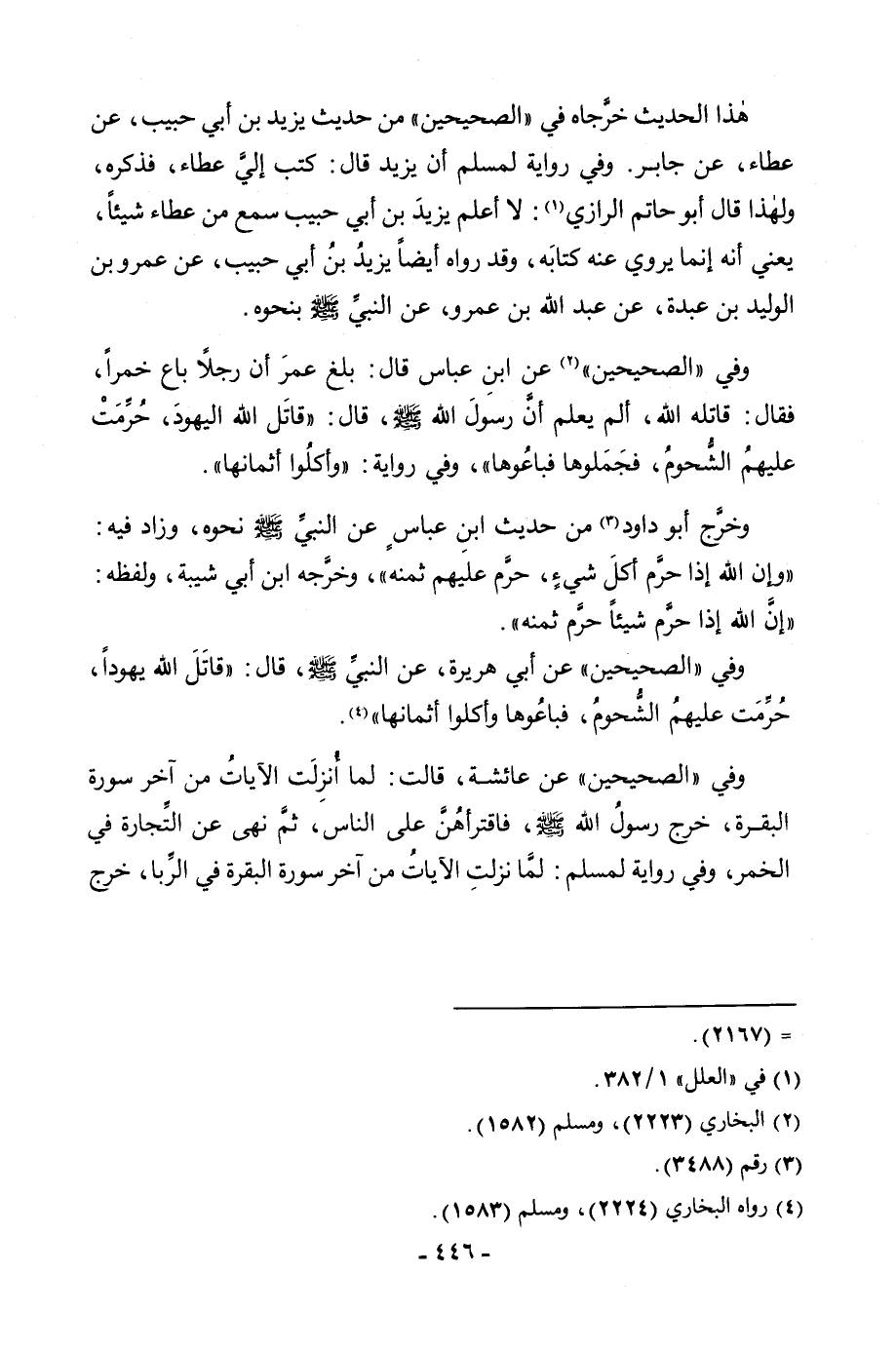 هَذَا الْحَدِيثُ خَرَّجَاهُ فِي " الصَّحِيحَيْنِ " مِنْ حَدِيثِ يَزِيدَ بْنِ أَبِي حَبِيبٍ، عَنْ عَطَاءٍ، عَنْ جَابِرٍ. وَفِي رِوَايَةٍ لِمُسْلِمٍ أَنَّ يَزِيدَ قَالَ: كَتَبَ إِلَيَّ عَطَاءٌ، فَذَكَرَهُ، وَلِهَذَا قَالَ أَبُو حَاتِمٍ الرَّازِيُّ: لَا أَعْلَمُ يَزِيدُ بْنُ أَبِي حَبِيبٍ سَمِعَ مِنْ عَطَاءٍ شَيْئًا، يَعْنِي أَنَّهُ إِنَّمَا يَرْوِي عَنْهُ كِتَابَهُ، وَقَدْ رَوَاهُ أَيْضًا يَزِيدُ بْنُ أَبِي حَبِيبٍ، عَنْ عَمْرِو بْنِ الْوَلِيدِ بْنِ عَبْدَةَ، عَنْ عَبْدِ اللَّهِ بْنِ عُمَرَ وَعَنِ النَّبِيِّ صَلَّى اللَّهُ عَلَيْهِ وَسَلَّمَ بِنَحْوِهِ. وَفِي " الصَّحِيحَيْنِ " عَنِ ابْنِ عَبَّاسٍ قَالَ: بَلَغَ عُمَرُ أَنَّ رَجُلًا بَاعَ خَمْرًا، فَقَالَ: قَاتَلَهُ اللَّهُ، أَلَمْ يَعْلَمْ أَنَّ رَسُولَ اللَّهِ صَلَّى اللَّهُ عَلَيْهِ وَسَلَّمَ قَالَ: «قَاتَلَ اللَّهُ الْيَهُودَ، حُرِّمَتْ عَلَيْهِمُ الشُّحُومُ، فَجَمَلُوهَا فَبَاعُوهَا» ، وَفِي رِوَايَةٍ: «وَأَكَلُوا أَثْمَانَهَا» . وَخَرَّجَهُ أَبُو دَاوُدَ مِنْ حَدِيثِ عَبَّاسٍ عَنِ النَّبِيِّ صَلَّى اللَّهُ عَلَيْهِ وَسَلَّمَ نَحْوَهُ، وَزَادَ فِيهِ: «وَإِنَّ اللَّهَ إِذَا حَرَّمَ أَكْلَ شَيْءٍ، حَرَّمَ عَلَيْهِمْ ثَمَنَهُ» ، وَخَرَّجَهُ ابْنُ أَبِي شَيْبَةَ، وَلَفْظُهُ: «إِنَّ اللَّهَ إِذَا حَرَّمَ شَيْئًا حَرَّمَ ثَمَنَهُ» . وَفِي " الصَّحِيحَيْنِ " عَنْ أَبِي هُرَيْرَةَ، عَنِ النَّبِيِّ صَلَّى اللَّهُ عَلَيْهِ وَسَلَّمَ، قَالَ: «قَاتَلَ اللَّهُ يَهُودًا، حُرِّمَتْ عَلَيْهِمُ الشُّحُومُ، فَبَاعُوهَا وَأَكَلُوا ثَمَنَهَا» . وَفِي " الصَّحِيحَيْنِ " عَنْ عَائِشَةَ، قَالَتْ: «لَمَّا أُنْزِلَتِ الْآيَاتُ مِنْ آخِرِ سُورَةِ الْبَقَرَةِ، خَرَجَ رَسُولُ اللَّهِ صَلَّى اللَّهُ عَلَيْهِ وَسَلَّمَ، فَاقْتَرَأَهُنَّ عَلَى النَّاسِ، ثُمَّ نَهَى عَنِ التِّجَارَةِ فِي الْخَمْرِ» ، وَفِي رِوَايَةٍ لِمُسْلِمٍ: «لَمَّا نَزَلَتِ الْآيَاتُ مِنْ آخِرِ سُورَةِ الْبَقَرَةِ فِي الرِّبَا، خَرَجَ
