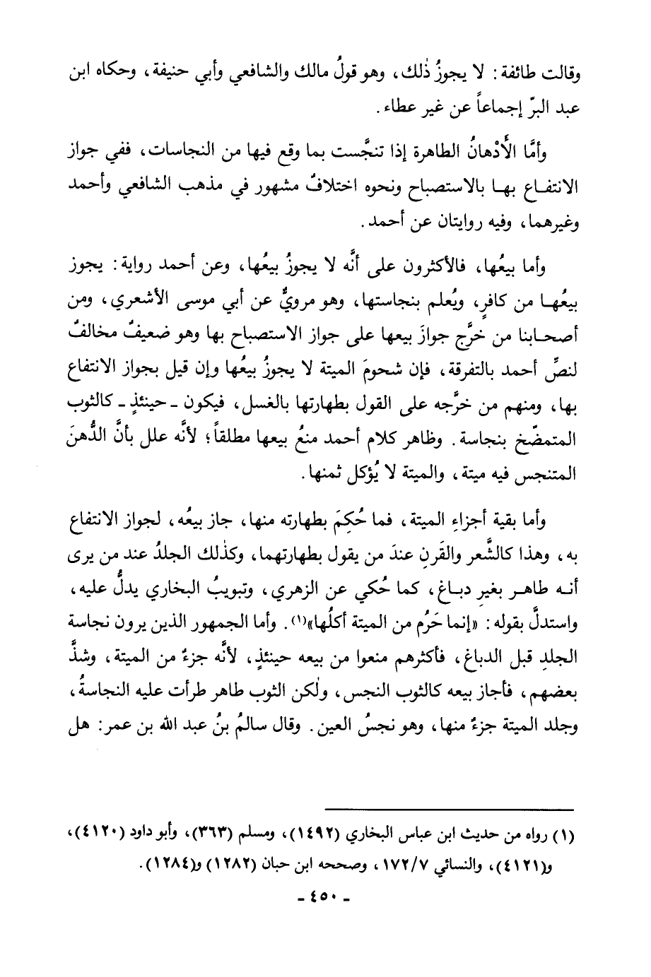 وَقَالَتْ طَائِفَةٌ: يَجُوزُ ذَلِكَ، وَهُوَ قَوْلُ مَالِكٍ وَالشَّافِعِيِّ وَأَبِي حَنِيفَةَ، وَحَكَاهُ ابْنُ عَبْدِ الْبَرِّ إِجْمَاعًا عَنْ غَيْرِ عَطَاءٍ. وَأَمَّا الْأَدْهَانُ الطَّاهِرَةُ إِذَا تَنَجَّسَتْ بِمَا وَقَعَ فِيهَا مِنَ النَّجَاسَاتِ، فَفِي جَوَازِ الِانْتِفَاعِ بِهَا بِالِاسْتِصْبَاحِ وَنَحْوِهِ اخْتِلَافٌ مَشْهُورٌ فِي مَذْهَبِ الشَّافِعِيِّ وَأَحْمَدَ وَغَيْرِهِمَا، وَفِيهِ رِوَايَتَانِ عَنْ أَحْمَدَ. وَأَمَّا بَيْعُهَا، فَالْأَكْثَرُونَ عَلَى أَنَّهُ يَجُوزُ بَيْعُهَا، وَعَنْ أَحْمَدَ رِوَايَةٌ: يَجُوزُ بَيْعُهَا مِنْ كَافِرٍ، وَيُعْلَمُ بِنَجَاسَتِهَا، وَهُوَ مَرْوِيٌّ عَنْ أَبِي مُوسَى الْأَشْعَرِيِّ، وَمِنْ أَصْحَابِنَا مَنْ خَرَّجَ جَوَازَ بَيْعِهَا عَلَى جَوَازِ الِاسْتِصْبَاحِ بِهَا وَهُوَ ضَعِيفٌ مُخَالِفٌ لِنَصِّ أَحْمَدَ بِالتَّفْرِقَةِ، فَإِنَّ شُحُومَ الْمَيْتَةِ لَا يَجُوزُ بَيْعُهَا وَإِنْ قِيلَ بِجَوَازِ الِانْتِفَاعِ بِهَا، وَمِنْهُمْ مَنْ خَرَّجَهُ عَلَى الْقَوْلِ بِطَهَارَتِهَا بِالْغَسْلِ، فَيَكُونُ - حِينَئِذٍ - كَالثَّوْبِ الْمُتَمَضِّخِ بِنَجَاسَةٍ. وَظَاهِرُ كَلَامِ أَحْمَدَ مَنْعُ بَيْعِهَا مُطْلَقًا؛ لِأَنَّهُ عَلَّلَ بِأَنَّ الدُّهْنَ الْمُتَنَجِّسَ فِيهِ مَيْتَةٌ، وَالْمَيْتَةُ لَا يُؤْكَلُ ثَمَنُهَا. وَأَمَّا بَقِيَّةُ أَجْزَاءِ الْمَيْتَةِ، فَمَا حُكِمَ بِطَهَارَتِهِ مِنْهَا، جَازَ بَيْعُهُ، لِجَوَازِ الِانْتِفَاعِ بِهِ، وَهَذَا كَالشِّعْرِ وَالْقَرْنِ عِنْدَ مَنْ يَقُولُ بِطَهَارَتِهِمَا، وَكَذَلِكَ الْجِلْدُ عِنْدَ مَنْ يَرَى أَنَّهُ طَاهِرٌ بِغَيْرِ دِبَاغٍ، كَمَا حُكِيَ عَنِ الزُّهْرِيِّ، وَتَبْوِيبُ الْبُخَارِيِّ يَدُلُّ عَلَيْهِ، وَاسْتَدَلَّ بِقَوْلِهِ: «إِنَّمَا حَرُمَ مِنَ الْمَيْتَةِ أَكْلُهَا» . وَأَمَّا الْجُمْهُورُ الَّذِينَ يَرَوْنَ نَجَاسَةَ الْجِلْدِ قَبْلَ الدِّبَاغِ، فَأَكْثَرُهُمْ مَنَعُوا مِنْ بَيْعِهِ حِينَئِذٍ، لِأَنَّهُ جُزْءٌ مِنَ الْمَيْتَةِ وَشَذَّ بَعْضُهُمْ، فَأَجَازَ بَيْعَهُ كَالثَّوْبِ النَّجِسِ، وَلَكِنَّ الثَّوْبَ طَاهِرٌ طَرَأَتْ عَلَيْهِ النَّجَاسَةُ، وَجِلْدُ الْمَيْتَةِ جُزْءٌ مِنْهَا، وَهُوَ نَجِسُ الْعَيْنِ. وَقَالَ سَالِمُ بْنُ عَبْدِ اللَّهِ بْنِ عُمَرَ: هَلْ