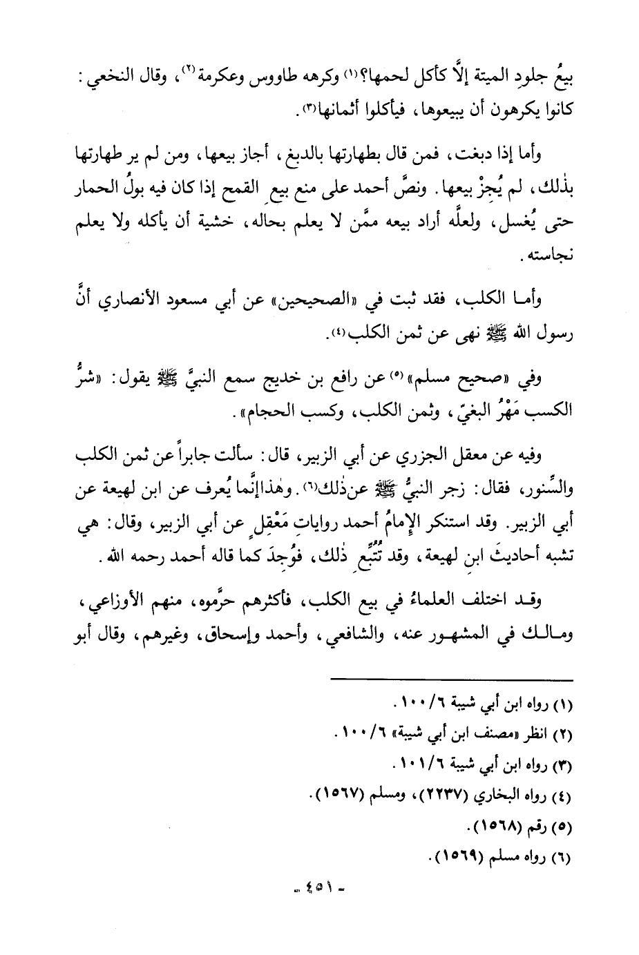 وَأَمَّا الْكَلْبُ، فَقَدْ ثَبَتَ فِي " الصَّحِيحَيْنِ " عَنْ أَبِي مَسْعُودٍ الْأَنْصَارِيِّ «أَنَّ رَسُولَ اللَّهِ صَلَّى اللَّهُ عَلَيْهِ وَسَلَّمَ نَهَى عَنْ ثَمَنِ الْكَلْبِ» . وَفِي " صَحِيحِ مُسْلِمٍ " عَنْ رَافِعِ بْنِ خَدِيجٍ سَمِعَ النَّبِيَّ صَلَّى اللَّهُ عَلَيْهِ وَسَلَّمَ، يَقُولُ: «شَرُّ الْكَسْبِ مَهْرُ الْبَغِيِّ، وَثَمَنُ الْكَلْبِ، وَكَسْبُ الْحَجَّامِ» . وَفِيهِ عَنْ مَعْقِلٍ الْجَزَرِيِّ «عَنْ أَبِي الزُّبَيْرِ، قَالَ: سَأَلْتُ جَابِرًا عَنْ ثَمَنِ الْكَلْبِ وَالسِّنَّوْرِ، فَقَالَ: زَجَرَ النَّبِيُّ صَلَّى اللَّهُ عَلَيْهِ وَسَلَّمَ عَنْ ذَلِكَ» . وَهَذَا مِمَّا يُعْرَفُ عَنِ ابْنِ لَهِيعَةَ عَنْ أَبِي الزُّبَيْرِ. وَقَدِ اسْتَنْكَرَ الْإِمَامُ أَحْمَدُ رِوَايَاتِ مَعْقِلٍ عَنْ أَبِي الزُّبَيْرِ، وَقَالَ: هِيَ تُشْبِهُ أَحَادِيثَ ابْنِ لَهِيعَةَ، وَقَدْ تَتَبَّعَ ذَلِكَ، فَوَجَدَ كَمَا قَالَهُ أَحْمَدُ رَحِمَهُ اللَّهُ. وَقَدِ اخْتَلَفَ الْعُلَمَاءُ فِي بَيْعِ الْكَلْبِ، فَأَكْثَرُهُمْ حَرَّمُوهُ، مِنْهُمُ الْأَوْزَاعِيُّ، وَمَالِكٌ فِي الْمَشْهُورِ عَنْهُ، وَالشَّافِعِيُّ، وَأَحْمَدُ وَإِسْحَاقُ، وَغَيْرُهُمْ وَقَالَ أَبُو