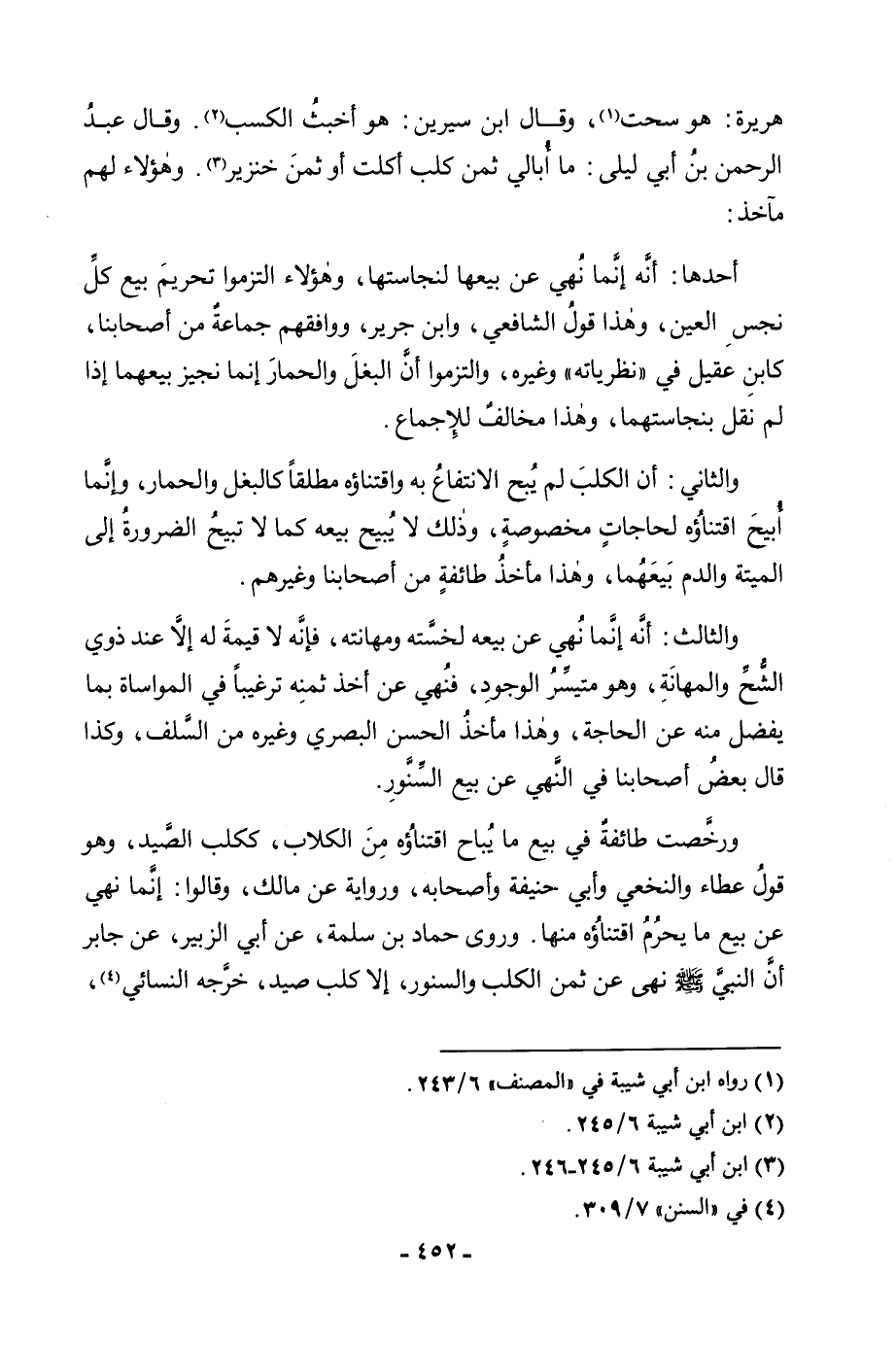 هُرَيْرَةَ: هُوَ سُحْتٌ، وَقَالَ ابْنُ سِيرِينَ: هُوَ أَخْبَثُ الْكَسْبِ، وَقَالَ عَبْدُ الرَّحْمَنِ بْنُ أَبِي لَيْلَى: مَا أُبَالِي ثَمَنُ كَلْبٍ أَكَلْتُ أَوْ ثَمَنُ خِنْزِيرٍ. وَهَؤُلَاءِ لَهُمْ مَآخِذُ: أَحَدُهَا: أَنَّهُ إِنَّمَا نُهِيَ عَنْ بَيْعِهَا لِنَجَاسَتِهَا، وَهَؤُلَاءِ الْتَزَمُوا تَحْرِيمَ بَيْعِ كُلِّ نَجِسِ الْعَيْنِ، وَهَذَا قَوْلُ الشَّافِعِيِّ، وَابْنِ جَرِيرٍ، وَوَافَقَهُمْ جَمَاعَةٌ مِنْ أَصْحَابِنَا، كَابْنِ عَقِيلٍ " فِي نَظَرِيَّاتِهِ " وَغَيْرِهِ، وَالْتَزَمُوا أَنَّ الْبَغْلَ وَالْحِمَارَ إِنَّمَا نُجِيزُ بَيْعَهُمَا إِذَا لَمْ نَقُلَ بِنَجَاسَتِهِمَا، وَهَذَا مُخَالِفٌ لِلْإِجْمَاعِ. وَالثَّانِي: أَنَّ الْكَلْبَ لَمْ يُبَحِ الِانْتِفَاعُ بِهِ وَاقْتِنَاؤُهُ مُطْلَقًا كَالْبَغْلِ وَالْحِمَارِ، وَإِنَّمَا أُبِيحَ اقْتِنَاؤُهُ لِحَاجَاتٍ مَخْصُوصَةٍ، وَذَلِكَ لَا يُبِيحُ بَيْعُهُ كَمَا لَا يُبِيحُ الضَّرُورَةَ إِلَى الْمَيْتَةِ وَالدَّمِ بَيْعُهُمَا، وَهَذَا مَأْخَذُ طَائِفَةٍ مِنْ أَصْحَابِنَا وَغَيْرِهِمْ. وَالثَّالِثُ: أَنَّهُ إِنَّمَا نُهِيَ عَنْ بَيْعِهِ لِخِسَّتِهِ وَمَهَانَتِهِ، فَإِنَّهُ لَا قِيمَةَ لَهُ إِلَّا عِنْدَ ذَوِي الشُّحِّ وَالْمَهَانَةِ، وَهُوَ مُتَيَسِّرُ الْوُجُودِ، فَنُهِيَ عَنْ أَخْذِ ثَمَنِهِ تَرْغِيبًا فِي الْمُوَاسَاةِ بِمَا يَفْضُلُ مِنْهُ عَنِ الْحَاجَةِ، وَهَذَا مَأْخَذُ الْحَسَنِ الْبَصْرِيِّ وَغَيْرِهِ مِنَ السَّلَفِ، وَكَذَا قَالَ بَعْضُ أَصْحَابِنَا فِي النَّهْيِ عَنْ بَيْعِ السِّنَّوْرِ. وَرَخَّصَتْ طَائِفَةٌ فِي بَيْعِ مَا يُبَاحُ اقْتِنَاؤُهُ مِنَ الْكِلَابِ، كَكَلْبِ الصَّيْدِ، وَهُوَ قَوْلُ عَطَاءٍ وَالنَّخَعِيِّ وَأَبِي حَنِيفَةَ وَأَصْحَابِهِ، وَرِوَايَةٌ عَنْ مَالِكٍ، وَقَالُوا: إِنَّمَا نُهِيَ عَنْ بَيْعِ مَا يَحْرُمُ اقْتِنَاؤُهُ مِنْهَا. وَرَوَى حَمَّادُ بْنُ سَلَمَةَ، عَنْ أَبِي الزُّبَيْرِ، عَنْ جَابِرٍ «أَنَّ النَّبِيَّ صَلَّى اللَّهُ عَلَيْهِ وَسَلَّمَ نَهَى عَنْ ثَمَنِ الْكَلْبِ وَالسِّنَّوْرِ، إِلَّا كَلْبَ صَيْدٍ» ، خَرَّجَهُ النَّسَائِيُّ،