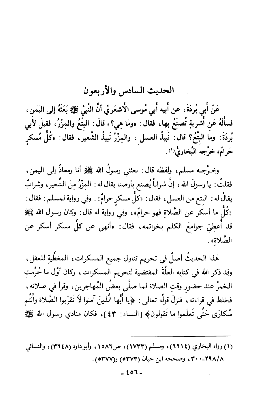الْحَدِيثُ السَّادِسُ وَالْأَرْبَعُونَ. عَنْ أَبِي بُرْدَةَ، عَنْ أَبِيهِ، «عَنْ أَبِي مُوسَى الْأَشْعَرِيِّ أَنَّ النَّبِيَّ صَلَّى اللَّهُ عَلَيْهِ وَسَلَّمَ بَعَثَهُ إِلَى الْيَمَنِ، فَسَأَلَهُ عَنْ أَشْرِبَةٍ تُصْنَعُ بِهَا، فَقَالَ: وَمَا هِيَ؟ قَالَ: الْبِتْعُ وَالْمِزْرُ، فَقِيلَ لِأَبِي بُرْدَةَ: وَمَا الْبِتْعُ؟ قَالَ: نَبِيذُ الْعَسَلِ، وَالْمِزْرُ نَبِيذُ الشَّعِيرِ، فَقَالَ: كُلُّ مُسْكِرٍ حَرَامٌ» خَرَّجَهُ الْبُخَارِيُّ.