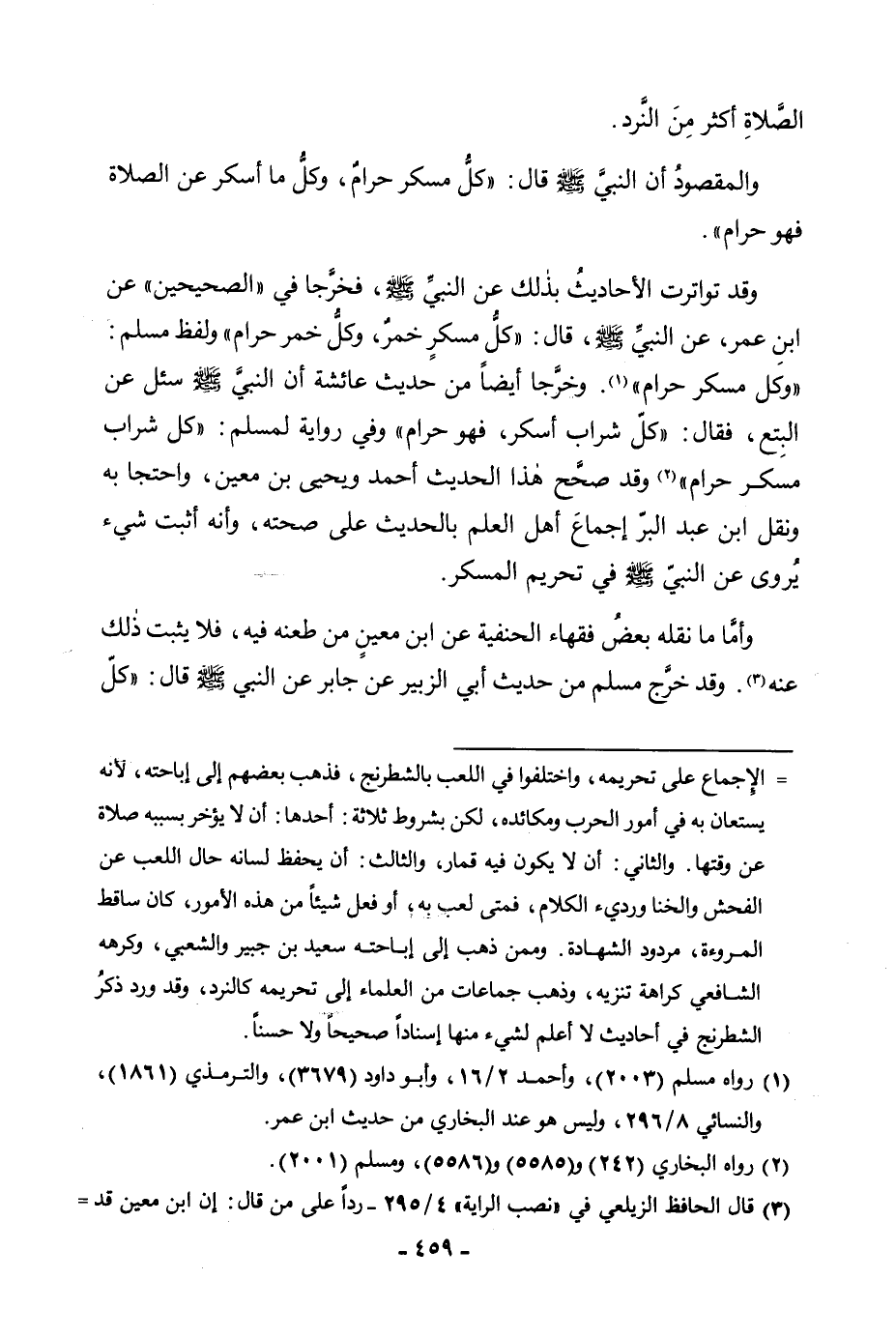 الصَّلَاةِ أَكْثَرَ مِنَ النَّرْدِ. وَالْمَقْصُودُ أَنَّ النَّبِيَّ صَلَّى اللَّهُ عَلَيْهِ وَسَلَّمَ قَالَ: «كُلُّ مُسْكِرٍ حَرَامٌ، وَكُلُّ مَا أَسْكَرَ عَنِ الصَّلَاةِ فَهُوَ حَرَامٌ» . وَقَدْ تَوَاتَرَتِ الْأَحَادِيثُ بِذَلِكَ عَنِ النَّبِيِّ صَلَّى اللَّهُ عَلَيْهِ وَسَلَّمَ، فَخَرَّجَا فِي " الصَّحِيحَيْنِ " عَنِ ابْنِ عُمَرَ، عَنِ النَّبِيِّ صَلَّى اللَّهُ عَلَيْهِ وَسَلَّمَ، قَالَ: «كُلُّ مُسْكِرٍ خَمْرٌ، وَكُلُّ خَمْرٍ حَرَامٌ» وَلَفْظُ مُسْلِمٍ: «وَكُلُّ مُسْكِرٍ حَرَامٌ» . وَخَرَّجَ أَيْضًا مِنْ حَدِيثِ عَائِشَةَ «أَنَّ النَّبِيَّ صَلَّى اللَّهُ عَلَيْهِ وَسَلَّمَ سُئِلَ عَنِ الْبِتْعِ، فَقَالَ: كُلُّ شَرَابٍ أَسْكَرَ فَهُوَ حَرَامٌ» وَفِي رِوَايَةٍ لِمُسْلِمٍ: «كُلُّ شَرَابٍ مُسْكِرٍ حَرَامٌ» وَقَدْ صَحَّحَ هَذَا الْحَدِيثَ أَحْمَدُ وَيَحْيَى بْنُ مَعِينٍ وَأَصْحَابُهُ وَاحْتَجَّا بِهِ، وَنَقَلَ ابْنُ عَبْدِ الْبَرِّ إِجْمَاعَ أَهْلِ الْعِلْمِ بِالْحَدِيثِ عَلَى صِحَّتِهِ، وَأَنَّهُ أَثْبَتُ شَيْءٍ يُرْوَى عَنِ النَّبِيِّ صَلَّى اللَّهُ عَلَيْهِ وَسَلَّمَ فِي تَحْرِيمِ الْمُسْكِرِ. وَأَمَّا مَا نَقَلَهُ بَعْضُ فُقَهَاءِ الْحَنَفِيَّةِ عَنِ ابْنِ مَعِينٍ مِنْ طَعْنِهِ فِيهِ، فَلَا يَثْبُتُ ذَلِكَ عَنْهُ. وَخَرَّجَ مُسْلِمٌ مِنْ حَدِيثِ أَبِي الزُّبَيْرِ عَنْ جَابِرٍ عَنِ النَّبِيِّ صَلَّى اللَّهُ عَلَيْهِ وَسَلَّمَ قَالَ: «كُلُّ