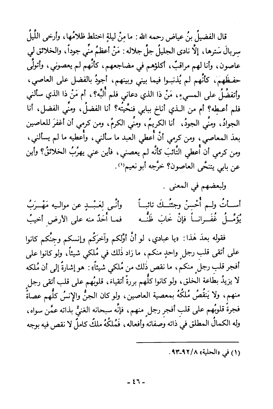 قَالَ الْفُضَيْلُ بْنُ عِيَاضٍ رَحِمَهُ اللَّهُ: مَا مِنْ لَيْلَةٍ اخْتَلَطَ ظَلَامُهَا، وَأَرْخَى اللَّيْلُ سِرْبَالَ سِتْرِهَا، إِلَّا نَادَى الْجَلِيلُ جَلَّ جَلَالُهُ: مَنْ أَعْظَمُ مِنِّي جُودًا، وَالْخَلَائِقُ لِي عَاصُونَ، وَأَنَا لَهُمْ مُرَاقِبٌ، أَكْلَؤُهُمْ فِي مَضَاجِعِهِمْ، كَأَنَّهُمْ لَمْ يَعْصُونِي، وَأَتَوَلَّى حِفْظَهُمْ كَأَنَّهُمْ لَمْ يُذْنِبُوا فِيمَا بَيْنِي وَبَيْنَهُمْ، أَجُودُ بِالْفَضْلِ عَلَى الْعَاصِي، وَأَتَفَضَّلُ عَلَى الْمُسِيءِ، مَنْ ذَا الَّذِي دَعَانِي فَلَمْ أُلَبِّهِ؟ أَمْ مَنْ ذَا الَّذِي سَأَلَنِي فَلَمْ أُعْطِهِ؟ أَمْ مَنِ الَّذِي أَنَاخَ بِبَابِي فَنَحَّيْتُهُ؟ أَنَا الْفَضْلُ، وَمِنِّي الْفَضْلُ، أَنَا الْجَوَادُ، وَمِنِّي الْجُودُ، وَأَنَا الْكَرِيمُ، وَمِنِّي الْكَرَمُ، وَمِنْ كَرَمِي أَنْ أَغْفِرَ لِلْعَاصِينَ بَعْدَ الْمَعَاصِي، وَمِنْ كَرَمِي أَنْ أُعْطِيَ الْعَبْدَ مَا سَأَلَنِي، وَأُعْطِيَهُ مَا لَمْ يَسْأَلْنِي، وَمِنْ كَرَمِي أَنْ أُعْطِيَ التَّائِبَ كَأَنَّهُ لَمْ يَعْصِنِي، فَأَيْنَ عَنِّي يَهْرُبُ الْخَلَائِقُ؟ وَأَيْنَ عَنْ بَابِي يَتَنَحَّى الْعَاصُونَ؟ خَرَّجَهُ أَبُو نُعَيْمٍ. وَلِبَعْضِهِمْ فِي الْمَعْنَى.