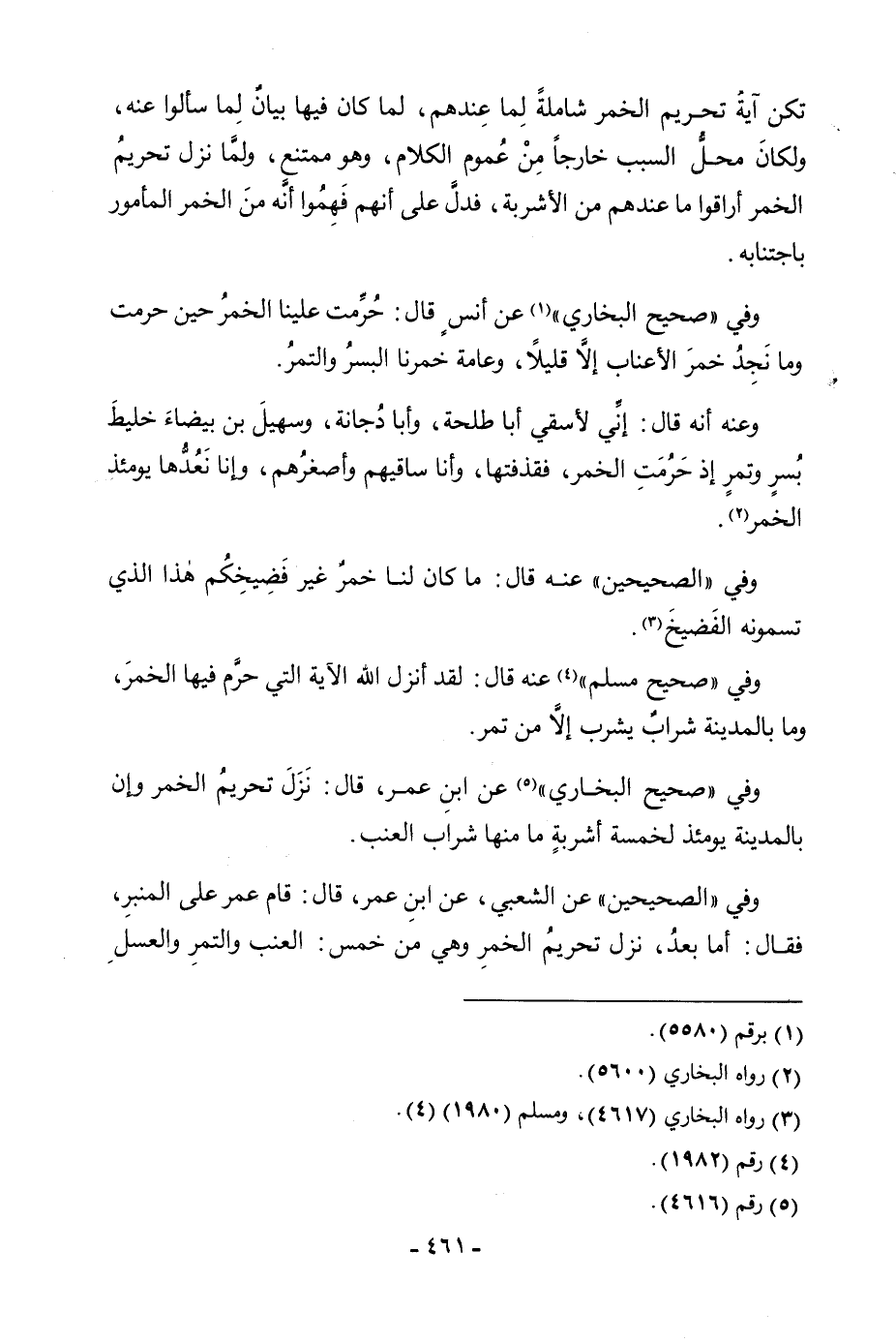 تَكُنْ آيَةُ تَحْرِيمِ الْخَمْرِ شَامِلَةً لِمَا عِنْدَهُمْ، لَمَا كَانَ فِيهَا بَيَانٌ لِمَا سَأَلُوا عَنْهُ، وَلَكَانَ مَحَلُّ السَّبَبِ خَارِجًا مِنْ عُمُومِ الْكَلَامِ، وَهُوَ مُمْتَنِعٌ، وَلَمَّا نَزَلَ تَحْرِيمُ الْخَمْرِ أَرَاقُوا مَا عِنْدَهُمْ مِنَ الْأَشْرِبَةِ، فَدَلَّ عَلَى أَنَّهُمْ فَهِمُوا أَنَّهُ مِنَ الْخَمْرِ الْمَأْمُورِ بِاجْتِنَابِهِ. وَفِي " صَحِيحِ الْبُخَارِيِّ " عَنْ أَنَسٍ قَالَ: حُرِّمَتْ عَلَيْنَا الْخَمْرُ حِينَ حُرِّمَتْ وَمَا نَجِدُ خَمْرَ الْأَعْنَابِ إِلَّا قَلِيلًا، وَعَامَّةُ خَمْرِنَا الْبُسْرُ وَالتَّمْرُ. وَعَنْهُ أَنَّهُ قَالَ: إِنِّي لَأَسْقِي أَبَا طَلْحَةَ، وَأَبَا دُجَانَةَ، وَسُهَيْلَ بْنَ بَيْضَاءَ خَلِيطَ بُسْرٍ وَتَمْرٍ إِذْ حُرِّمَتِ الْخَمْرُ، فَقَذَفْتُهَا، وَأَنَا سَاقِيهِمْ وَأَصْغَرُهُمْ، وَإِنَّا نَعُدُّهَا يَوْمَئِذٍ الْخَمْرَ. وَفِي " الصَّحِيحَيْنِ " عَنْهُ قَالَ: مَا كَانَ لَنَا خَمْرٌ غَيْرَ فَضِيخِكُمْ هَذَا الَّذِي تُسَمُّونَهُ الْفَضِيخَ. وَفِي " صَحِيحِ مُسْلِمٍ " عَنْهُ قَالَ: «لَقَدْ أَنْزَلَ اللَّهُ الْآيَةَ الَّتِي حَرَّمَ فِيهَا الْخَمْرَ، وَمَا بِالْمَدِينَةِ شَرَابٌ يُشْرَبُ إِلَّا مِنْ تَمْرٍ» . وَفِي " صَحِيحِ الْبُخَارِيِّ " عَنِ ابْنِ عُمَرَ، قَالَ: نَزَلَ تَحْرِيمُ الْخَمْرِ وَإِنَّ بِالْمَدِينَةِ يَوْمَئِذَ لَخَمْسَةَ أَشْرِبَةٍ مَا مِنْهَا شَرَابُ الْعِنَبِ. وَفِي " الصَّحِيحَيْنِ " عَنِ الشَّعْبِيِّ، عَنِ ابْنِ عُمَرَ، قَالَ: قَامَ عُمَرُ عَلَى الْمِنْبَرِ، فَقَالَ: أَمَّا بَعْدُ، نَزَلَ تَحْرِيمُ الْخَمْرِ وَهِيَ مِنْ خَمْسٍ: الْعِنَبِ، وَالتَّمْرِ، وَالْعَسَلِ