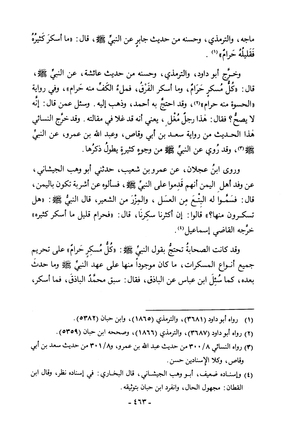 مَاجَهْ، وَالتِّرْمِذِيُّ، وَحَسَّنَهُ مِنْ حَدِيثِ جَابِرٍ عَنِ النَّبِيِّ صَلَّى اللَّهُ عَلَيْهِ وَسَلَّمَ، قَالَ: «مَا أَسْكَرَ كَثِيرُهُ فَقَلِيلُهُ حَرَامٌ» . وَخَرَّجَ أَبُو دَاوُدَ، وَالتِّرْمِذِيُّ، وَحَسَّنَهُ مِنْ حَدِيثِ عَائِشَةَ، عَنِ النَّبِيِّ صَلَّى اللَّهُ عَلَيْهِ وَسَلَّمَ، قَالَ: «كُلُّ مُسْكِرٍ حَرَامٌ، وَمَا أَسْكَرَ الْفَرْقُ، فَمَلْءُ الْكَفِّ مِنْهُ حَرَامٌ» ، وَفِي رِوَايَةٍ «الْحَسْوَةُ مِنْهُ حَرَامٌ» ، وَقَدِ احْتَجَّ بِهِ أَحْمَدُ وَذَهَبَ إِلَيْهِ. وَسُئِلَ عَمَّنْ قَالَ: إِنَّهُ لَا يَصِحُّ؟ فَقَالَ: هَذَا رَجُلٌ مُغْلٍ، يَعْنِي أَنَّهُ قَدْ غَلَا فِي مَقَالَتِهِ. وَقَدْ خَرَّجَ النَّسَائِيُّ هَذَا الْحَدِيثَ مِنْ رِوَايَةِ سَعْدِ بْنِ أَبِي وَقَّاصٍ، وَعَبْدِ اللَّهِ بْنِ عَمْرٍو، عَنِ النَّبِيِّ صَلَّى اللَّهُ عَلَيْهِ وَسَلَّمَ، وَقَدْ رُوِيَ عَنِ النَّبِيِّ صَلَّى اللَّهُ عَلَيْهِ وَسَلَّمَ مِنْ وُجُوهٍ كَثِيرَةٍ يَطُولُ ذِكْرُهَا. وَرَوَى ابْنُ عَجْلَانَ، عَنْ عَمْرِو بْنِ شُعَيْبٍ، حَدَّثَنِي أَبُو وُهَيْبٍ الْجَيْشَانِيُّ، «عَنْ وَفْدِ أَهْلِ الْيَمَنِ أَنَّهُمْ قَدِمُوا عَلَى النَّبِيِّ صَلَّى اللَّهُ عَلَيْهِ وَسَلَّمَ، فَسَأَلُوهُ عَنْ أَشْرِبَةٍ تَكُونُ بِالْيَمَنِ، قَالَ: فَسَمَّوْا لَهُ الْبِتْعَ مِنَ الْعَسَلِ، وَالْمِزْرَ مِنَ الشَّعِيرِ، قَالَ النَّبِيُّ صَلَّى اللَّهُ عَلَيْهِ وَسَلَّمَ: هَلْ تَسْكَرُونَ مِنْهَا؟ قَالُوا: إِنْ أَكْثَرْنَا سَكِرْنَا، قَالَ: فَحَرَامٌ قَلِيلُهُ مَا أَسْكَرَ كَثِيرُهُ» خَرَّجَهُ الْقَاضِي إِسْمَاعِيلُ. وَقَدْ كَانَتِ الصَّحَابَةُ تَحْتَجُّ بِقَوْلِ النَّبِيِّ صَلَّى اللَّهُ عَلَيْهِ وَسَلَّمَ: «كُلُّ مُسْكِرٍ حَرَامٌ» عَلَى تَحْرِيمِ جَمِيعِ أَنْوَاعِ الْمُسْكِرَاتِ، مَا كَانَ مَوْجُودًا مِنْهَا عَلَى عَهْدِ النَّبِيِّ صَلَّى اللَّهُ عَلَيْهِ وَسَلَّمَ وَمَا حَدَثَ بَعْدَهُ، كَمَا سُئِلَ ابْنُ عَبَّاسٍ عَنِ الْبَاذِقِ، فَقَالَ: سَبَقَ مُحَمَّدٌ الْبَاذِقَ، فَمَا أَسْكَرَ،