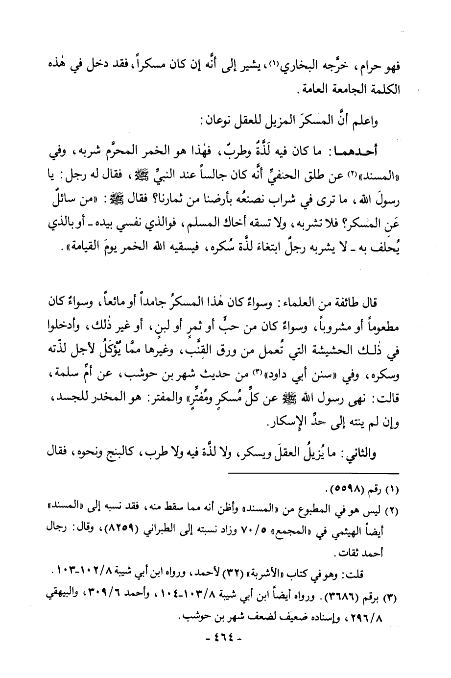 وَاعْلَمْ أَنَّ الْمُسْكِرَ الْمُزِيلَ لِلْعَقْلِ نَوْعَانِ: أَحَدُهُمَا: مَا كَانَ فِيهِ لَذَّةٌ وَطَرَبٌ، فَهَذَا هُوَ الْخَمْرُ الْمُحَرَّمُ شُرْبُهُ، وَفِي " الْمُسْنَدِ " «عَنْ طَلْقٍ الْحَنَفِيِّ أَنَّهُ كَانَ جَالِسًا عِنْدَ النَّبِيِّ صَلَّى اللَّهُ عَلَيْهِ وَسَلَّمَ، فَقَالَ لَهُ رَجُلٌ: يَا رَسُولَ اللَّهِ، مَا تَرَى فِي شَرَابٍ نَصْنَعُهُ بِأَرْضِنَا مِنْ ثِمَارِنَا؟ فَقَالَ صَلَّى اللَّهُ عَلَيْهِ وَسَلَّمَ: مَنْ سَائِلٌ عَنِ الْمُسْكِرِ؟ فَلَا تَشْرَبْهُ، وَلَا تَسْقِهِ أَخَاكَ الْمُسْلِمَ، فَوَالَّذِي نَفْسِي بِيَدِهِ - أَوْ بِالَّذِي يُحْلَفُ بِهِ - لَا يَشْرَبُهُ رَجُلٌ ابْتِغَاءَ لَذَّةِ سُكْرِهِ، فَيَسْقِيهِ اللَّهُ الْخَمْرَ يَوْمَ الْقِيَامَةِ» . قَالَ طَائِفَةٌ مِنَ الْعُلَمَاءِ: وَسَوَاءٌ كَانَ هَذَا الْمُسْكِرُ جَامِدًا أَوْ مَائِعًا، وَسَوَاءٌ كَانَ مَطْعُومًا أَوْ مَشْرُوبًا، وَسَوَاءٌ كَانَ مِنْ حَبٍّ أَوْ ثَمَرٍ أَوْ لَبَنٍ، أَوْ غَيْرِ ذَلِكَ، وَأَدْخَلُوا فِي ذَلِكَ الْحَشِيشَةَ الَّتِي تُعْمَلُ مِنْ وَرَقِ الْقِنَّبِ، وَغَيْرَهَا مِمَّا يُؤْكَلُ لِأَجْلِ لَذَّتِهِ وَسُكْرِهِ، وَفِي " سُنَنِ أَبِي دَاوُدَ " مِنْ حَدِيثِ شَهْرِ بْنِ حَوْشَبٍ، عَنْ أُمِّ سَلَمَةَ، قَالَتْ: «نَهَى رَسُولُ اللَّهِ صَلَّى اللَّهُ عَلَيْهِ وَسَلَّمَ عَنْ كُلِّ مُسْكِرٍ وَمُفَتِّرٍ» وَالْمُفَتِّرُ: هُوَ الْمُخَدِّرُ لِلْجَسَدِ، وَإِنْ لَمْ يَنْتَهِ إِلَى حَدِّ الْإِسْكَارِ. وَالثَّانِي: مَا يُزِيلُ الْعَقْلَ وَيُسْكِرُ، لَا لَذَّةَ فِيهِ وَلَا طَرَبَ، كَالْبِنْجِ وَنَحْوِهِ، فَقَالَ