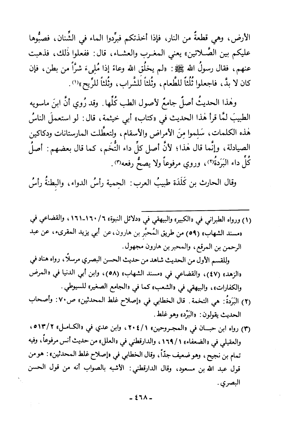 الْأَرْضِ، وَهِيَ قِطْعَةٌ مِنَ النَّارِ، فَإِذَا أَخَذَتْكُمْ فَبَرِّدُوا الْمَاءَ فِي الشِّنَانِ، فَصُبُّوهَا عَلَيْكُمْ بَيْنَ الصَّلَاتَيْنِ يَعْنِي الْمَغْرِبَ وَالْعَشَاءَ، قَالَ: فَفَعَلُوا ذَلِكَ، فَذَهَبَتْ عَنْهُمْ، فَقَالَ رَسُولُ اللَّهِ صَلَّى اللَّهُ عَلَيْهِ وَسَلَّمَ: لَمْ يَخْلُقِ اللَّهُ وِعَاءً إِذَا مُلِئَ شَرًّا مِنْ بَطْنٍ، فَإِنْ كَانَ لَا بُدَّ، فَاجْعَلُوا ثُلُثًا لِلطَّعَامِ، وَثُلُثًا لِلشَّرَابِ، وَثُلُثًا لِلرِّيحِ.» وَهَذَا الْحَدِيثُ أَصْلٌ جَامِعٌ لِأُصُولِ الطِّبِّ كُلِّهَا. وَقَدْ رُوِيَ أَنَّ ابْنَ مَاسَوَيْهِ الطَّبِيبَ لَمَّا قَرَأَ هَذَا الْحَدِيثَ فِي " كِتَابِ " أَبِي خَيْثَمَةَ، قَالَ: لَوِ اسْتَعْمَلَ النَّاسُ هَذِهِ الْكَلِمَاتِ، سَلِمُوا مِنَ الْأَمْرَاضِ وَالْأَسْقَامِ، وَلَتَعَطَّلَتِ الْمَارِسْتَانَاتُ وَدَكَاكِينُ الصَّيَادِلَةِ، وَإِنَّمَا قَالَ هَذَا؛ لِأَنَّ أَصْلَ كُلِّ دَاءٍ التُّخَمُ، كَمَا قَالَ بَعْضُهُمْ: أَصْلُ كُلِّ دَاءٍ الْبَرَدَةُ، وَرُوِيَ مَرْفُوعًا وَلَا يَصِحُّ رَفْعُهُ. وَقَالَ الْحَارِثُ بْنُ كَلَدَةِ طَبِيبُ الْعَرَبِ: الْحَمِيَّةُ رَأْسُ الدَّوَاءِ، وَالْبِطْنَةُ رَأْسُ