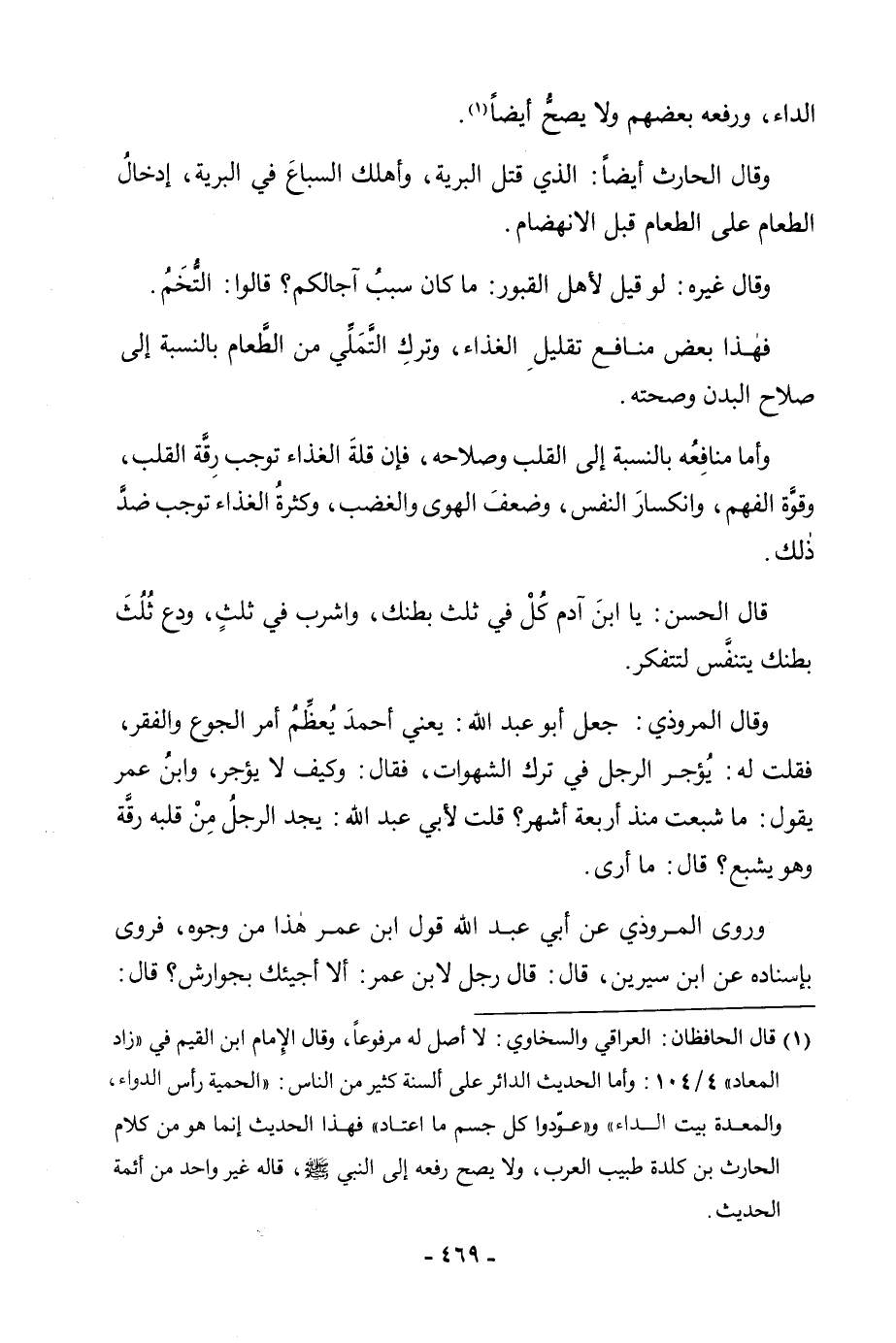 الدَّاءِ، وَرَفَعَهُ بَعْضُهُمْ وَلَا يَصِحُّ أَيْضًا. وَقَالَ الْحَارِثُ أَيْضًا: الَّذِي قَتَلَ الْبَرِيَّةَ، وَأَهْلَكَ السِّبَاعَ فِي الْبَرِّيَّةِ إِدْخَالُ الطَّعَامِ عَلَى الطَّعَامِ قَبْلَ الِانْهِضَامِ. وَقَالَ غَيْرُهُ: لَوْ قِيلَ لِأَهْلِ الْقُبُورِ: مَا كَانَ سَبَبُ آجَالِكُمْ؟ قَالُوا: التُّخَمُ. فَهَذَا بَعْضُ مَنَافِعِ تَقْلِيلِ الْغِذَاءِ، وَتَرْكِ التَّمَلِّي مِنَ الطَّعَامِ بِالنِّسْبَةِ إِلَى صَلَاحِ الْبَدَنِ وَصِحَّتِهِ. وَأَمَّا مَنَافِعُهُ بِالنِّسْبَةِ إِلَى الْقَلْبِ وَصَلَاحِهِ، فَإِنَّ قِلَّةَ الْغِذَاءِ تُوجِبُ رِقَّةَ الْقَلْبِ، وَقُوَّةَ الْفَهْمِ، وَانْكِسَارَ النَّفْسِ، وَضَعْفَ الْهَوَى وَالْغَضَبِ، وَكَثْرَةُ الْغِذَاءِ تُوجِبُ ضِدَّ ذَلِكَ. قَالَ الْحَسَنُ: يَابْنَ آدَمَ كُلْ فِي ثُلُثِ بَطْنِكَ، وَاشْرَبْ فِي ثُلُثِهِ، وَدَعْ ثُلَثَ بَطْنِكَ يَتَنَفَّسُ لِتَتَفَكَّرَ. وَقَالَ الْمَرْوَذِيُّ: جَعَلَ أَبُو عَبْدِ اللَّهِ، يَعْنِي أَحْمَدَ يُعَظِّمُ أَمْرَ الْجُوعِ وَالْفَقْرِ، فَقُلْتُ لَهُ: يُؤْجَرُ الرَّجُلُ فِي تَرْكِ الشَّهَوَاتِ، فَقَالَ: وَكَيْفَ لَا يُؤْجَرُ، وَابْنُ عُمَرَ يَقُولُ: مَا شَبِعْتُ مُنْذُ أَرْبَعَةِ أَشْهُرٍ؟ قُلْتُ لِأَبِي عَبْدِ اللَّهِ: يَجِدُ الرَّجُلُ مِنْ قَلْبِهِ رِقَّةً وَهُوَ يَشْبَعُ؟ قَالَ: مَا أَرَى. وَرَوَى الْمَرْوَذِيُّ عَنْ أَبِي عَبْدِ اللَّهِ قَوْلَ ابْنِ عُمَرَ هَذَا مِنْ وُجُوهٍ، فَرَوَى بِإِسْنَادِهِ عَنِ ابْنِ سِيرِينَ، قَالَ: قَالَ رَجُلٌ لِابْنِ عُمَرَ: أَلَا أَجِيئُكَ بِجَوَارِشَ؟ قَالَ: