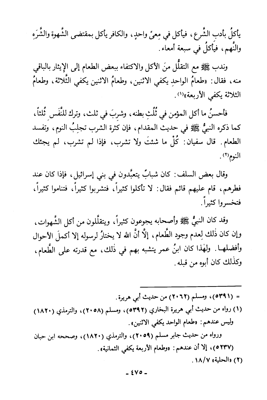 يَأْكُلُ بِأَدَبِ الشَّرْعِ، فَيَأْكُلُ فِي مِعًى وَاحِدٍ وَالْكَافِرُ يَأْكُلُ بِمُقْتَضَى الشَّهْوَةِ وَالشَّرَهِ وَالنَّهَمِ، فَيَأْكُلُ فِي سَبْعَةِ أَمْعَاءٍ. وَنَدَبَ - صَلَّى اللَّهُ عَلَيْهِ وَسَلَّمَ - مَعَ التَّقَلُّلِ مِنَ الْأَكْلِ وَالِاكْتِفَاءِ بِبَعْضِ الطَّعَامِ إِلَى الْإِيثَارِ بِالْبَاقِي مِنْهُ، فَقَالَ: «طَعَامُ الْوَاحِدِ يَكْفِي الِاثْنَيْنِ، وَطَعَامُ الِاثْنَيْنِ يَكْفِي الثَّلَاثَةَ، وَطَعَامُ الثَّلَاثَةِ يَكْفِي الْأَرْبَعَةَ فَأَحْسَنُ مَا أَكَلَ الْمُؤْمِنُ فِي ثُلُثِ بَطْنِهِ، وَشَرِبَ فِي ثُلُثٍ، وَتَرَكَ لِلنَّفْسِ ثُلُثًا» ، كَمَا ذَكَرَهُ النَّبِيُّ - صَلَّى اللَّهُ عَلَيْهِ وَسَلَّمَ - فِي حَدِيثِ الْمِقْدَامِ، فَإِنَّ كَثْرَةَ الشُّرْبِ تَجْلِبُ النَّوْمَ، وَتُفْسِدُ الطَّعَامَ. قَالَ سُفْيَانُ: كُلْ مَا شَئْتَ وَلَا تَشْرَبْ، فَإِذَا لَمْ تَشْرَبْ، لَمْ يَجِئْكَ النَّوْمُ. وَقَالَ بَعْضُ السَّلَفِ: كَانَ شَبَابٌ يَتَعَبَّدُونَ فِي بَنِي إِسْرَائِيلَ، فَإِذَا كَانَ عِنْدَ فِطْرِهِمْ، قَامَ عَلَيْهِمْ قَائِمٌ فَقَالَ: لَا تَأْكُلُوا كَثِيرًا، فَتَشْرَبُوا كَثِيرًا، فَتَنَامُوا كَثِيرًا، فَتَخْسَرُوا كَثِيرًا. وَقَدْ كَانَ النَّبِيُّ - صَلَّى اللَّهُ عَلَيْهِ وَسَلَّمَ - وَأَصْحَابُهُ يَجُوعُونَ كَثِيرًا، وَيَتَقَلَّلُونَ مِنْ أَكْلِ الشَّهَوَاتِ، وَإِنْ كَانَ ذَلِكَ لِعَدَمِ وُجُودِ الطَّعَامِ، إِلَّا أَنَّ اللَّهَ لَا يَخْتَارُ لِرَسُولِهِ إِلَّا أَكْمَلَ الْأَحْوَالِ وَأَفْضَلَهَا. وَلِهَذَا كَانَ ابْنُ عُمَرَ يَتَشَبَّهُ بِهِمْ فِي ذَلِكَ - مَعَ قُدْرَتِهِ عَلَى الطَّعَامِ - وَكَذَلِكَ كَانَ أَبُوهُ مِنْ قَبْلِهِ.