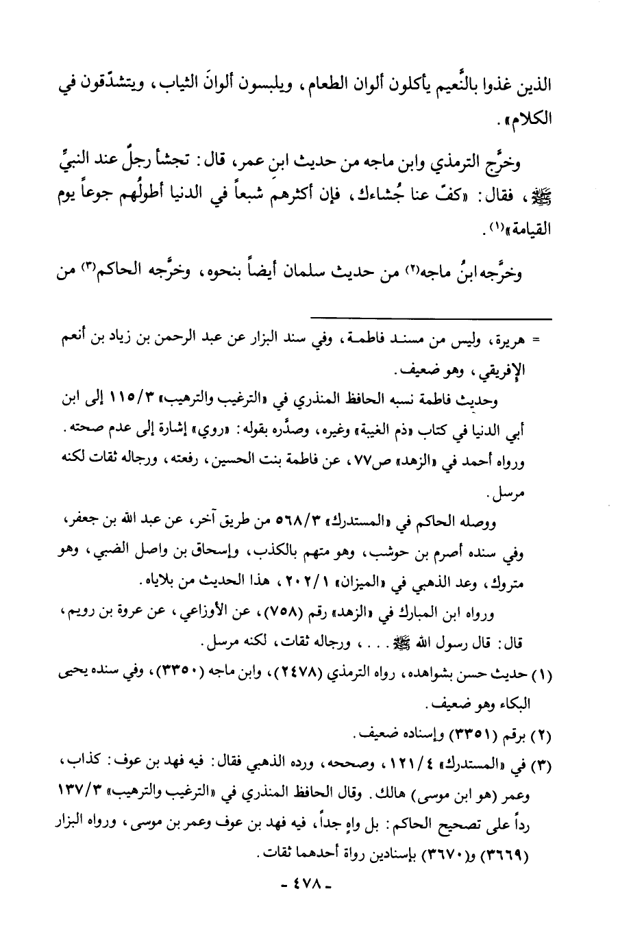 الَّذِينَ غُذُّوا بِالنَّعِيمِ يَأْكُلُونَ أَلْوَانَ الطَّعَامِ، وَيَلْبَسُونَ أَلْوَانَ الثِّيَابِ، وَيَتَشَدَّقُونَ فِي الْكَلَامِ» . وَخَرَّجَ التِّرْمِذِيُّ وَابْنُ مَاجَهْ مِنْ حَدِيثِ ابْنِ عُمَرَ، قَالَ: «تَجَشَّأَ رَجُلٌ عِنْدَ النَّبِيِّ - صَلَّى اللَّهُ عَلَيْهِ وَسَلَّمَ -، فَقَالَ: كُفَّ عَنَّا جُشَاءَكَ، فَإِنَّ أَكْثَرَهُمْ شِبَعًا فِي الدُّنْيَا أَطْوَلُهُمْ جُوعًا يَوْمَ الْقِيَامَةِ» . وَخَرَّجَهُ ابْنُ مَاجَهْ مِنْ حَدِيثِ سَلْمَانَ أَيْضًا بِنَحْوِهِ، وَخَرَّجَهُ الْحَاكِمُ مِنْ