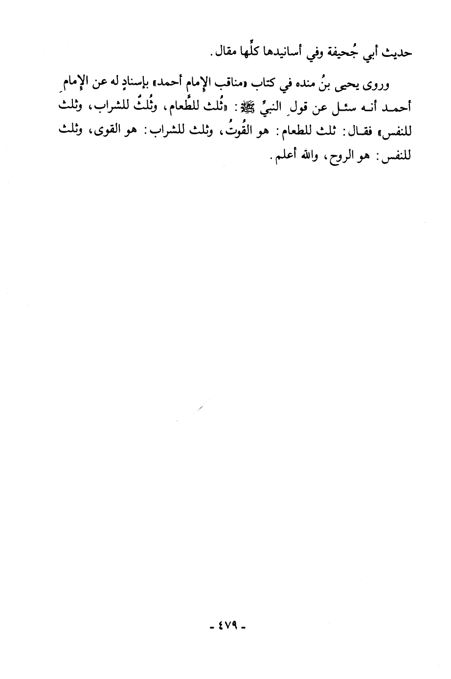 حَدِيثِ أَبِي جُحَيْفَةَ، وَفِي أَسَانِيدِهَا كُلِّهَا مَقَالٌ. وَرَوَى يَحْيَى بْنُ مَنْدَهْ فِي كِتَابِ " مَنَاقِبِ الْإِمَامِ أَحْمَدَ " بِإِسْنَادٍ لَهُ عَنِ الْإِمَامِ أَحْمَدَ أَنَّهُ سُئِلَ عَنْ قَوْلِ النَّبِيِّ - صَلَّى اللَّهُ عَلَيْهِ وَسَلَّمَ -: «ثُلُثٌ لِلطَّعَامِ، وَثُلُثٌ لِلشَّرَابِ، وَثُلُثٌ لِلنَّفَسِ» فَقَالَ: ثُلُثٌ لِلطَّعَامِ: هُوَ الْقُوتُ، وَثُلُثٌ لِلشَّرَابِ: هُوَ الْقُوَى، وَثُلُثٌ لِلنَّفْسِ: هُوَ الرُّوحُ وَاللَّهُ أَعْلَمُ.