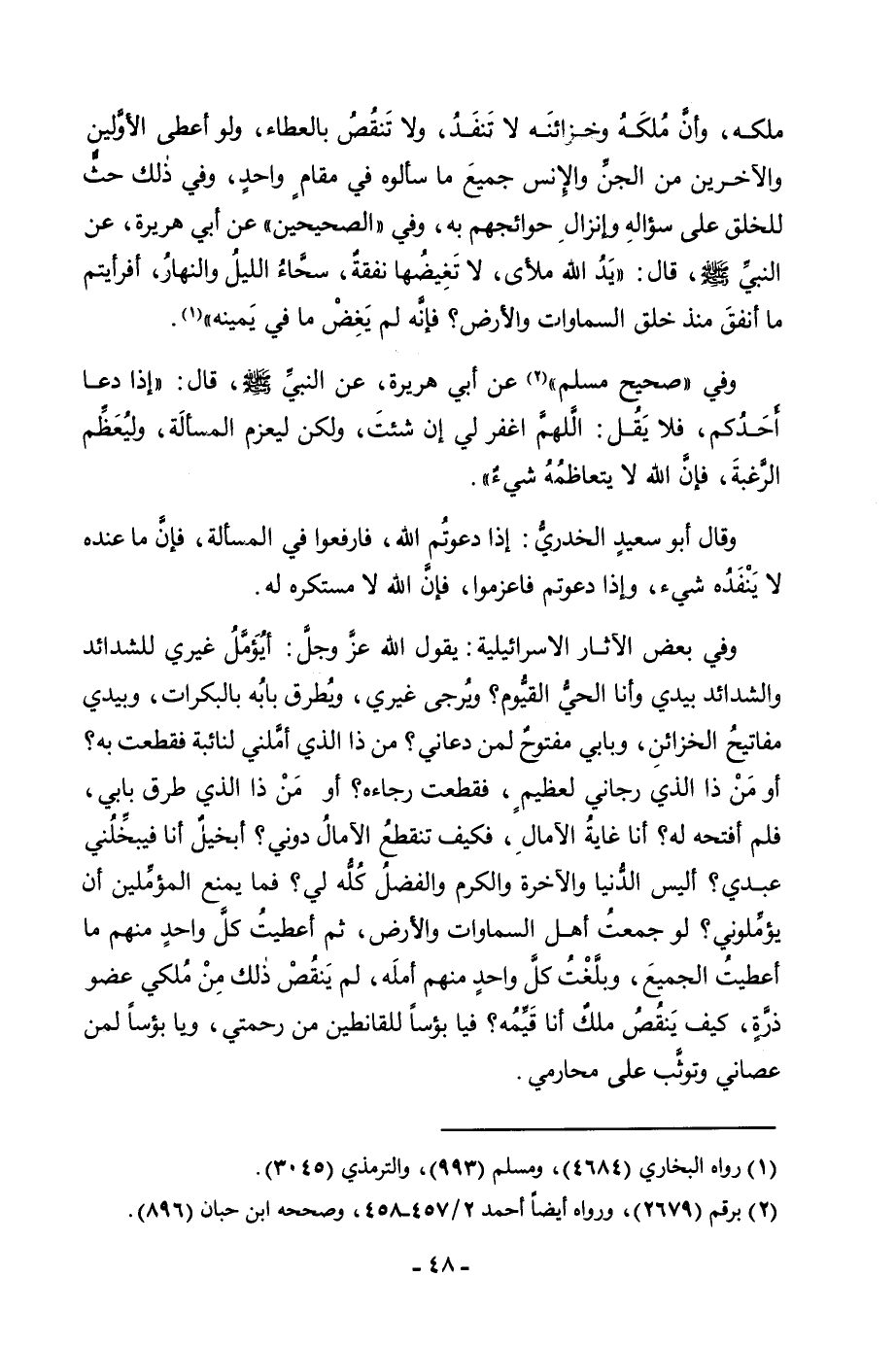 مُلْكِهِ، وَأَنَّ مُلْكَهُ وَخَزَائِنَهُ لَا تَنْفَدُ، وَلَا تَنْقُصُ بِالْعَطَاءِ، وَلَوْ أَعْطَى الْأَوَّلِينَ وَالْآخِرِينَ مِنَ الْجِنِّ وَالْإِنْسِ جَمِيعَ مَا سَأَلُوهُ فِي مَقَامٍ وَاحِدٍ، وَفِي ذَلِكَ حَثٌّ لِلْخَلْقِ عَلَى سُؤَالِهِ وَإِنْزَالِ حَوَائِجِهِمْ بِهِ، وَفِي " الصَّحِيحَيْنِ " عَنْ أَبِي هُرَيْرَةَ، عَنِ النَّبِيِّ صَلَّى اللَّهُ عَلَيْهِ وَسَلَّمَ قَالَ: «يَدُ اللَّهِ مَلْأَى لَا تَغِيضُهَا نَفَقَةٌ، سَحَّاءُ اللَّيْلَ وَالنَّهَارَ، أَفَرَأَيْتُمْ مَا أَنْفَقَ مُنْذُ خَلَقَ السَّمَاوَاتِ وَالْأَرْضَ؟ فَإِنَّهُ لَمْ يَغِضْ مَا فِي يَمِينِهِ» . وَفِي " صَحِيحِ مُسْلِمٍ " عَنْ أَبِي هُرَيْرَةَ، عَنِ النَّبِيِّ صَلَّى اللَّهُ عَلَيْهِ وَسَلَّمَ قَالَ: «إِذَا دَعَا أَحَدُكُمْ، فَلَا يَقُلْ: اللَّهُمَّ اغْفِرْ لِي إِنْ شِئْتَ، وَلَكِنْ لِيَعْزِمِ الْمَسْأَلَةَ، وَلْيُعَظِّمِ الرَّغْبَةَ، فَإِنَّ اللَّهَ لَا يَتَعَاظَمُهُ شَيْءٌ» . وَقَالَ أَبُو سَعِيدٍ الْخُدْرِيُّ: إِذَا دَعَوْتُمُ اللَّهَ، فَارْفَعُوا فِي الْمَسْأَلَةِ، فَإِنَّ مَا عِنْدَهُ لَا يَنْفَدُهُ شَيْءٌ، وَإِذَا دَعَوْتُمْ فَاعْزِمُوا، فَإِنَّ اللَّهَ لَا مُسْتَكْرِهَ لَهُ. وَفِي بَعْضِ الْآثَارِ الْإِسْرَائِيلِيَّةِ: يَقُولُ اللَّهُ عَزَّ وَجَلَّ: أَيُؤَمَّلُ غَيْرِي لِلشَّدَائِدِ وَالشَّدَائِدُ بِيَدِي وَأَنَا الْحَيُّ الْقَيُّومُ؟ وَيُرْجَى غَيْرِي، وَيُطْرَقُ بَابُهُ بِالْبَكَرَاتِ، وَبِيَدِي مَفَاتِيحُ الْخَزَائِنِ، وَبَابِي مَفْتُوحٌ لِمَنْ دَعَانِي؟ مَنْ ذَا الَّذِي أَمَّلَنِي لِنَائِبَةٍ فَقَطَعْتُ بِهِ؟ أَوْ مَنْ ذَا الَّذِي رَجَانِي لِعَظِيمٍ، فَقَطَعْتُ رَجَاءَهُ؟ أَوْ مَنْ ذَا الَّذِي طَرَقَ بَابِي، فَلَمْ أَفْتَحْهُ لَهُ؟ أَنَا غَايَةُ الْآمَالِ، فَكَيْفَ تَنْقَطِعُ الْآمَالُ دُونِي؟ أَبِخَيْلٌ أَنَا فَيُبَخِّلُنِي عَبْدِي؟ أَلَيْسَ الدُّنْيَا وَالْآخِرَةُ وَالْكَرْمُ وَالْفَضْلُ كُلُّهُ لِي؟ فَمَا يَمْنَعُ الْمُؤَمِّلِينَ أَنْ يُؤَمِّلُونِي؟ لَوْ جَمَعْتُ أَهْلَ السَّمَاوَاتِ وَالْأَرْضِ، ثُمَّ أَعْطَيْتُ كُلَّ وَاحِدٍ مِنْهُمْ مَا أَعْطَيْتُ الْجَمِيعَ، وَبَلَّغْتُ كُلَّ وَاحِدٍ أَمَلَهُ، لَمْ يَنْقُصْ ذَلِكَ مِنْ مُلْكِي عُضْوَ ذَرَّةٍ، كَيْفَ يَنْقُصُ مُلْكٌ أَنَا قَيِّمُهُ؟ فَيَا بُؤْسًا لِلْقَانِطِينَ مِنْ رَحْمَتِي، وَيَا بُؤْسًا لِمَنْ عَصَانِي وَتَوَثَّبَ عَلَى مَحَارِمِي.
