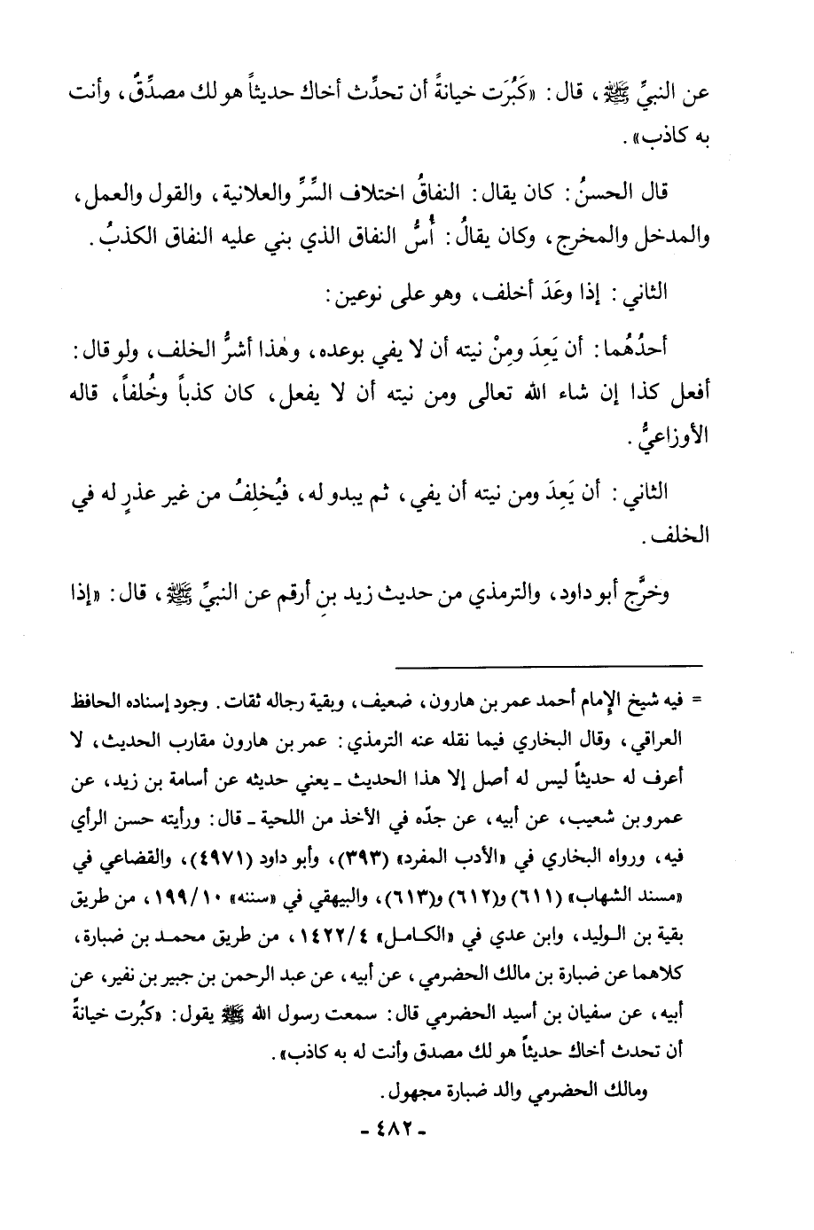 عَنِ النَّبِيِّ - صَلَّى اللَّهُ عَلَيْهِ وَسَلَّمَ -، قَالَ: «كَبُرَتْ خِيَانَةً أَنْ تُحَدِّثَ أَخَاكَ حَدِيثًا هُوَ لَكَ مُصَدِّقٌ، وَأَنْتَ بِهِ كَاذِبٌ» . قَالَ الْحَسَنُ: كَانَ يُقَالُ: النِّفَاقُ اخْتِلَافُ السِّرِّ وَالْعَلَانِيَةِ، وَالْقَوْلِ وَالْعَمَلِ، وَالْمَدْخَلِ وَالْمَخْرَجِ، وَكَانَ يُقَالُ: أُسُّ النِّفَاقِ الَّذِي بُنِيَ عَلَيْهِ الْكَذِبُ. وَالثَّانِي: إِذَا وَعَدَ أَخْلَفَ، وَهُوَ عَلَى نَوْعَيْنِ: أَحَدُهُمَا: أَنْ يَعِدَ وَمِنْ نِيَّتِهِ أَنْ لَا يَفِيَ بِوَعْدِهِ، وَهَذَا أَشَّرُ الْخُلْفِ، وَلَوْ قَالَ: أَفْعَلُ كَذَا إِنْ شَاءَ اللَّهُ تَعَالَى وَمِنْ نِيَّتِهِ أَنْ لَا يَفْعَلَ، كَانَ كَذِبًا وَخُلْفًا، قَالَهُ الْأَوْزَاعِيُّ.