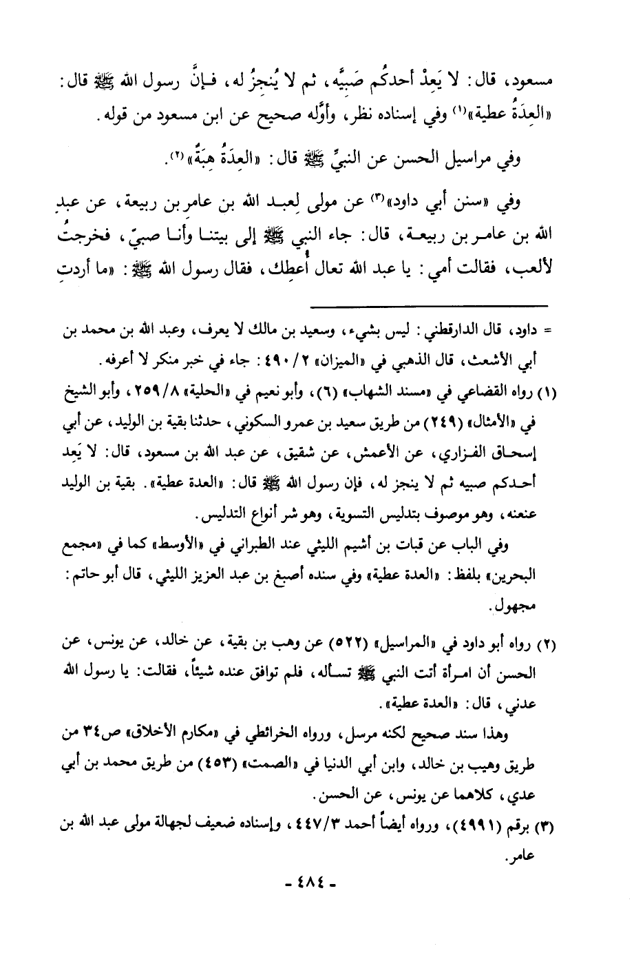 مَسْعُودٍ» قَالَ: «لَا يَعِدْ أَحَدُكُمْ صَبِيَّهُ ثُمَّ لَا يُنْجِزُ لَهُ، فَإِنَّ رَسُولَ اللَّهِ - صَلَّى اللَّهُ عَلَيْهِ وَسَلَّمَ - قَالَ: الْعِدَةُ عَطِيَّةٌ» وَفِي إِسْنَادِهِ نَظَرٌ، وَأَوَّلُهُ صَحِيحٌ عَنِ ابْنِ مَسْعُودٍ مِنْ قَوْلِهِ. وَفِي مَرَاسِيلِ الْحَسَنِ عَنِ النَّبِيِّ - صَلَّى اللَّهُ عَلَيْهِ وَسَلَّمَ - قَالَ: «الْعِدَةُ هِبَةٌ» . وَفِي " سُنَنِ أَبِي دَاوُدَ " عَنْ مَوْلًى لِعَبْدِ اللَّهِ بْنِ عَامِرِ بْنِ رَبِيعَةَ، عَنْ عَبْدِ اللَّهِ بْنِ عَامِرِ بْنِ رَبِيعَةَ، قَالَ: «جَاءَ النَّبِيُّ - صَلَّى اللَّهُ عَلَيْهِ وَسَلَّمَ - إِلَى بَيْتِنَا وَأَنَا صَبِيٌّ، فَخَرَجْتُ لِأَلْعَبَ، فَقَالَتْ أُمِّي: يَا عَبْدَ اللَّهِ تَعَالَ أُعْطِكَ، فَقَالَ رَسُولُ اللَّهِ - صَلَّى اللَّهُ عَلَيْهِ وَسَلَّمَ -: مَا أَرَدْتِ