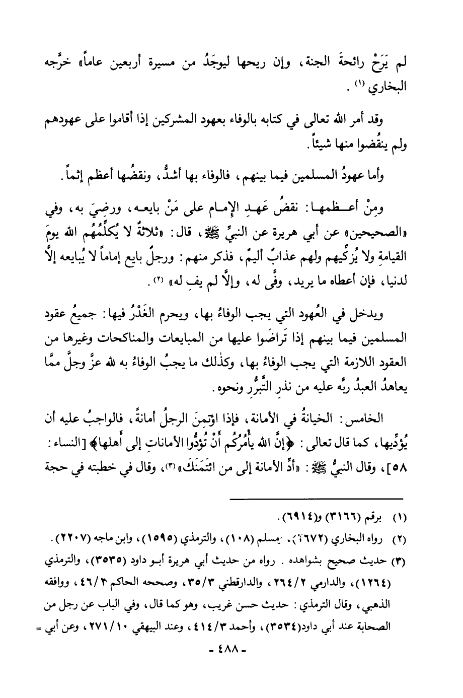 لَمْ يَرَحْ رَائِحَةَ الْجَنَّةِ، وَإِنَّ رِيحَهَا لَيُوجَدُ مِنْ مَسِيرَةِ أَرْبَعِينَ عَامًا» خَرَّجَهُ الْبُخَارِيُّ. وَقَدْ أَمَرَ اللَّهُ تَعَالَى فِي كِتَابِهِ بِالْوَفَاءِ بِعُهُودِ الْمُشْرِكِينَ إِذَا أَقَامُوا عَلَى عُهُودِهِمْ وَلَمْ يَنْقُضُوا مِنْهَا شَيْئًا. وَأَمَّا عُهُودُ الْمُسْلِمِينَ فِيمَا بَيْنَهُمْ، فَالْوَفَاءُ بِهَا أَشَدُّ، وَنَقْضُهَا أَعْظَمُ إِثْمًا. وَمِنْ أَعْظَمِهَا: نَقْضُ عَهْدِ الْإِمَامِ عَلَى مَنْ تَابَعَهُ، وَرَضِيَ بِهِ، وَفِي " الصَّحِيحَيْنِ " عَنْ أَبِي هُرَيْرَةَ عَنِ النَّبِيِّ - صَلَّى اللَّهُ عَلَيْهِ وَسَلَّمَ -، قَالَ: «ثَلَاثَةٌ لَا يُكَلِّمُهُمُ اللَّهُ يَوْمَ الْقِيَامَةِ وَلَا يُزَكِّيهِمْ وَلَهُمْ عَذَابٌ أَلِيمٌ، فَذَكَرَ مِنْهُمْ: وَرَجُلٌ بَايَعَ إِمَامًا لَا يُبَايِعُهُ إِلَّا لِدُنْيَا، فَإِنْ أَعْطَاهُ مَا يُرِيدُ وَفَّى لَهُ، وَإِلَّا لَمْ يَفِ لَهُ» . وَيَدْخُلُ فِي الْعُهُودِ الَّتِي يَجِبُ الْوَفَاءُ بِهَا، وَيَحْرُمُ الْغَدْرُ فِيهَا: جَمِيعُ عُقُودِ الْمُسْلِمِينَ فِيمَا بَيْنَهُمْ إِذَا تَرَاضَوْا عَلَيْهَا مِنَ الْمُبَايَعَاتِ وَالْمُنَاكَحَاتِ وَغَيْرِهَا مِنَ الْعُقُودِ اللَّازِمَةِ الَّتِي يَجِبُ الْوَفَاءُ بِهَا، وَكَذَلِكَ مَا يَجِبُ الْوَفَاءُ بِهِ لِلَّهِ عَزَّ وَجَلَّ مِمَّا يُعَاهِدُ الْعَبْدُ رَبَّهُ عَلَيْهِ مِنْ نَذْرِ التَّبَرُّرِ وَنَحْوِهِ.