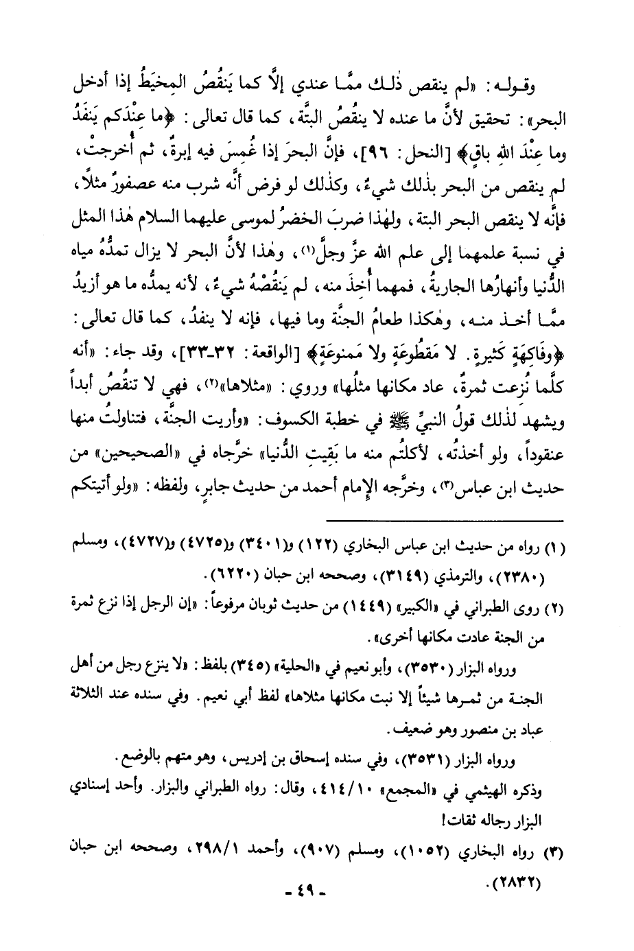 وَقَوْلُهُ: " «لَمْ يَنْقُصْ ذَلِكَ مِمَّا عِنْدِي إِلَّا كَمَا يَنْقُصُ الْمِخْيَطُ إِذَا أُدْخِلَ الْبَحْرَ» " تَحْقِيقٌ لِأَنَّ مَا عِنْدَهُ لَا يَنْقُصُ الْبَتَّةَ، كَمَا قَالَ تَعَالَى: {مَا عِنْدَكُمْ يَنْفَدُ وَمَا عِنْدَ اللَّهِ بَاقٍ} [النحل: 96] [النَّحْلِ: 96] ، فَإِنَّ الْبَحْرَ إِذَا غُمِسَ فِيهِ إِبْرَةٌ، ثُمَّ أُخْرِجَتْ لَمْ يَنْقُصْ مِنَ الْبَحْرِ بِذَلِكَ شَيْءٌ، وَكَذَلِكَ لَوْ فُرِضَ أَنَّهُ شَرِبَ مِنْهُ عُصْفُورٌ مَثَلًا، فَإِنَّهُ لَا يَنْقُصُ الْبَحْرَ الْبَتَّةَ، وَلِهَذَا ضَرَبَ الْخَضِرُ لِمُوسَى عَلَيْهِمَا السَّلَامُ هَذَا الْمَثَلَ فِي نِسْبَةِ عِلْمِهِمَا إِلَى عِلْمِ اللَّهِ عَزَّ وَجَلَّ، وَهَذَا لِأَنَّ الْبَحْرَ لَا يَزَالُ تَمُدُّهُ مِيَاهُ الدُّنْيَا وَأَنْهَارُهَا الْجَارِيَةُ، فَمَهْمَا أُخِذَ مِنْهُ لَمْ يَنْقُصْهُ شَيْءٌ، لِأَنَّهُ يَمُدُّهُ مَا هُوَ أَزْيَدُ مِمَّا أُخِذَ مِنْهُ، وَهَكَذَا طَعَامُ الْجَنَّةِ وَمَا فِيهَا، فَإِنَّهُ لَا يَنْفَدُ، كَمَا قَالَ تَعَالَى: {وَفَاكِهَةٍ كَثِيرَةٍ - لَا مَقْطُوعَةٍ وَلَا مَمْنُوعَةٍ} [الواقعة: 32 - 33] [الْوَاقِعَةِ: 32 - 33] ، وَقَدْ جَاءَ: " أَنَّهُ كُلَّمَا نُزِعَتْ ثَمَرَةٌ، عَادَ مَكَانَهَا مِثْلُهَا " وَرُوِيَ " مِثْلَاهَا "، فَهِيَ لَا تَنْقُصُ أَبَدًا وَيَشْهَدُ لِذَلِكَ «قَوْلُ النَّبِيِّ صَلَّى اللَّهُ عَلَيْهِ وَسَلَّمَ فِي خُطْبَةِ الْكُسُوفِ: " وَأُرِيتُ الْجَنَّةَ، فَتَنَاوَلْتُ مِنْهَا عُنْقُودًا، وَلَوْ أَخَذْتُهُ، لَأَكَلْتُمْ مِنْهُ مَا بَقِيَتِ الدُّنْيَا» " خَرَّجَاهُ فِي " الصَّحِيحَيْنِ " مِنْ حَدِيثِ ابْنِ عَبَّاسٍ، وَخَرَّجَهُ الْإِمَامُ أَحْمَدُ مِنْ حَدِيثِ جَابِرٍ، وَلَفْظُهُ: " «وَلَوْ أَتَيْتُكُمْ