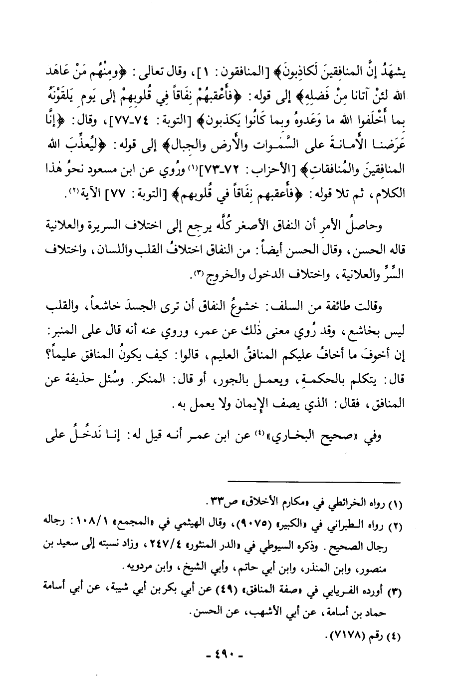 {وَاللَّهُ يَشْهَدُ إِنَّ الْمُنَافِقِينَ لَكَاذِبُونَ} [المنافقون: 1] [الْمُنَافِقُونَ: 1] ، وَقَالَ تَعَالَى: {وَمِنْهُمْ مَنْ عَاهَدَ اللَّهَ لَئِنْ آتَانَا مِنْ فَضْلِهِ} [التوبة: 75] إِلَى قَوْلِهِ: {فَأَعْقَبَهُمْ نِقَاقًا فِي قُلُوبِهِمْ إِلَى يَوْمِ يَلْقَوْنَهُ بِمَا أَخْلَفُوا اللَّهَ مَا وَعَدُوهُ وَبِمَا كَانُوا يَكْذِبُونَ} [التوبة: 77] [التَّوْبَةِ: 74 - 77] ، وَقَالَ: {إِنَّا عَرَضْنَا الْأَمَانَةَ عَلَى السَّمَاوَاتِ وَالْأَرْضِ وَالْجِبَالِ} [الأحزاب: 72] الْأَحْزَابِ إِلَى قَوْلِهِ: {لِيُعَذِّبَ اللَّهُ الْمُنَافِقِينَ وَالْمُنَافِقَاتِ} [الأحزاب: 73] [الْأَحْزَابِ: 72 - 73] وَرُوِيَ عَنِ ابْنِ مَسْعُودٍ نَحْوُ هَذَا الْكَلَامِ، ثُمَّ تَلَا قَوْلَهُ: {فَأَعْقَبَهُمْ نِفَاقًا فِي قُلُوبِهِمْ} [التوبة: 77] [التَّوْبَةِ: 77] الْآيَةَ. وَحَاصِلُ الْأَمْرِ أَنَّ النِّفَاقَ الْأَصْغَرَ كُلَّهُ يَرْجِعُ إِلَى اخْتِلَافِ السَّرِيرَةِ وَالْعَلَانِيَةِ، قَالَهُ الْحَسَنُ. وَقَالَ الْحَسَنُ أَيْضًا: مِنَ النِّفَاقِ اخْتِلَافُ الْقَلْبِ وَاللِّسَانِ، وَاخْتِلَافُ السِّرِّ وَالْعَلَانِيَةِ، وَاخْتِلَافُ الدُّخُولِ وَالْخُرُوجِ. وَقَالَتْ طَائِفَةٌ مِنَ السَّلَفِ: خُشُوعُ النِّفَاقِ أَنْ تَرَى الْجَسَدَ خَاشِعًا، وَالْقَلْبَ لَيْسَ بِخَاشِعٍ، وَقَدْ رُوِيَ مَعْنَى ذَلِكَ عَنْ عُمَرَ، وَرُوِيَ عَنْهُ أَنَّهُ قَالَ عَلَى الْمِنْبَرِ: إِنَّ أَخْوَفَ مَا أَخَافُ عَلَيْكُمُ الْمُنَافِقُ الْعَلِيمُ، قَالُوا: كَيْفَ يَكُونُ الْمُنَافِقُ عَلِيمًا؟ قَالَ: يَتَكَلَّمُ بِالْحِكْمَةِ، وَيَعْمَلُ بِالْجَوْرِ، أَوْ قَالَ: الْمُنْكَرُ. وَسُئِلَ حُذَيْفَةُ عَنِ الْمُنَافِقِ، فَقَالَ: الَّذِي يَصِفُ الْإِيمَانَ وَلَا يَعْمَلُ بِهِ. وَفِي " صَحِيحِ الْبَخَارِيِّ " عَنِ ابْنِ عُمَرَ أَنَّهُ قِيلَ لَهُ: إِنَّا نَدْخُلُ عَلَى
