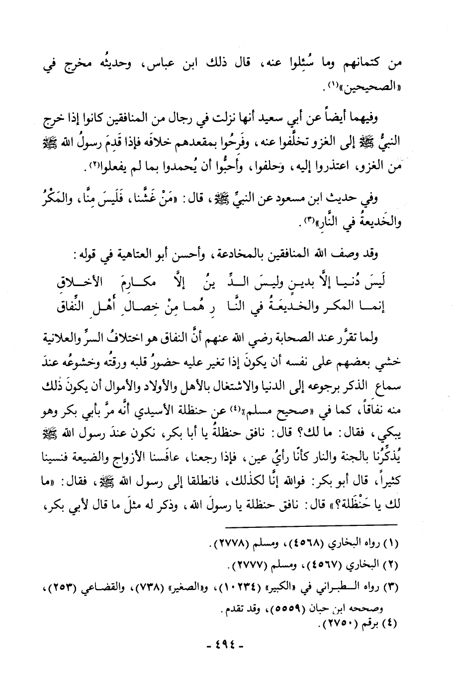 وَلَمَّا تَقَرَّرَ عِنْدَ الصَّحَابَةِ رَضِيَ اللَّهُ عَنْهُمْ أَنَّ النِّفَاقَ هُوَ اخْتِلَافُ السِّرِّ وَالْعَلَانِيَةِ خَشِيَ بَعْضُهُمْ عَلَى نَفْسِهِ أَنْ يَكُونَ إِذَا تَغَيَّرَ عَلَيْهِ حُضُورُ قَلْبِهِ وَرِقَّتُهُ وَخُشُوعُهُ عِنْدَ سَمَاعِ الذِّكْرِ بِرُجُوعِهِ إِلَى الدُّنْيَا وَالِاشْتِغَالِ بِالْأَهْلِ وَالْأَوْلَادِ وَالْأَمْوَالِ أَنْ يَكُونَ ذَلِكَ مِنْهُ نِفَاقًا، كَمَا فِي " صَحِيحِ مُسْلِمٍ " «عَنْ حَنْظَلَةَ الْأُسَيْدِيِّ أَنَّهُ مَرَّ بِأَبِي بَكْرٍ وَهُوَ يَبْكِي، فَقَالَ: مَا لَكَ؟ قَالَ: نَافَقَ حَنْظَلَةُ يَا أَبَا بَكْرٍ، نَكُونُ عِنْدَ رَسُولِ اللَّهِ - صَلَّى اللَّهُ عَلَيْهِ وَسَلَّمَ - يُذَكِّرُنَا بِالْجَنَّةِ وَالنَّارِ كَأَنَّا رَأْيَ عَيْنٍ، فَإِذَا رَجَعْنَا، عَافَسْنَا الْأَزْوَاجَ وَالصِّبْيَةَ فَنَسِينَا كَثِيرًا، قَالَ أَبُو بَكْرٍ: فَوَاللَّهِ إِنَّا لَكَذَلِكَ، فَانْطَلَقَا إِلَى رَسُولِ اللَّهِ - صَلَّى اللَّهُ عَلَيْهِ وَسَلَّمَ -، فَقَالَ: مَا لَكَ يَا حَنْظَلَةُ؟ قَالَ: نَافَقَ حَنْظَلَةُ يَا رَسُولَ اللَّهِ، وَذَكَرَ لَهُ مِثْلَ مَا قَالَ لِأَبِي بَكْرٍ،