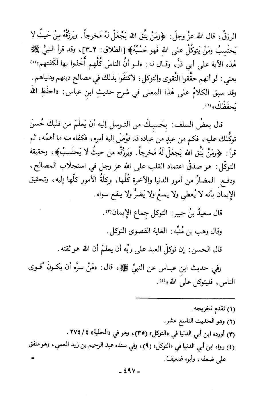 الرِّزْقُ، قَالَ اللَّهُ عَزَّ وَجَلَّ: {وَمَنْ يَتَّقِ اللَّهَ يَجْعَلْ لَهُ مَخْرَجًا - وَيَرْزُقْهُ مِنْ حَيْثُ لَا يَحْتَسِبُ وَمَنْ يَتَوَكَّلْ عَلَى اللَّهِ فَهُوَ حَسْبُهُ} [الطلاق: 2 - 3] [الطَّلَاقِ: 2 - 3] ، وَقَدْ قَرَأَ النَّبِيُّ - صَلَّى اللَّهُ عَلَيْهِ وَسَلَّمَ - هَذِهِ الْآيَةَ عَلَى أَبِي ذَرٍّ، وَقَالَ لَهُ: لَوْ أَنَّ النَّاسَ كُلَّهُمْ أَخَذُوا بِهَا لَكَفَتْهُمْ يَعْنِي: لَوْ حَقَّقُوا التَّقْوَى وَالتَّوَكُّلَ؛ لَاكْتَفَوْا بِذَلِكَ فِي مَصَالِحِ دِينِهِمْ وَدُنْيَاهُمْ. وَقَدْ سَبَقَ الْكَلَامُ عَلَى هَذَا الْمَعْنَى فِي شَرْحِ حَدِيثِ ابْنِ عَبَّاسٍ: «احْفَظِ اللَّهَ يَحْفَظْكَ» . قَالَ بَعْضُ السَّلَفِ: بِحَسْبِكَ مِنَ التَّوَسُّلِ إِلَيْهِ أَنْ يَعْلَمَ مِنْ قَلْبِكَ حُسْنَ تَوَكُّلِكَ عَلَيْهِ، فَكَمْ مِنْ عَبْدٍ مِنْ عِبَادِهِ قَدْ فَوَّضَ إِلَيْهِ أَمْرَهُ، فَكَفَاهُ مِنْهُ مَا أَهَمَّهُ، ثُمَّ قَرَأَ: {وَمَنْ يَتَّقِ اللَّهَ يَجْعَلْ لَهُ مَخْرَجًا - وَيَرْزُقْهُ مِنْ حَيْثُ لَا يَحْتَسِبُ} [الطلاق: 2 - 3] وَحَقِيقَةُ التَّوَكُّلِ: هُوَ صِدْقُ اعْتِمَادِ الْقَلْبِ عَلَى اللَّهِ عَزَّ وَجَلَّ فِي اسْتِجْلَابِ الْمَصَالِحِ، وَدَفْعِ الْمَضَارِّ مِنْ أُمُورِ الدُّنْيَا وَالْآخِرَةِ كُلِّهَا، وَكِلَةُ الْأُمُورِ كُلِّهَا إِلَيْهِ، وَتَحْقِيقُ الْإِيمَانِ بِأَنَّهُ لَا يُعْطِي وَلَا يَمْنَعُ وَلَا يَضُرُّ وَلَا يَنْفَعُ سِوَاهُ. قَالَ سَعِيدُ بْنُ جُبَيْرٍ: التَّوَكُّلُ جِمَاعُ الْإِيمَانِ. وَقَالَ وَهْبُ بْنُ مُنَبِّهٍ: الْغَايَةُ الْقُصْوَى التَّوَكُّلُ. قَالَ الْحَسَنُ: إِنَّ تَوَكُّلَ الْعَبْدِ عَلَى رَبِّهِ أَنْ يَعْلَمَ أَنَّ اللَّهَ هُوَ ثِقَتُهُ. وَفِي حَدِيثِ ابْنِ عَبَّاسٍ عَنِ النَّبِيِّ - صَلَّى اللَّهُ عَلَيْهِ وَسَلَّمَ -، قَالَ: «مَنْ سَرَّهُ أَنْ يَكُونَ أَقْوَى النَّاسِ، فَلْيَتَوَكَّلْ عَلَى اللَّهِ» .