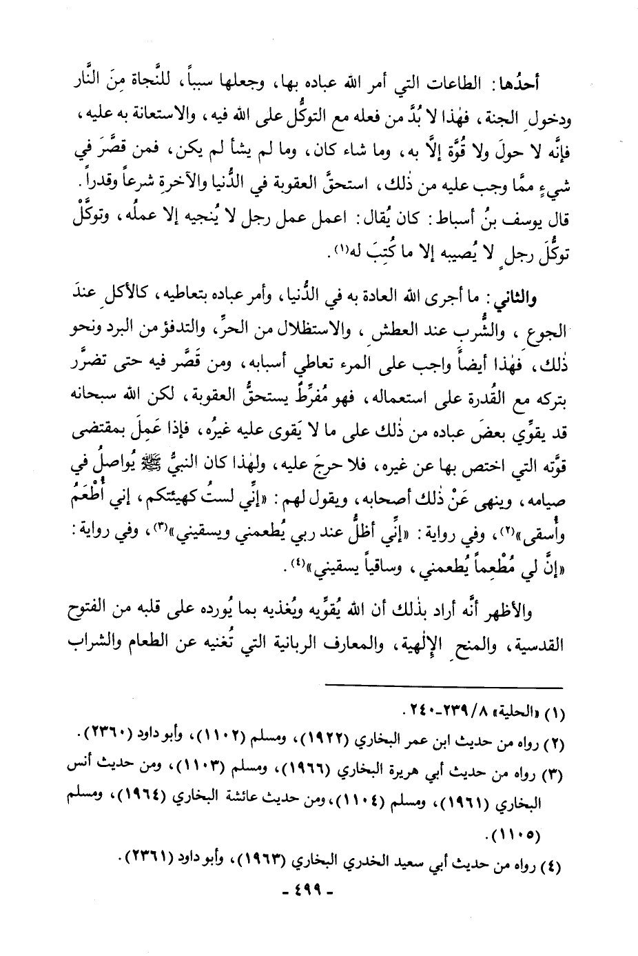 أَحَدُهَا: الطَّاعَاتُ الَّتِي أَمَرَ اللَّهُ عِبَادَهُ بِهَا، وَجَعَلَهَا سَبَبًا، لِلنَّجَاةِ مِنَ النَّارِ وَدُخُولِ الْجَنَّةِ، فَهَذَا لَابُدَّ مِنْ فِعْلِهِ مَعَ التَّوَكُّلِ عَلَى اللَّهِ فِيهِ، وَالِاسْتِعَانَةِ بِهِ عَلَيْهِ، فَإِنَّهُ لَا حَوْلَ وَلَا قُوَّةَ إِلَّا بِهِ، وَمَا شَاءَ كَانَ وَمَا لَمْ يَشَأْ لَمْ يَكُنْ، فَمَنْ قَصَّرَ فِي شَيْءٍ مِمَّا وَجَبَ عَلَيْهِ مِنْ ذَلِكَ، اسْتَحَقَّ الْعُقُوبَةَ فِي الدُّنْيَا وَالْآخِرَةِ شَرْعًا وَقَدَرًا. قَالَ يُوسُفُ بْنُ أَسْبَاطٍ: كَانَ يُقَالُ: اعْمَلْ عَمَلَ رَجُلٍ لَا يُنْجِيهِ إِلَّا عَمَلُهُ، وَتَوَكَّلْ تَوَكُّلَ رَجُلٍ لَا يُصِيبُهُ إِلَّا مَا كُتِبَ لَهُ. وَالثَّانِي: مَا أَجْرَى اللَّهُ الْعَادَةَ بِهِ فِي الدُّنْيَا، وَأَمَرَ عِبَادَهُ بِتَعَاطِيهِ، كَالْأَكْلِ عِنْدَ الْجُوعِ، وَالشُّرْبِ عِنْدَ الْعَطَشِ، وَالِاسْتِظْلَالِ مِنَ الْحَرِّ، وَالتَّدَفُّؤِ مِنَ الْبَرْدِ، وَنَحْوِ ذَلِكَ، فَهَذَا أَيْضًا وَاجِبٌ عَلَى الْمَرْءِ تَعَاطِي أَسْبَابِهِ، وَمَنْ قَصَّرَ فِيهِ حَتَّى تَضَرَّرَ بِتَرْكِهِ مَعَ الْقُدْرَةِ عَلَى اسْتِعْمَالِهِ، فَهُوَ مُفَرِّطٌ يَسْتَحِقُّ الْعُقُوبَةَ، لَكِنَّ اللَّهَ سُبْحَانَهُ قَدْ يُقَوِّي بَعْضَ عِبَادِهِ مِنْ ذَلِكَ عَلَى مَا لَا يَقْوَى عَلَيْهِ غَيْرُهُ، فَإِذَا عَمِلَ بِمُقْتَضَى قُوَّتِهِ الَّتِي اخْتُصَّ بِهَا عَنْ غَيْرِهِ فَلَا حَرَجَ عَلَيْهِ، وَلِهَذَا كَانَ النَّبِيُّ - صَلَّى اللَّهُ عَلَيْهِ وَسَلَّمَ - يُوَاصِلُ فِي صِيَامِهِ وَيَنْهَى عَنْ ذَلِكَ أَصْحَابَهُ وَيَقُولُ لَهُمْ: «إِنِّي لَسْتُ كَهَيْئَتِكُمْ، إِنِّي أُطْعَمُ وَأُسْقَى» ، وَفِي رِوَايَةٍ: «إِنِّي أَظَلُّ عِنْدَ رَبِّي يُطْعِمُنِي وَيَسْقِينِي» ، وَفِي رِوَايَةٍ: «إِنَّ لِي مُطْعِمًا يُطْعِمُنِي، وَسَاقِيًا يَسْقِينِي» . وَالْأَظْهَرُ أَنَّهُ أَرَادَ بِذَلِكَ أَنَّ اللَّهَ يَقُوتُهُ وَيُغَذِّيهِ بِمَا يُورِدُهُ عَلَى قَلْبِهِ مِنَ الْفُتُوحِ الْقُدْسِيَّةِ، وَالْمِنَحِ الْإِلَهِيَّةِ، وَالْمَعَارِفِ الرَّبَّانِيَّةِ الَّتِي تُغْنِيهِ عَنِ الطَّعَامِ وَالشَّرَابِ