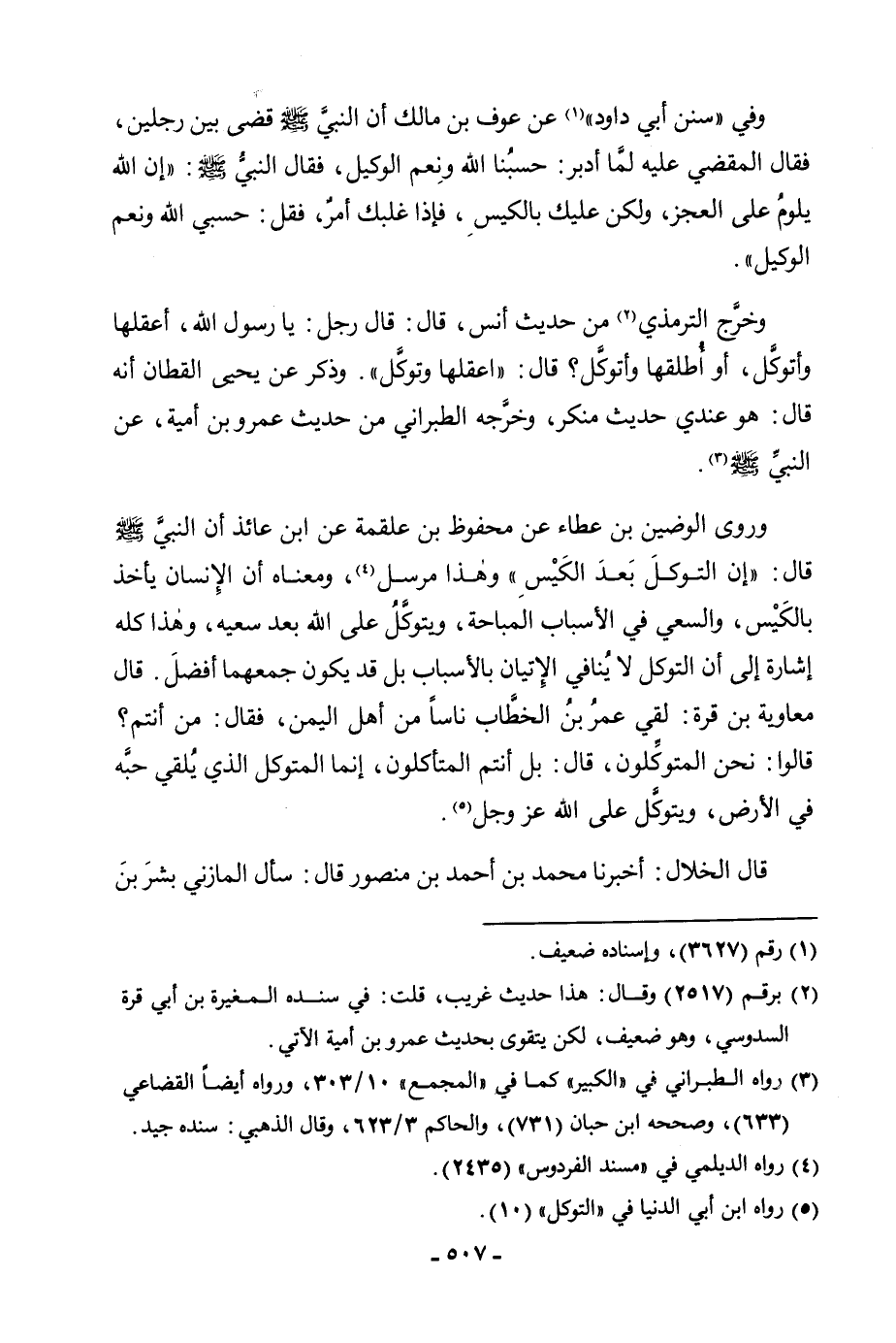 وَفِي " سُنَنِ أَبِي دَاوُدَ " وَعَنْ عَوْفِ بْنِ مَالِكٍ «أَنَّ النَّبِيَّ - صَلَّى اللَّهُ عَلَيْهِ وَسَلَّمَ - قَضَى بَيْنَ رَجُلَيْنِ، فَقَالَ الْمَقْضِيُّ عَلَيْهِ لَمَّا أَدْبَرَ: حَسْبُنَا اللَّهُ وَنِعْمَ الْوَكِيلُ، فَقَالَ النَّبِيُّ - صَلَّى اللَّهُ عَلَيْهِ وَسَلَّمَ -: إِنَّ اللَّهَ يَلُومُ عَلَى الْعَجْزِ، وَلَكِنْ عَلَيْكَ بِالْكَيْسِ، فَإِذَا غَلَبَكَ أَمْرٌ، فَقُلْ حَسْبِيَ اللَّهُ وَنِعْمَ الْوَكِيلُ» . وَخَرَّجَ التِّرْمِذِيُّ مِنْ حَدِيثِ أَنَسٍ، قَالَ: «قَالَ رَجُلٌ: يَا رَسُولَ اللَّهِ، أَعْقِلُهَا وَأَتَوَكَّلُ، أَوْ أُطْلِقُهَا وَأَتَوَكَّلُ؟ قَالَ: اعْقِلْهَا وَتَوَكَّلْ» . وَذُكِرَ عَنْ يَحْيَى الْقَطَّانِ أَنَّهُ قَالَ: هُوَ عِنْدِي حَدِيثٌ مُنْكَرٌ، وَخَرَّجَهُ الطَّبَرَانِيُّ مِنْ حَدِيثِ عَمْرِو بْنِ أُمَيَّةَ، عَنِ النَّبِيِّ - صَلَّى اللَّهُ عَلَيْهِ وَسَلَّمَ -. وَرَوَى الْوَضِينُ بْنُ عَطَاءٍ عَنْ مَحْفُوظِ بْنِ عَلْقَمَةَ عَنِ ابْنِ عَابِدٍ أَنَّ النَّبِيَّ - صَلَّى اللَّهُ عَلَيْهِ وَسَلَّمَ - قَالَ: «إِنَّ التَّوَكُّلَ بَعْدَ الْكَيْسِ» وَهَذَا مُرْسَلٌ، وَمَعْنَاهُ أَنَّ الْإِنْسَانَ يَأْخُذُ بِالْكَيْسِ وَالسَّعْيِ فِي الْأَسْبَابِ الْمُبَاحَةِ، وَيَتَوَكَّلُ عَلَى اللَّهِ بَعْدَ سَعْيِهِ، وَهَذَا كُلُّهُ إِشَارَةٌ إِلَى أَنَّ التَّوَكُّلَ لَا يُنَافِي الْإِتْيَانَ بِالْأَسْبَابِ بَلْ قَدْ يَكُونُ جَمْعُهُمَا أَفْضَلَ. قَالَ مُعَاوِيَةُ بْنُ قُرَّةَ: لَقِيَ عُمَرُ بْنُ الْخَطَّابِ نَاسًا مِنْ أَهْلِ الْيَمَنِ، فَقَالَ: مَنْ أَنْتُمْ؟ قَالُوا: نَحْنُ الْمُتَوَكِّلُونَ، قَالَ: بَلْ أَنْتُمُ الْمُتَأَكِّلُونَ، إِنَّمَا الْمُتَوَكِّلُ الَّذِي يُلْقِي حَبَّهُ فِي الْأَرْضِ، وَيَتَوَكَّلُ عَلَى اللَّهِ عَزَّ وَجَلَّ. قَالَ الْخَلَّالُ: أَخْبَرَنَا مُحَمَّدُ بْنُ أَحْمَدَ بْنِ مَنْصُورٍ قَالَ: سَأَلَ الْمَازِنِيُّ بِشْرَ بْنَ